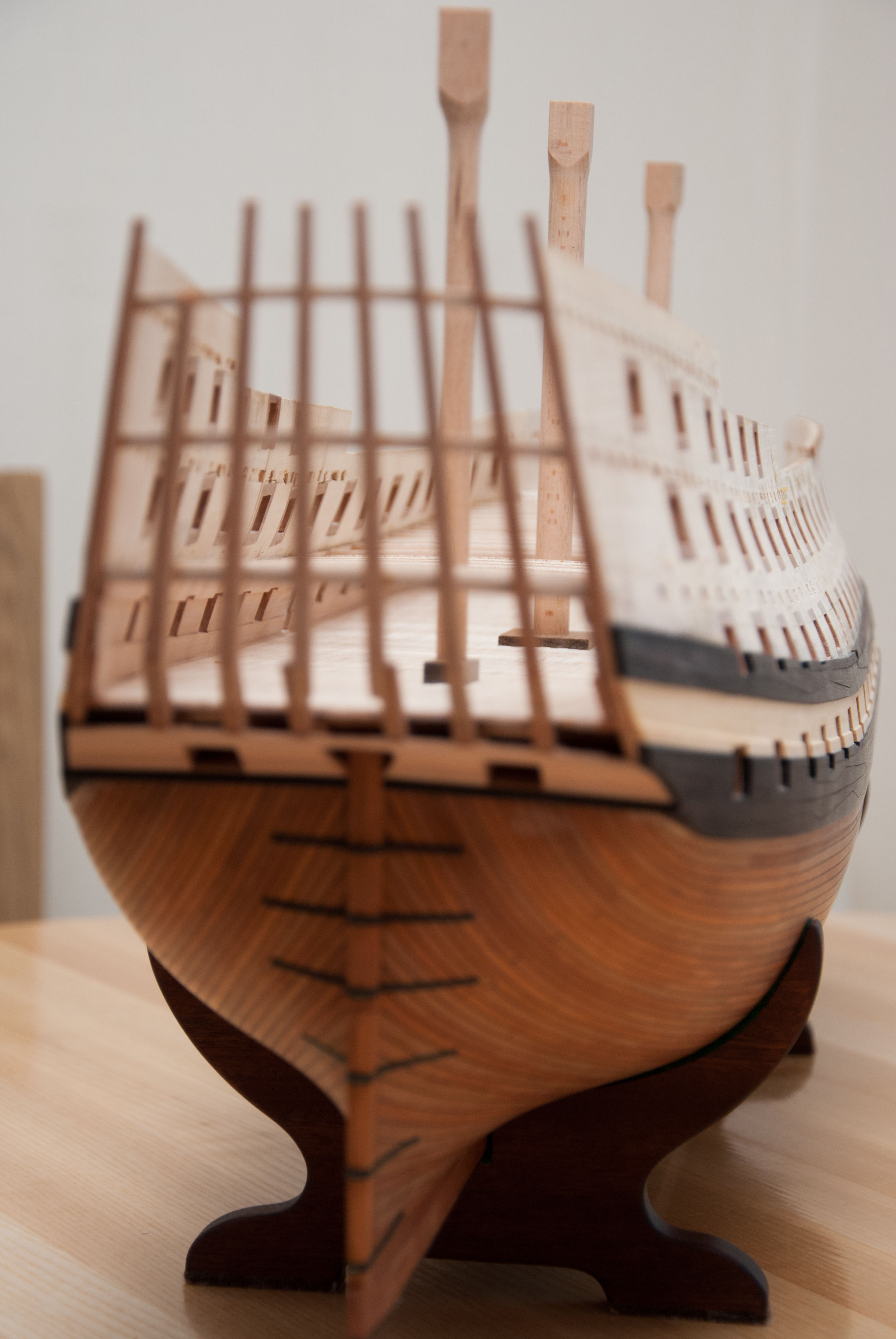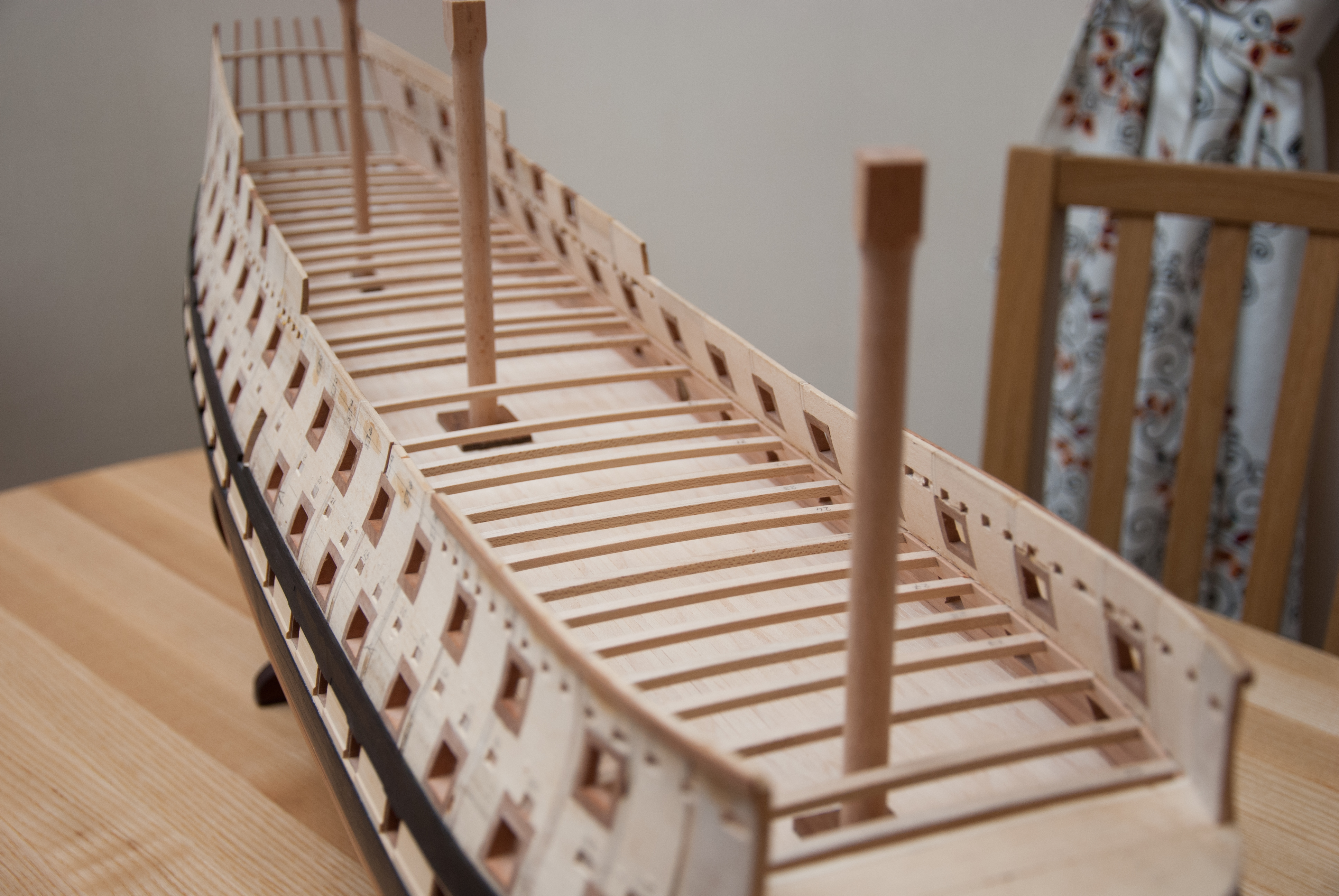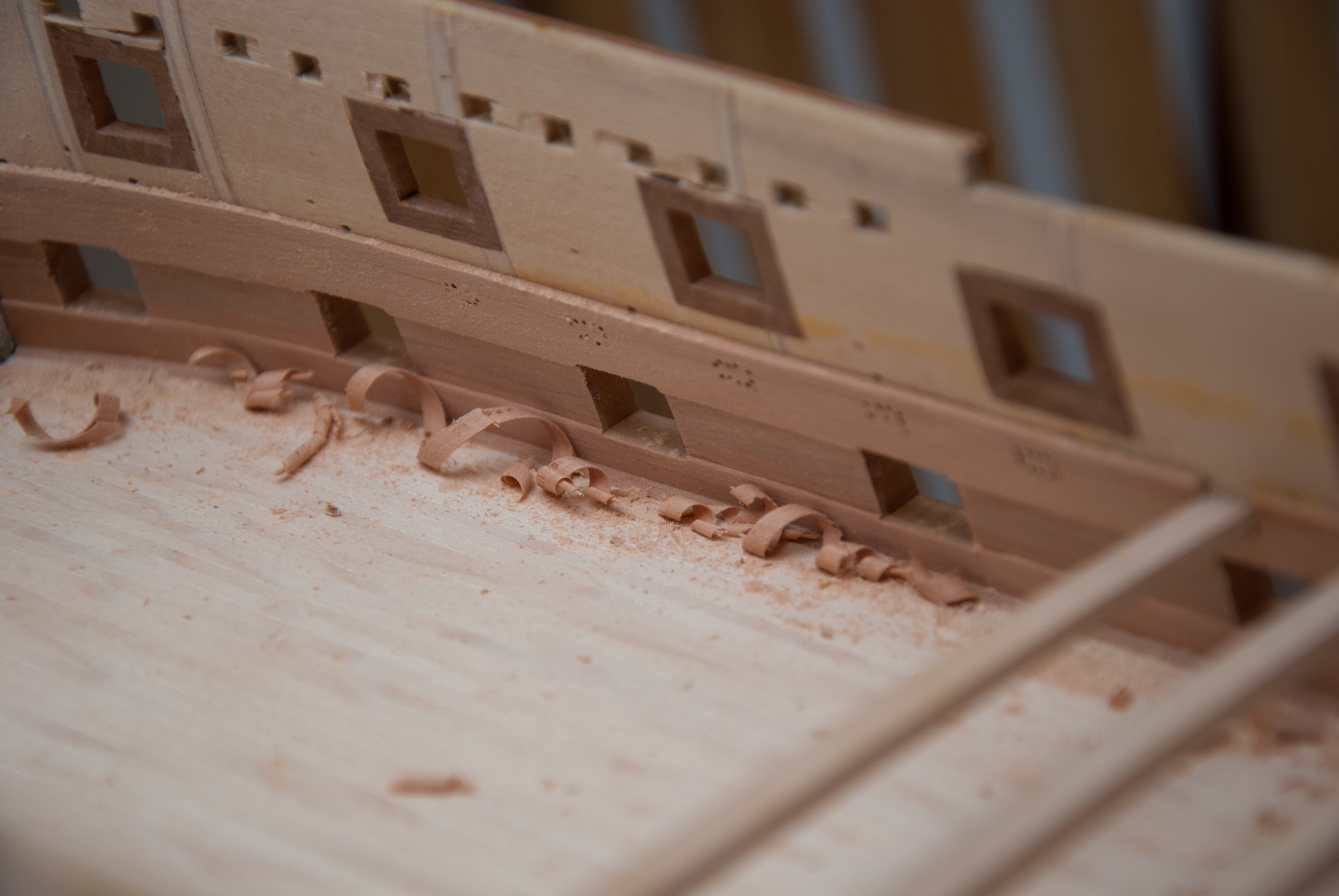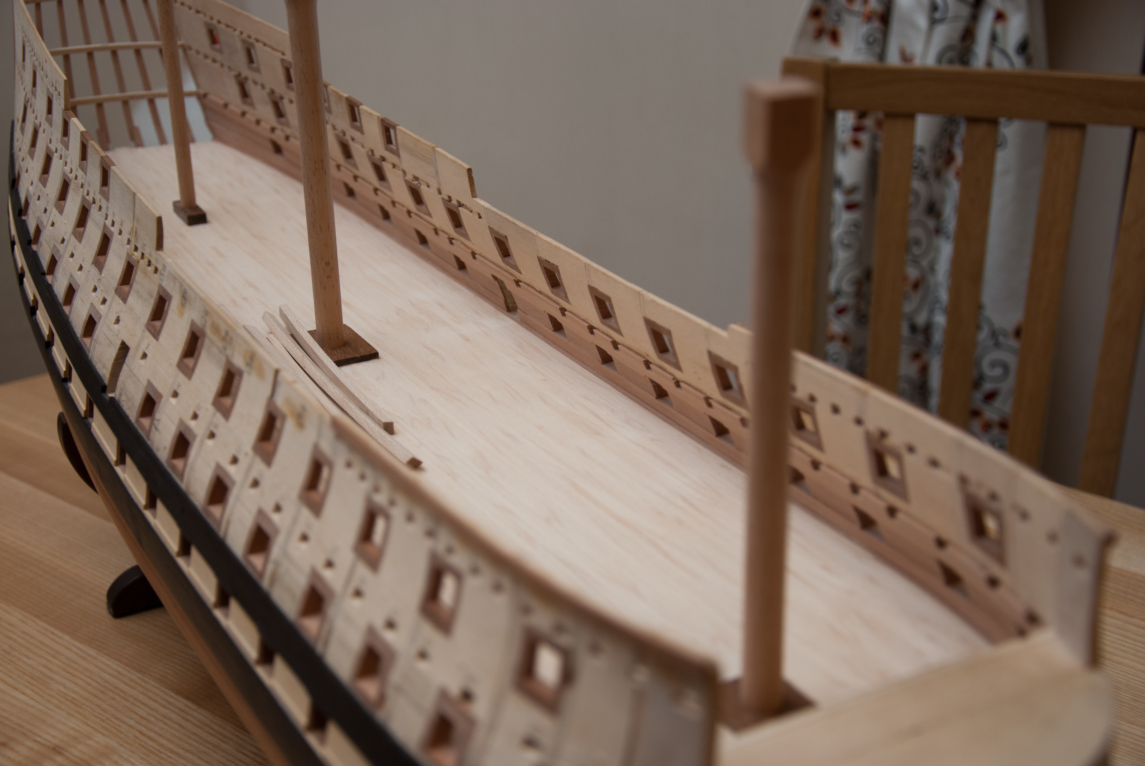 Нижнюю часть обшивки, до порта, делал из одной рейки 1,5 мм толщиной. Между портами по три реечки 3 х 0,8 мм. Затем до следующей палубы две рейки толщиной 1,5 мм. Последнюю рейку сделал намеренно выше уровня следующей палубы, чтобы прорезать в ней проемы под бимсы и уже по установленным бимсам стамеской заподлицо с уровнем палубы снять лишнее с рейки. Пришло время задуматься об орудиях.