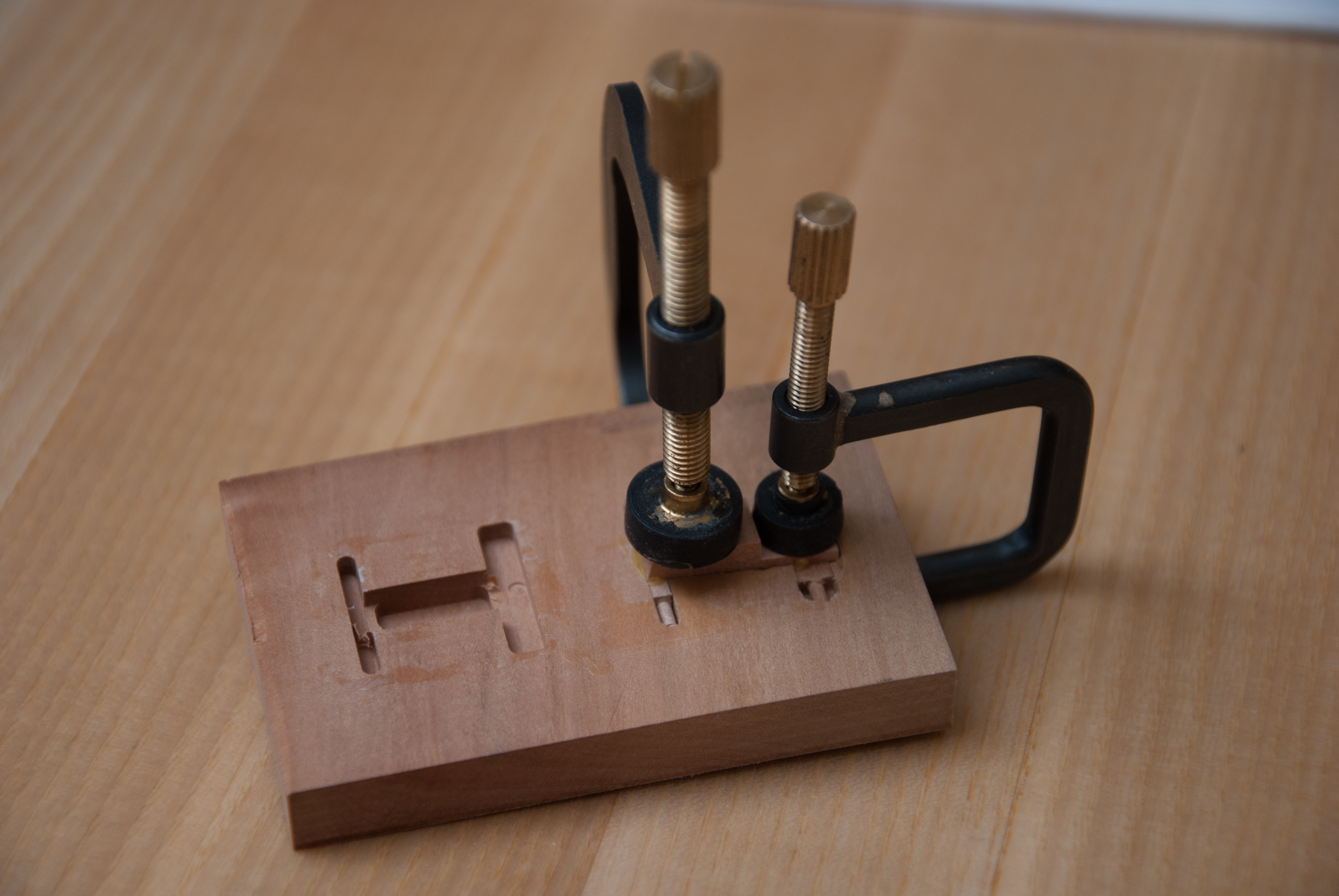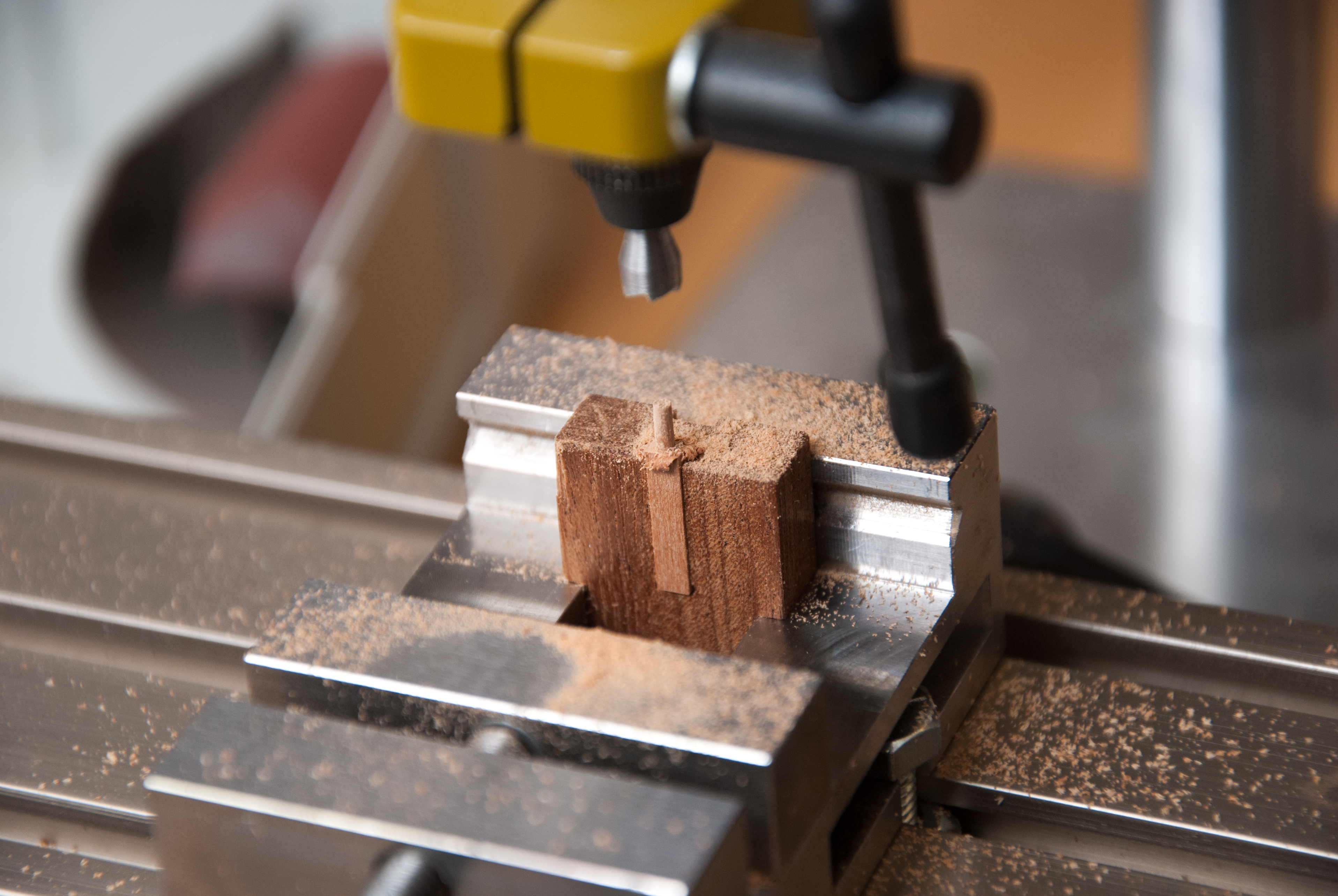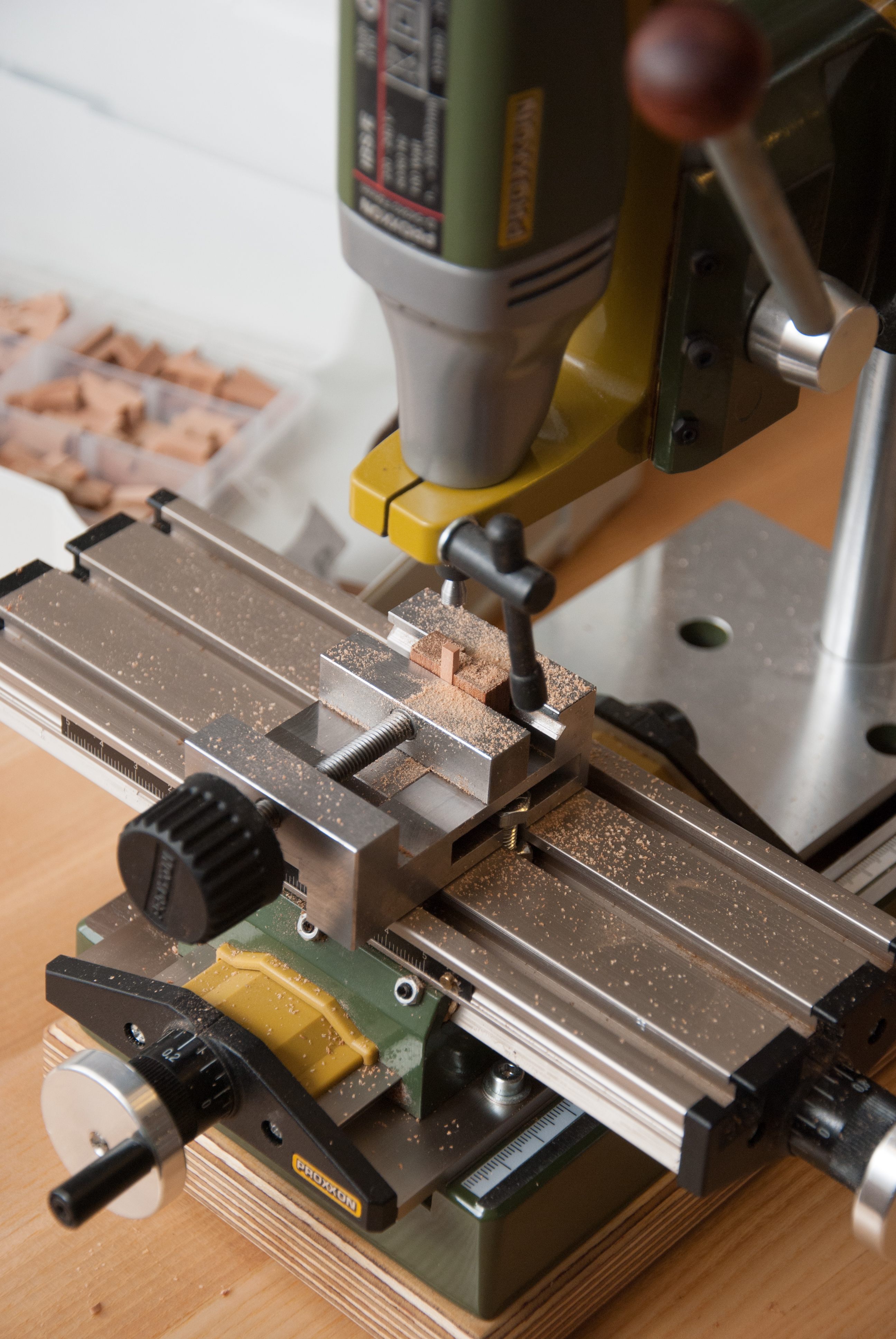 Главный вопрос тут – формирование круглой оси. Насмотревшись на разные варианты получения осей, и сравнив их со своими возможностями, я выбрал для себя следующий способ. Выточил из стали коронки с разными диаметрами – 1,6/1,8/2,0 мм. Посадка на 3 мм. Напильником заточил. Поставил координатный стол с тисками на сверлильную станину и сделал маленький кондуктор, позволяющий плотненько зажимать в одном и том же месте заготовки для осей. Настроил глубину сверления. После этого снял заусенцы.