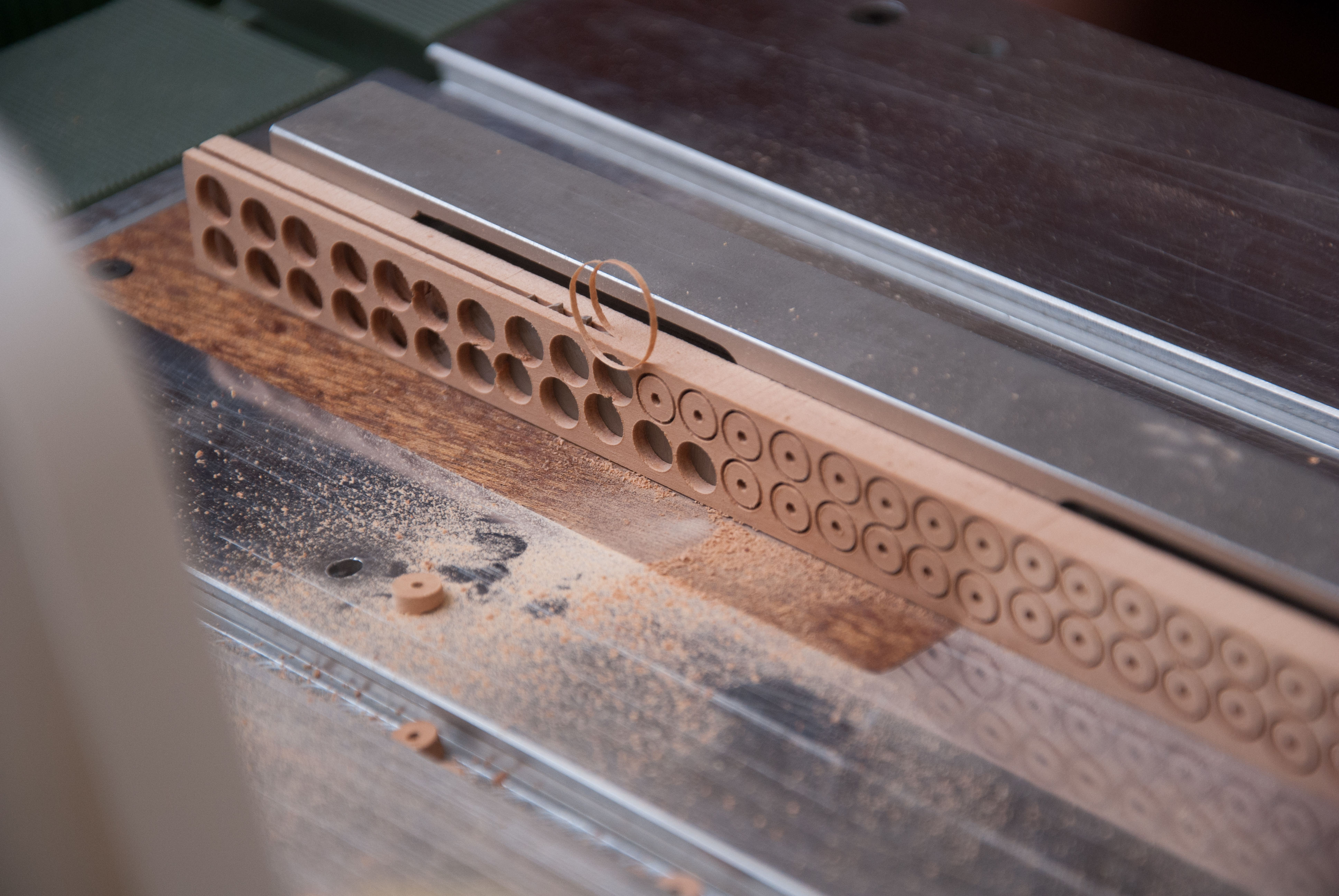 Небольшое отступление. В детстве отец доверял мне изготовление заглушек финишных для своих работ. Я брал несколько кусков древесины одной породы но с разными оттенками и специальным сверлом также сверлил пробки, а потом на циркулялрке отпиливал их. Самое интересное было отпиливание – выскакивание заглушек из заготовки.