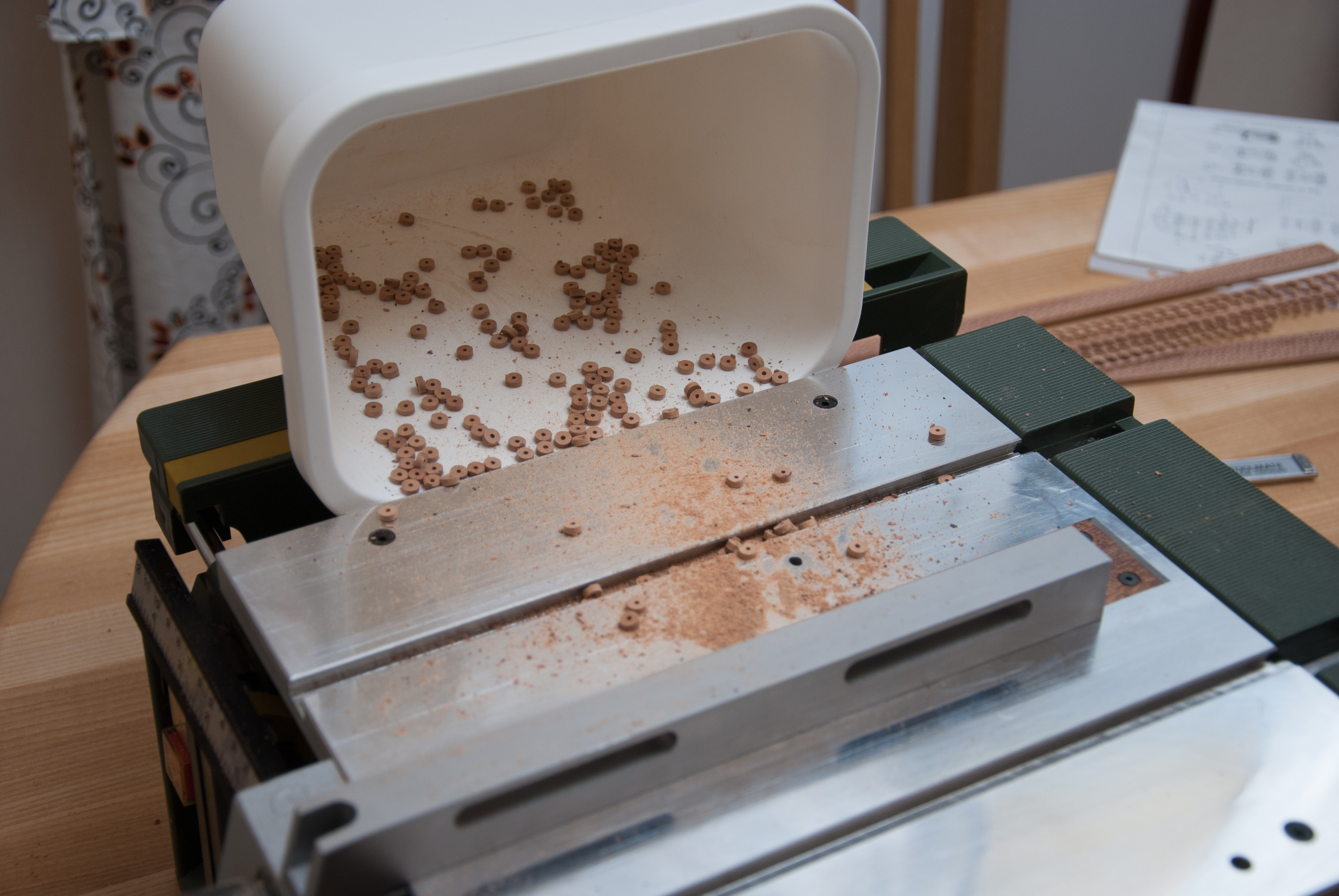 Для улавливания колес взял икеевский контейнер, который я использую как ведро для обрезков и мусора при строительстве модели. Прижал ведерко расширителем стола фета. И погнал. Колеса вылетают как пули. Остается небольшой заусенец, но он легко снимается. В целом геометрия колеса получилась правильной, без задиров.