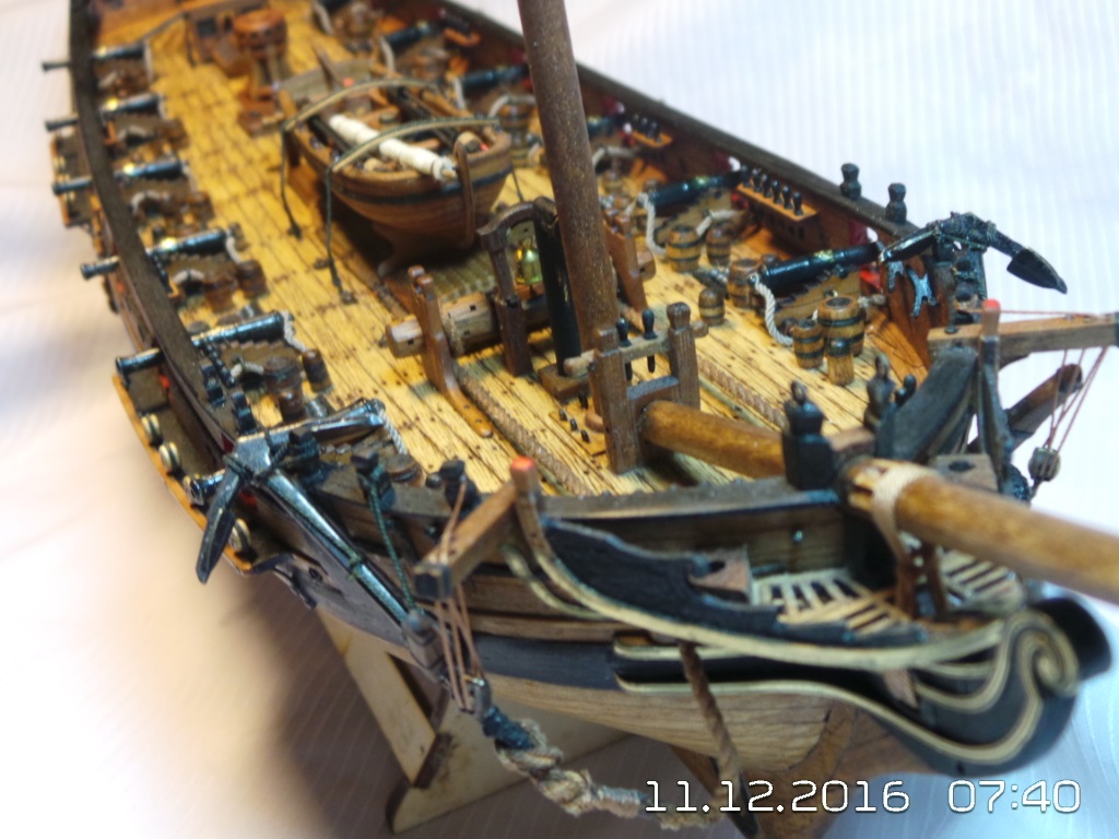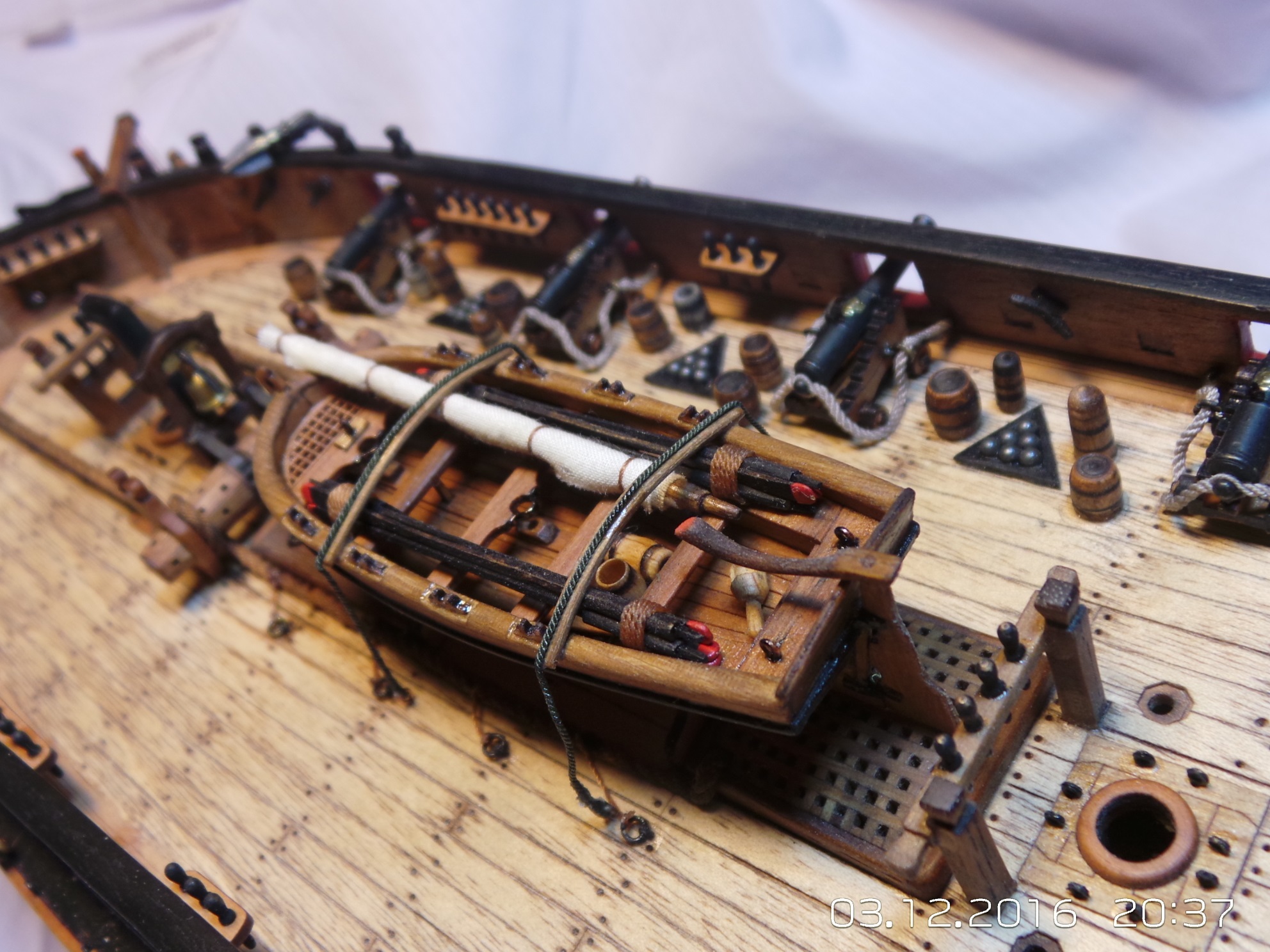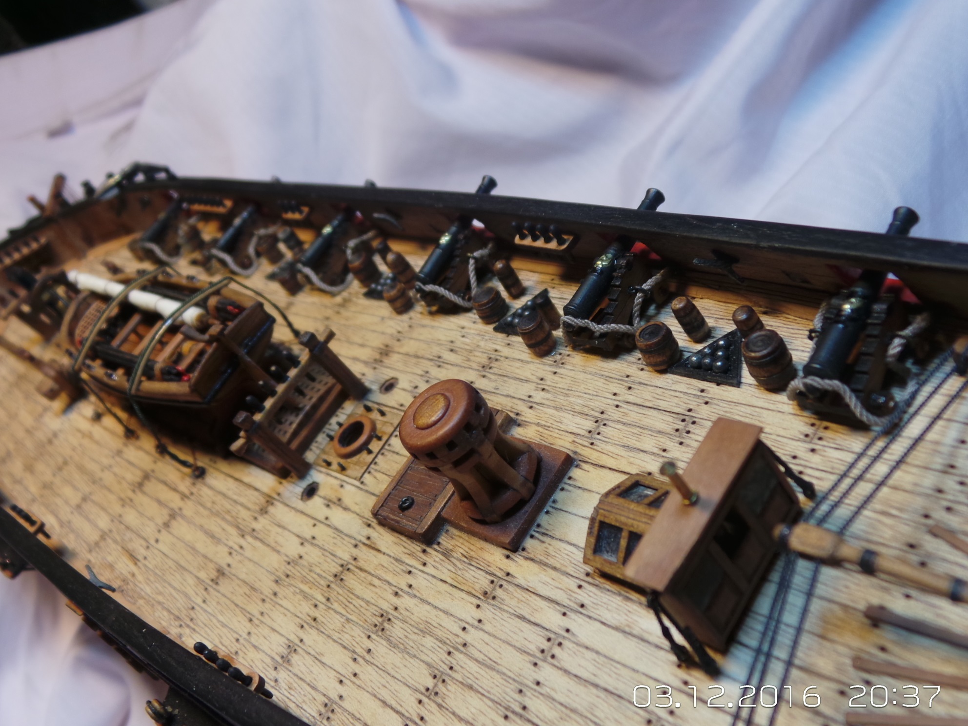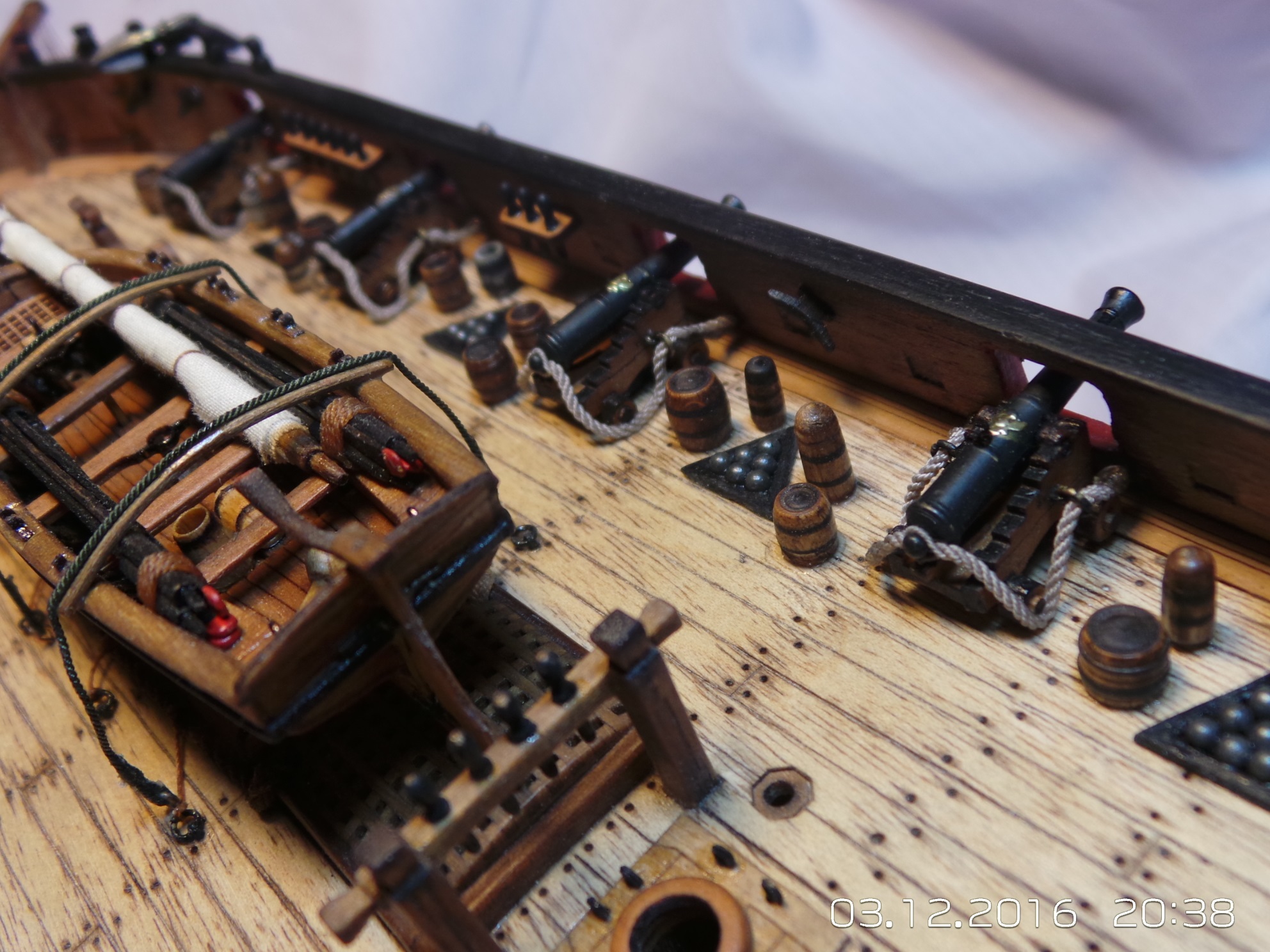 и еще что бросилось в глаза сразу-нагар на торцах пушечных лафетов, парус в шлюпке очень уж ровно смотан- так не бывает -больше похоже на рулон ткани и один виток якорного каната на брашпиле- этого достаточно? Вроде должно быть поболее... Ядра ,вроде как бы, великоваты...в ствол влезают?