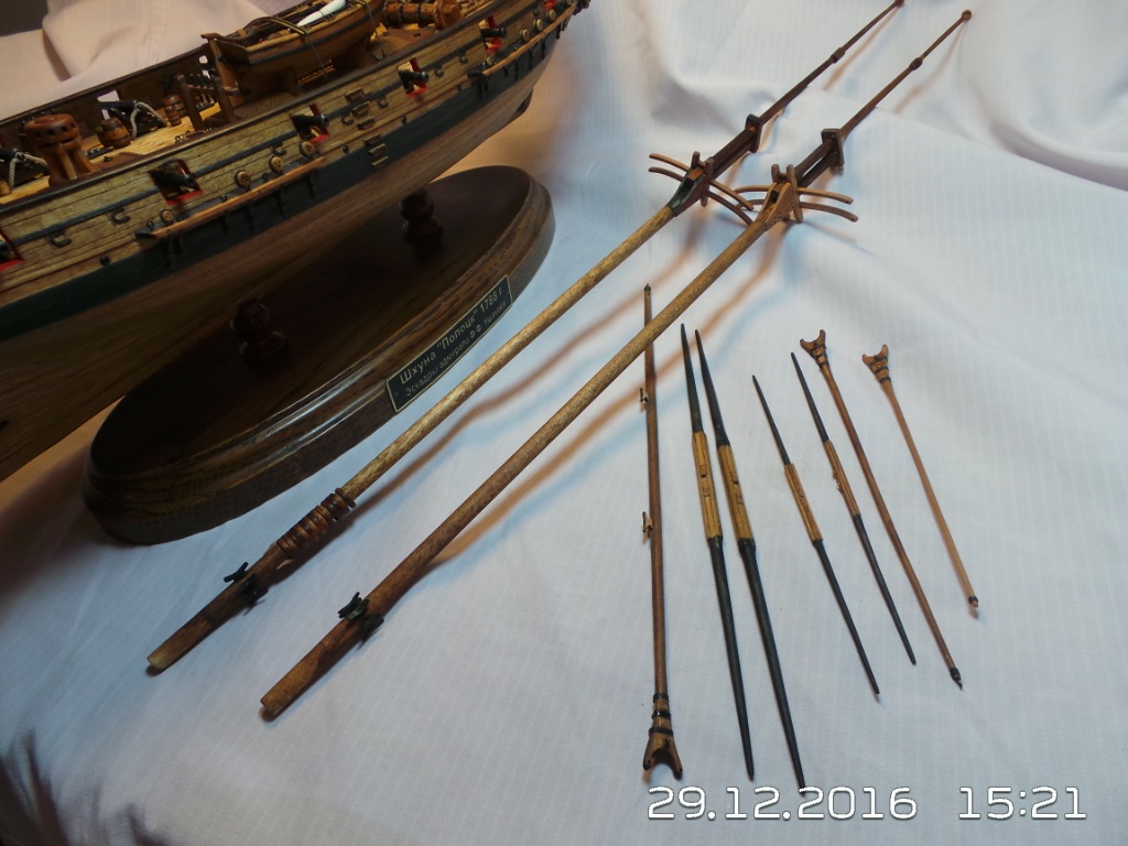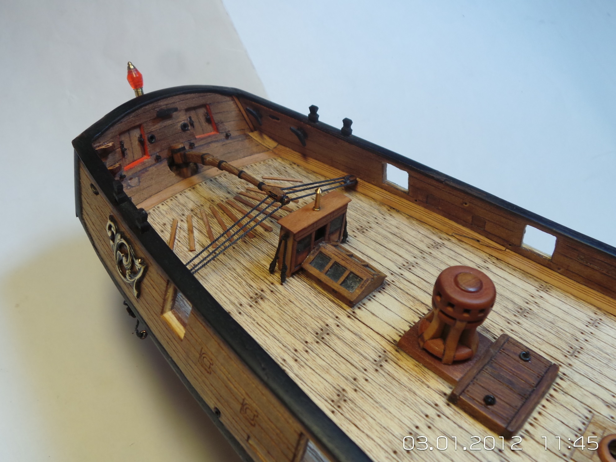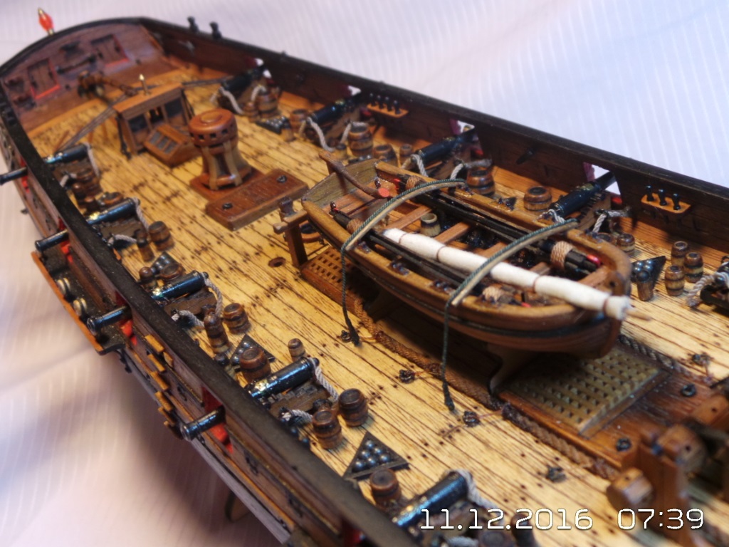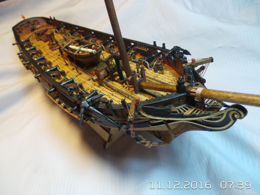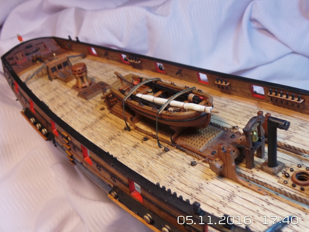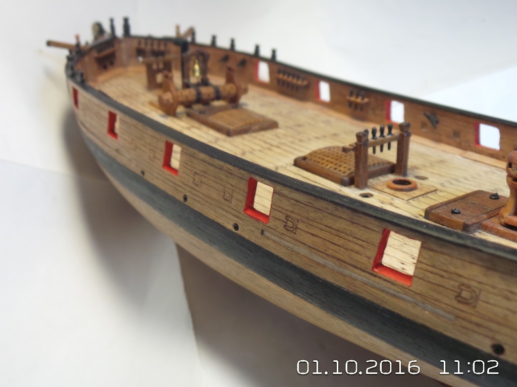 и еще что бросилось в глаза сразу-нагар на торцах пушечных лафетов, парус в шлюпке очень уж ровно смотан- так не бывает -больше похоже на рулон ткани и один виток якорного каната на брашпиле- этого достаточно? Вроде должно быть поболее... Ядра ,вроде как бы, великоваты...в ствол влезают?