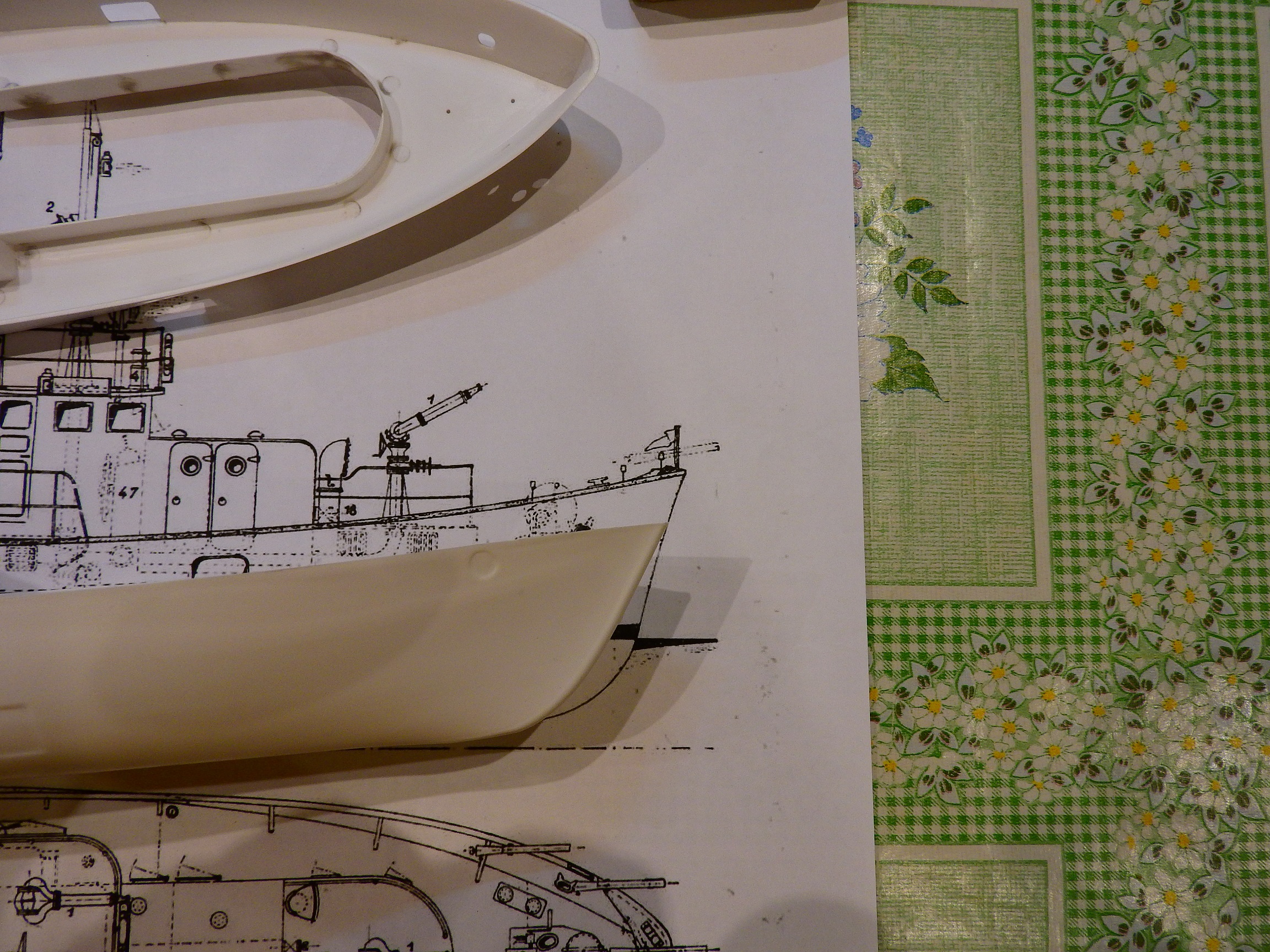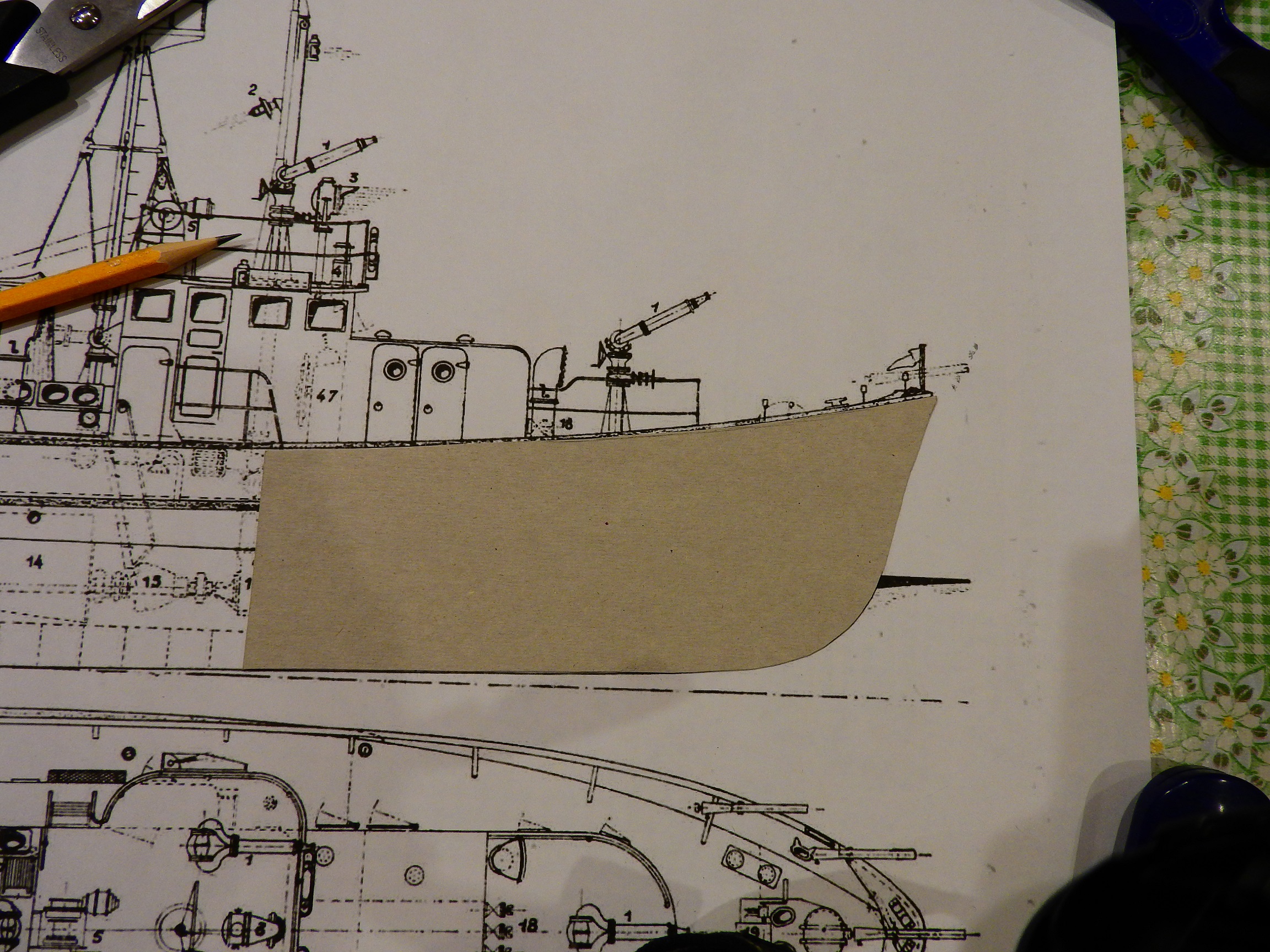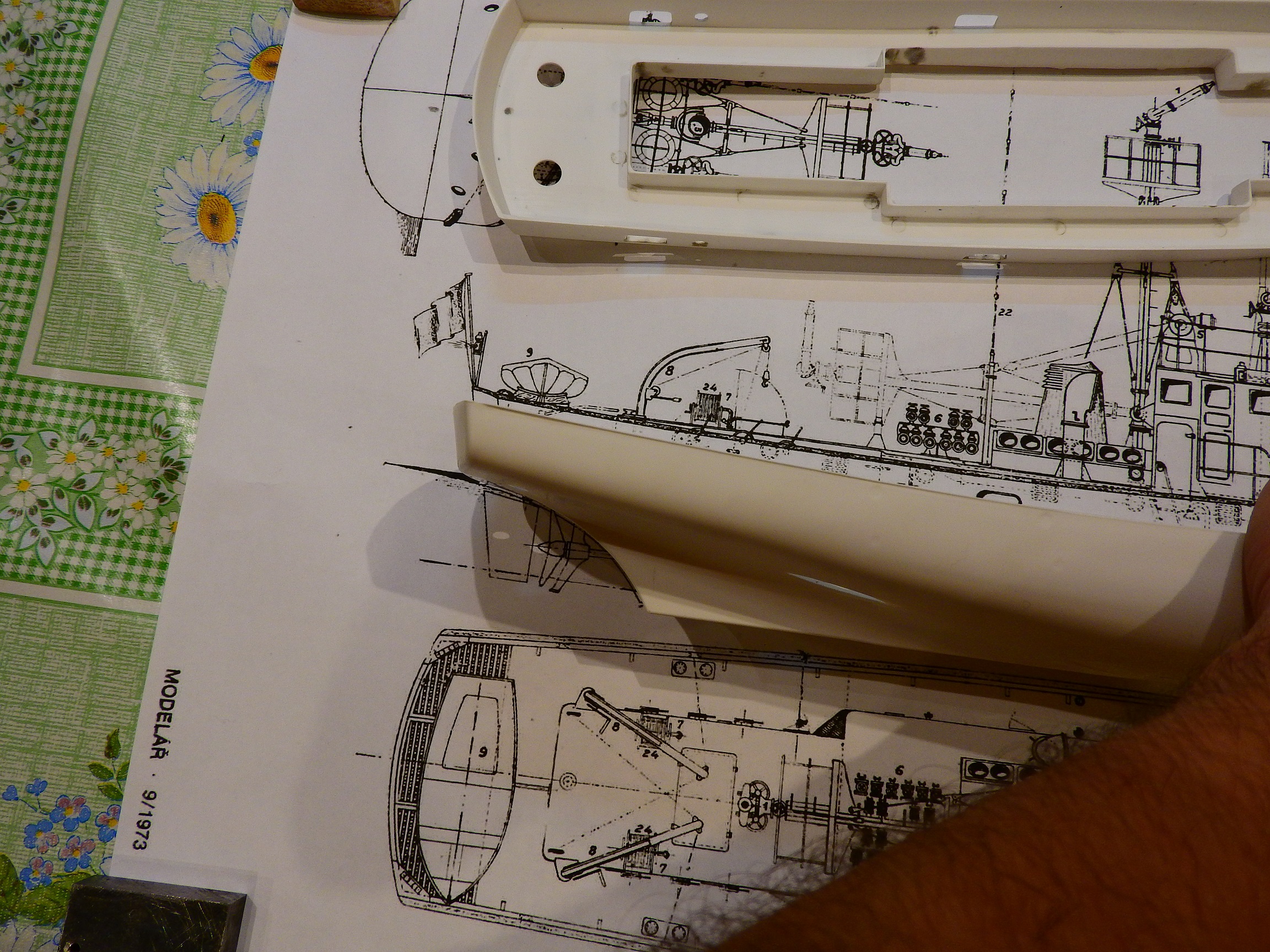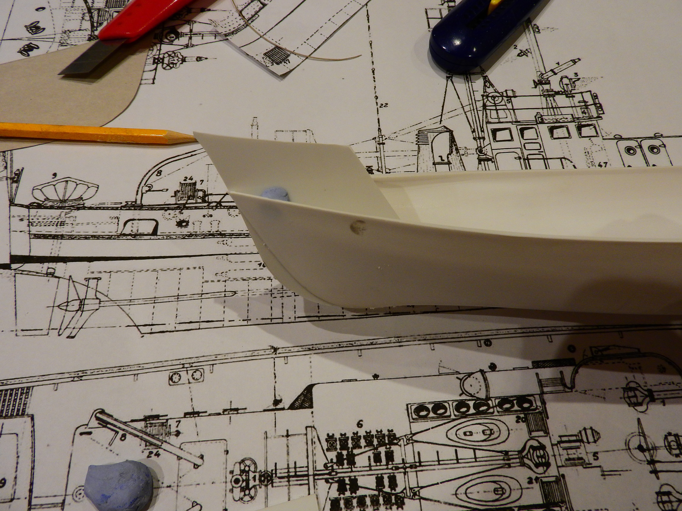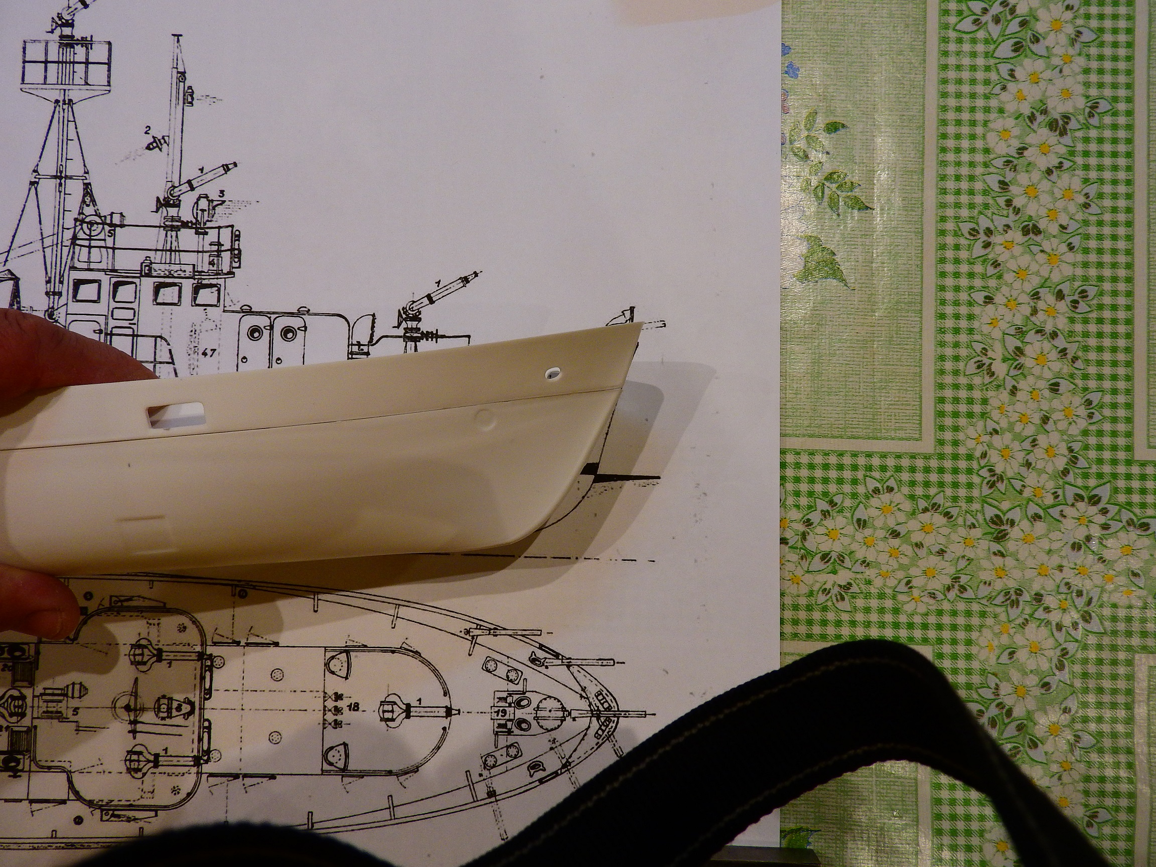 А пока сравнил корпус с чертежом . Корма ложится нормально : А вот с носом всё не очень хорошо , и даже совсем не хорошо ! Нужно , что-то делать , т.е. опять клеить , шпаклевать , шкурить .