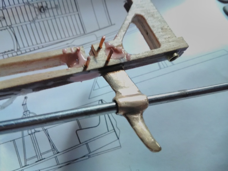 Кронштейн представляет собой две медные полосы толщинами 0,5 мм и размерами примерно 45 х 15 мм. В этих полосах в определяемом по чертежу месте и под соответствующим углом на жесткой оправке Ф 4 мм формируются углубления таким образом, чтобы при складывании половинок в образовавшееся цилиндрическое отверстие помещался отрезок латунной трубки Ф 4мм длиной 15 мм. Затем половинки кронштейна и трубка облуживаются, соединяются зажимами (через теплоизолирующие прокладки), и все пропаивается. После этого определяется размер вклеиваемой части кронштейна, под этот размер дорабатывается щель в киле, на оправке совмещаются дейдвудная труба и трубка кронштейна. Появляется возможность разметить кронштейн, снять его и обработать в окончательный размер. И вклеить -опять же, на оправке, клей-эпоксидный. На прилагаемом фото оправка видна в виде стального вала ( это не гребной вал!) Оправка должна быть безупречно прямой и плотно входить в латунную дейдвудную трубу и трубку кронштейна гребного вала. Диаметр такой оправки для используемой мною трубки -1/8' (т.е. 3,175 мм), длина ок.290мм. Дополнительно кронштейн штифтуется 4 отрезками медной проволоки Ф 1 мм через просверленные по месту отверстия.