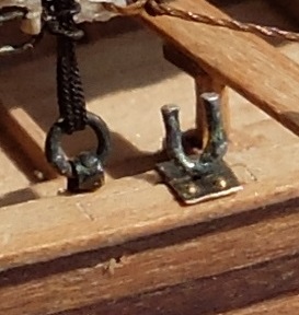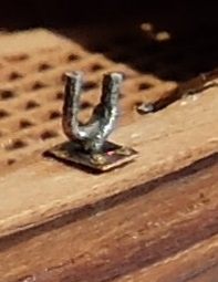 Уключины сделаны из проволоки с помощью паяльника. Конец проволоки обматываем вокруг сверла с небольшим (четверть окружности) перекрытием. Диаметры сверла и проволоки определяют размер уключины. Область перекрытия пропаиваем. Проволоку отгибаем под прямым углом к получившемуся кольцу. Кольцо разрезаем в диаметрально противоположной точке и распрямляем для придания формы уключин.