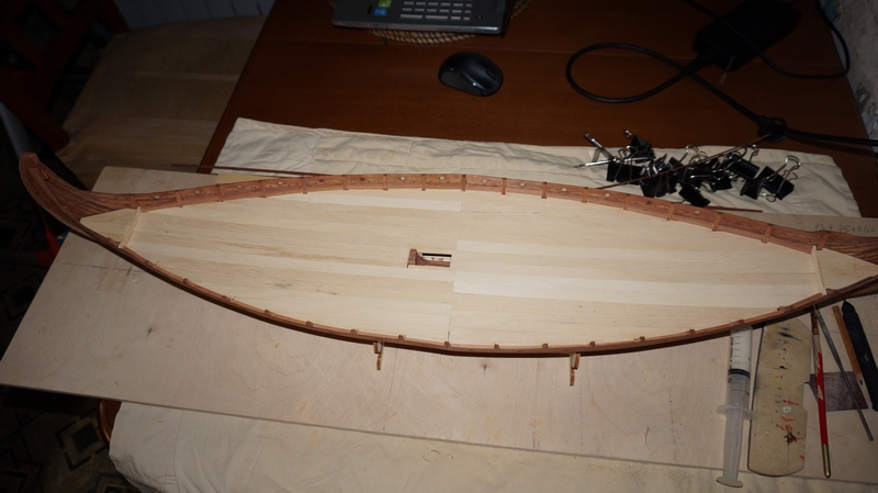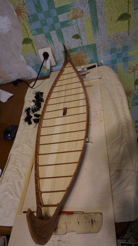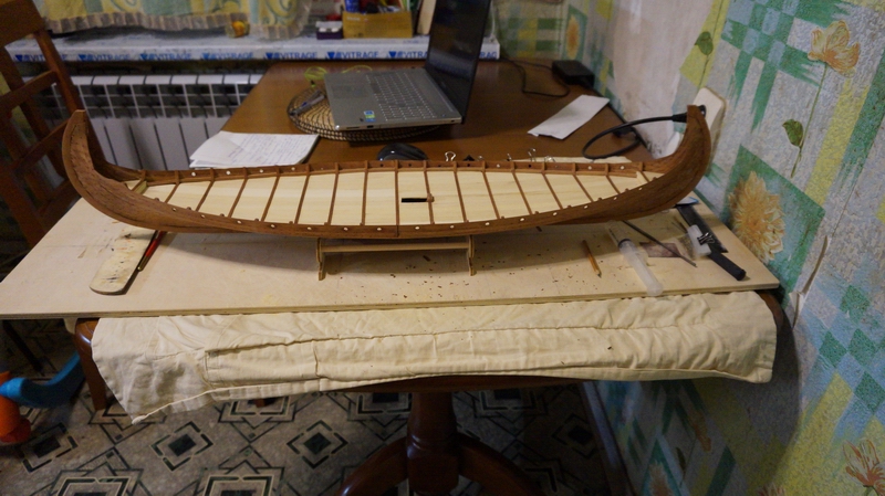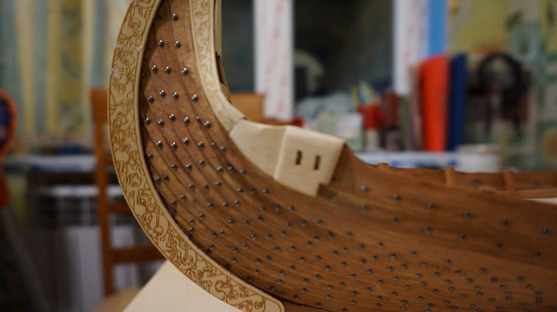 Гвоздевание окончено. 2040 штук ни больше, ни меньше. Часть корпуса ниже линии палубы не принесла никаких затруднений. Гвозди устанавливались "как есть". Выше линии палубы каждый гвоздь пришлось предварительно откусить практически под шляпку дабы он не торчал с внутренней стороны обшивки. Точно откусанные гвозди не считал, но получилось в районе 400 - 600 штук. Вот результат: