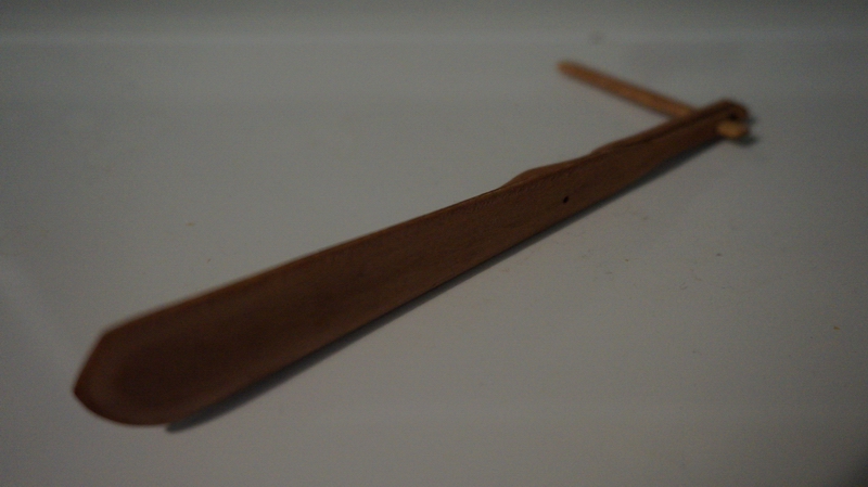 Сделал руль. Пока в полуготовности, планирую обмотать веревкой в месте крепления пера руля и воротка под имитацию каната