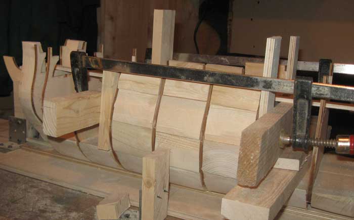 После того как соберёте киль и закрепили его в стапеле прилейте 1 и последний шпангоут, предварительно не шпангоутах начертите ось симметрии. Дальше возьмите заготовки палубы приложите сверху и выставляйте шпангоуты на нужном расстоянии проверяя угольником вертикаль. К килю шпан. крепите капелькой клея так чтобы можно было потом оторвать. Выставив таким образом шпан. на нужное расстояние уберите одну половинку палубы и на всю длину корпуса прибейте ровную рейку это ось симметрии корпуса в районе палубы. Прибейте все шпан. к этой рейке. Выровняйте ось симметрии шпан. с рейкой и прибейте шпан. к рейке. Все шпан. выставлены по оси симметрии.