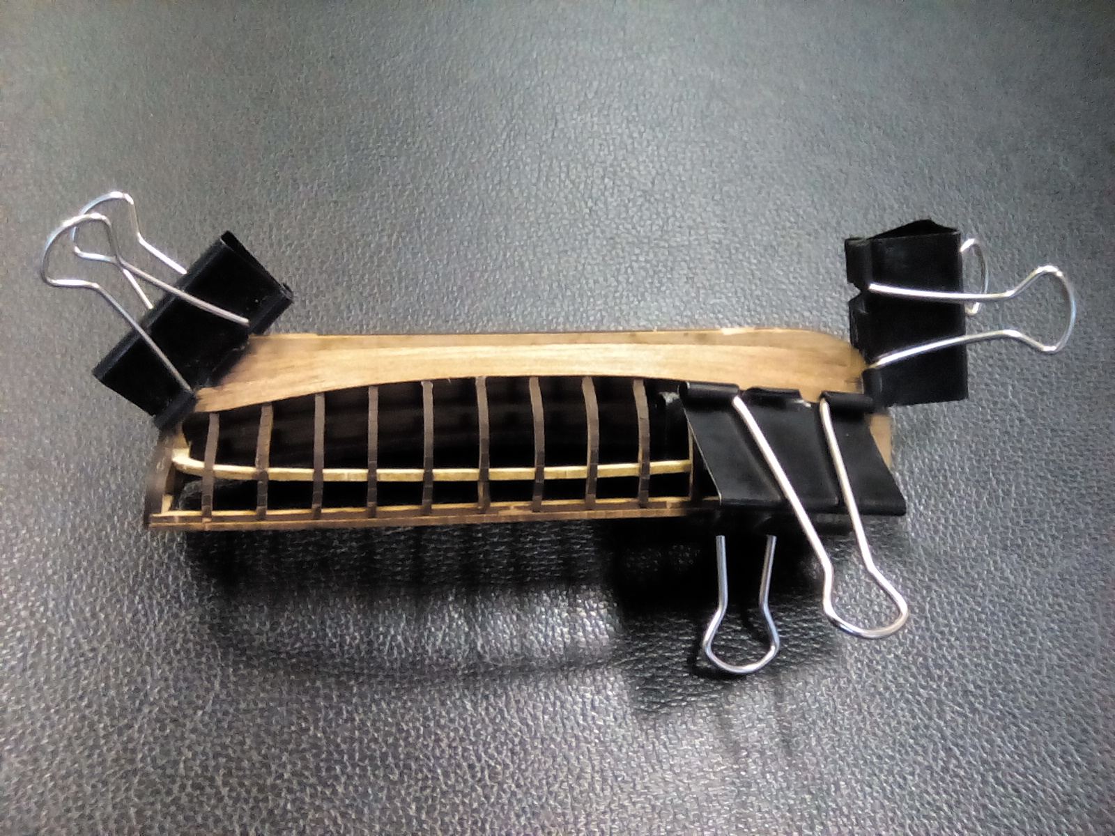 Да ... забыл добавить ... не смог приклеить к бортам планширь ... вот пытаюсь его изогнуть от носа к корме - ломается и все тут ... то ли материал не очень удачно подобран уж слишком толстоват и другое дерево там надо, то ли руки не оттуда и наверное надо под паром подержать и размягчить дерево