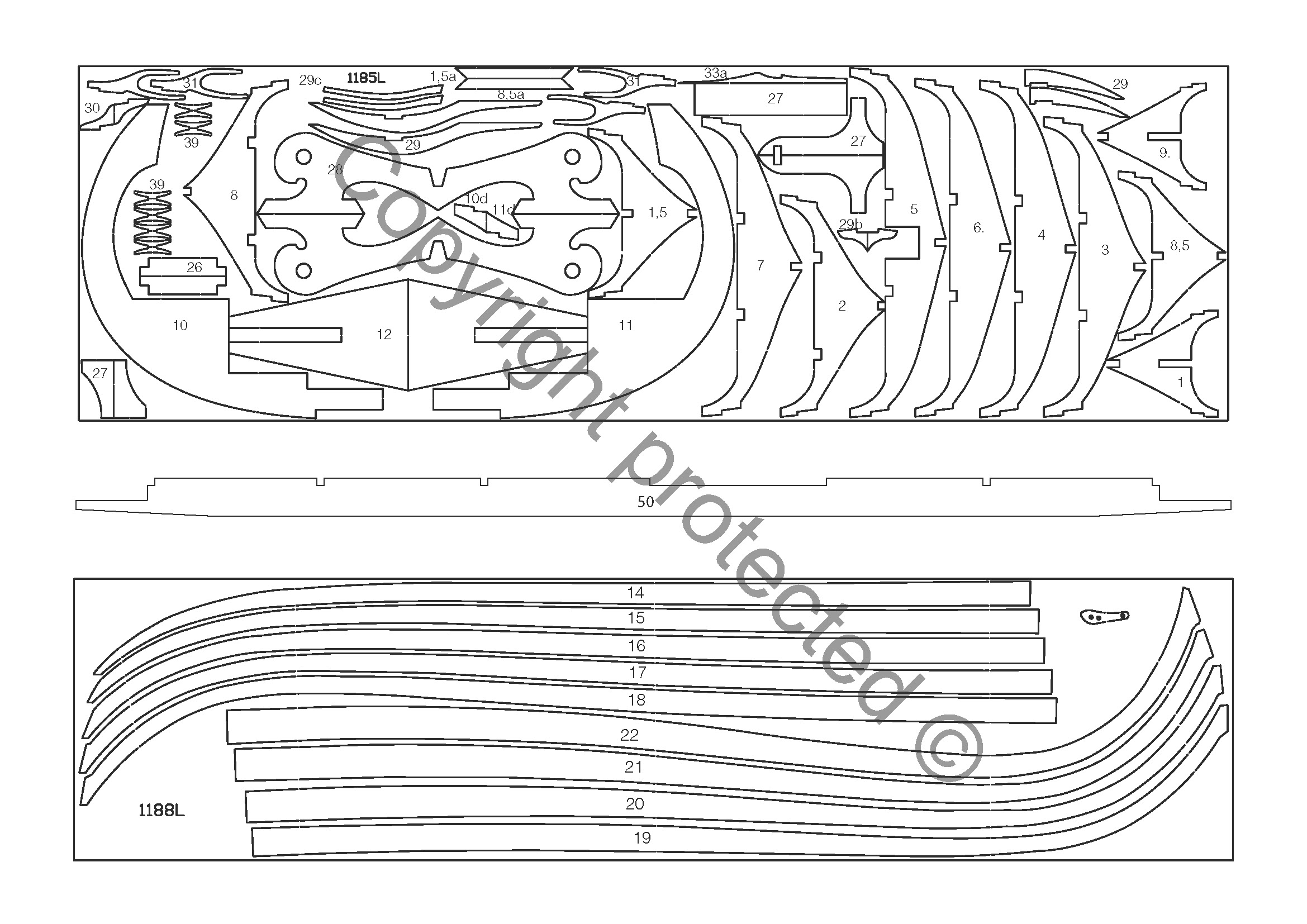 - Amati. На чертеже в масштабе 1:1 даны виды деталей, входящих в набор. Шпангоутный набор каркаса судна, элементы предварительно раскроенной обшивки