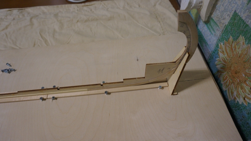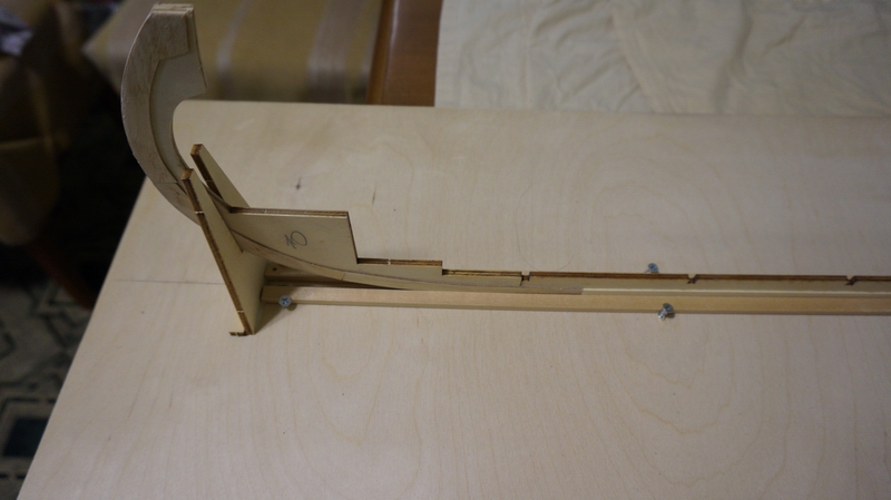 Подготовил стапель для сборки каркаса судна. Основание стапеля не поставляется вместе с комплектом, благо нашелся подходящий по размеру кусок фанеры. Производитель рекомендует собирать стапель полностью на клей, но детали 49 кривые и нужно как то обеспечить их параллельность на время склейки. В итоге я собрал стапель на метизах. Благодаря этому можно легко убрать детали 49 (впоследствии они будут мешать). Параллельность деталей и надежная фиксация киля была достингнута