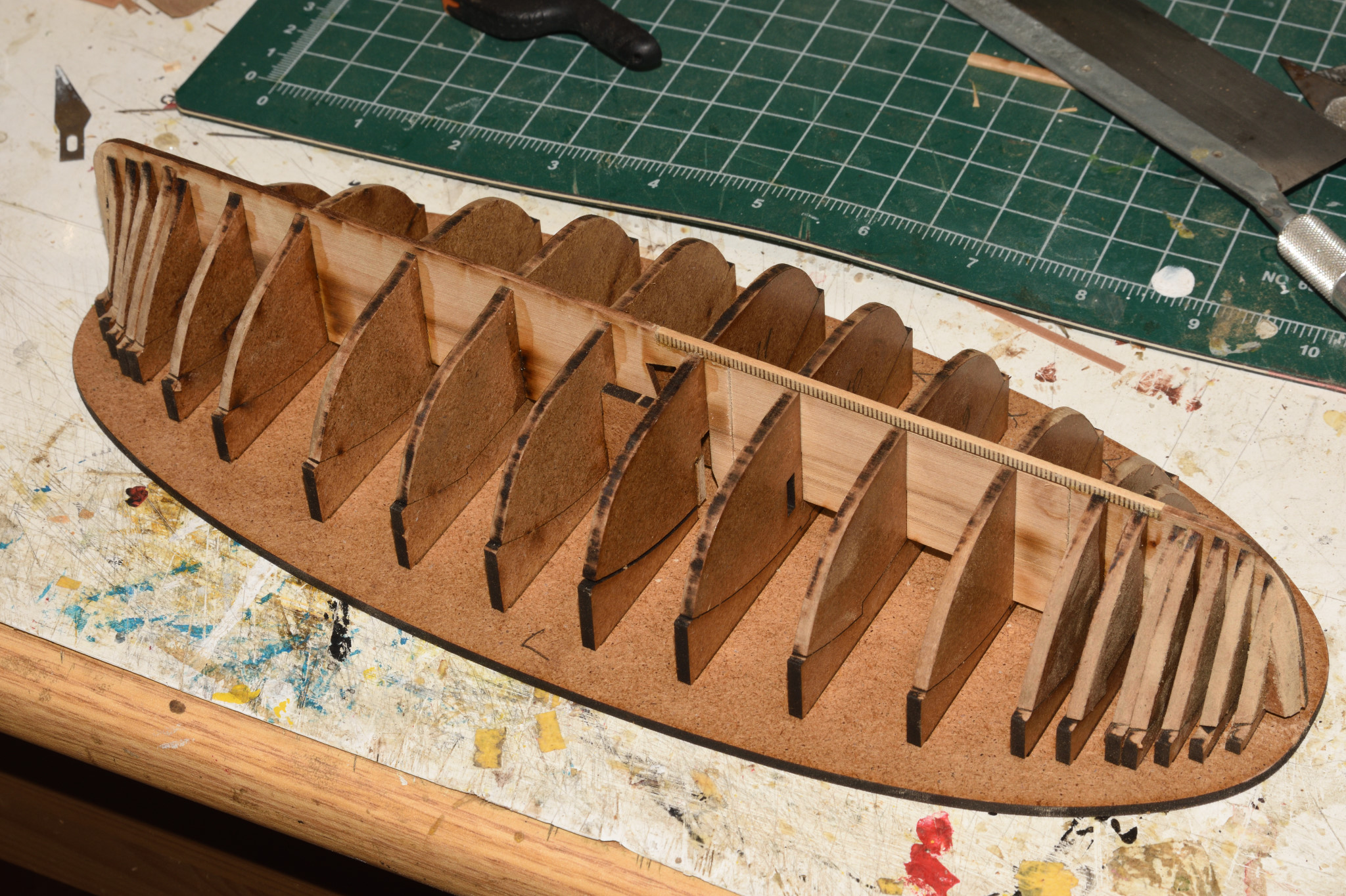 Здесь стапелей аж два — на одном собирается корпус до палубы, на втором — фальшборт. Может, оно малость замороченно и отходов много, зато собирать будет куда проще. Стапели и шпангоуты из МДФ, технология знакомая, обшивка раскроенная, проблем не предвидится. Тем более обшивка ниже палубы отчасти двойная.