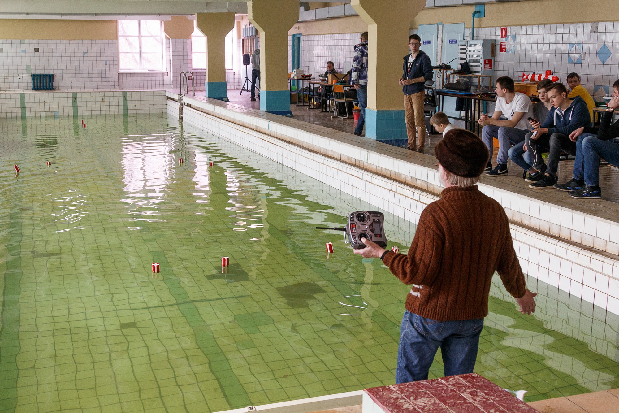 Место проведения вызвало двоякие ощущения. С одной стороны своя парковка, удобно выгружаться-разгружаться, оставлять машину, пробок по дороге меньше (я был на авто, было проще и быстрее, чем в прошлом году), атмосфера более домашняя, и не страшно за модель, рядом можно дешево покушать, но это для участников. С другой стороны мало зрителей, состояние учреждения удручающее (бассейн меня вообще напугал, благо я в стенде), что влияет на восприятие моделей, делать и посмотреть (кроме моделей) совсем нечего. Ощущение не Чемпионата России в Москве, а судомодельного кружка где-то в райцентре отдаленной области. В очередной раз проблемы с организацией, расписание судейств по дням, и никто не может ответить даже примерное время судейства класса - никак невозможно распланировать свой день (приходится быть только там), награждение было не в заявленные 12-00, а в 11-ть. Это все, конечно, неважно для участников, которые проводят все время на мероприятии, но хочется за пару дней успеть еще что-то.