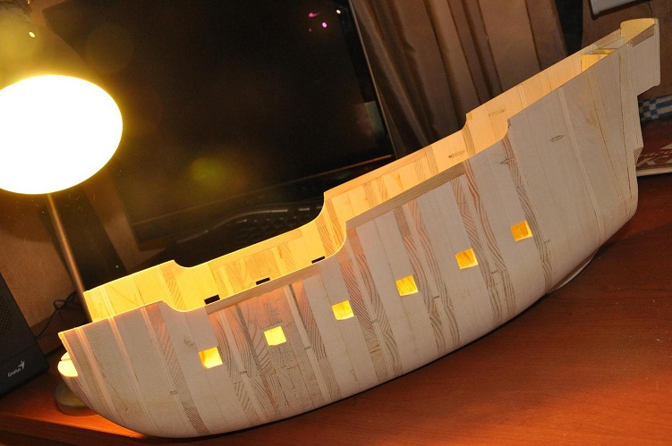 Мы подошли к заполнению шпаций(расстояние между шпангоутами).ЭТО НЕОБХОДИМО ДЕЛАТЬ ВСЕГДА,ПРИ ЛЮБОМ СПОСОБЕ ОБШИВКИ МОДЕЛИ!!!!Вы не представляете насколько проще и лучше получается обшивка,киль становится ну очень прямой,нам не страшны падения корпуса(у меня уже падал раз пять,пару раз на ребро борта,а ему пофиг,можно ставить пушки на полноценные станки на любой палубе,делать толщину борта как положено,а не на толщину обшивочной рейки,плюсов еще больше,вспомню добавлю.Для этого нам необходимо дерево.Древесину добывае разными методами,покупаем в магазе или комуниздим на "помойке".Не проходите мимо задних дворов крутых мебельных магазинов и ресторанов.Можно легко найти ну очень редкую древесину от упаковки.В некоторых странах ель и сосна большая зкзотика,чем для нас вишня,красное дерево и т.п.Я купил липу здесь,дешево и сердито,но можно на рынке и дешевле. http://www.tatianka.ru/goods/doska_brus ... ll/?id=162