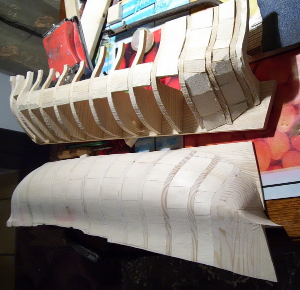 И способ номер три,горизонтальный.Зашиваем корпус рейками .Плюсы:рейки разного размера продаются в любом строительном магазине или на строительном рынке,легко режутся в нужный размер любой пилой,легче потом обрабатывать,т.к.шкурятся вдоль волокон,можно заполнить шпации до самого верха,мало отходов.Минусов нет.Фото предоставлены Саво.Есть еще четвертый способ,профессиональный,рассматриваться не будет,т.к. не годится для начинающих моделистов своей сложностью.На сегодня хватит,устал.Прелюдия закончена.Завтра выложу то,ради чего затеял эту канитель.Как говорится,продолжение в следующем номере.