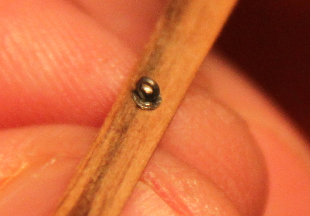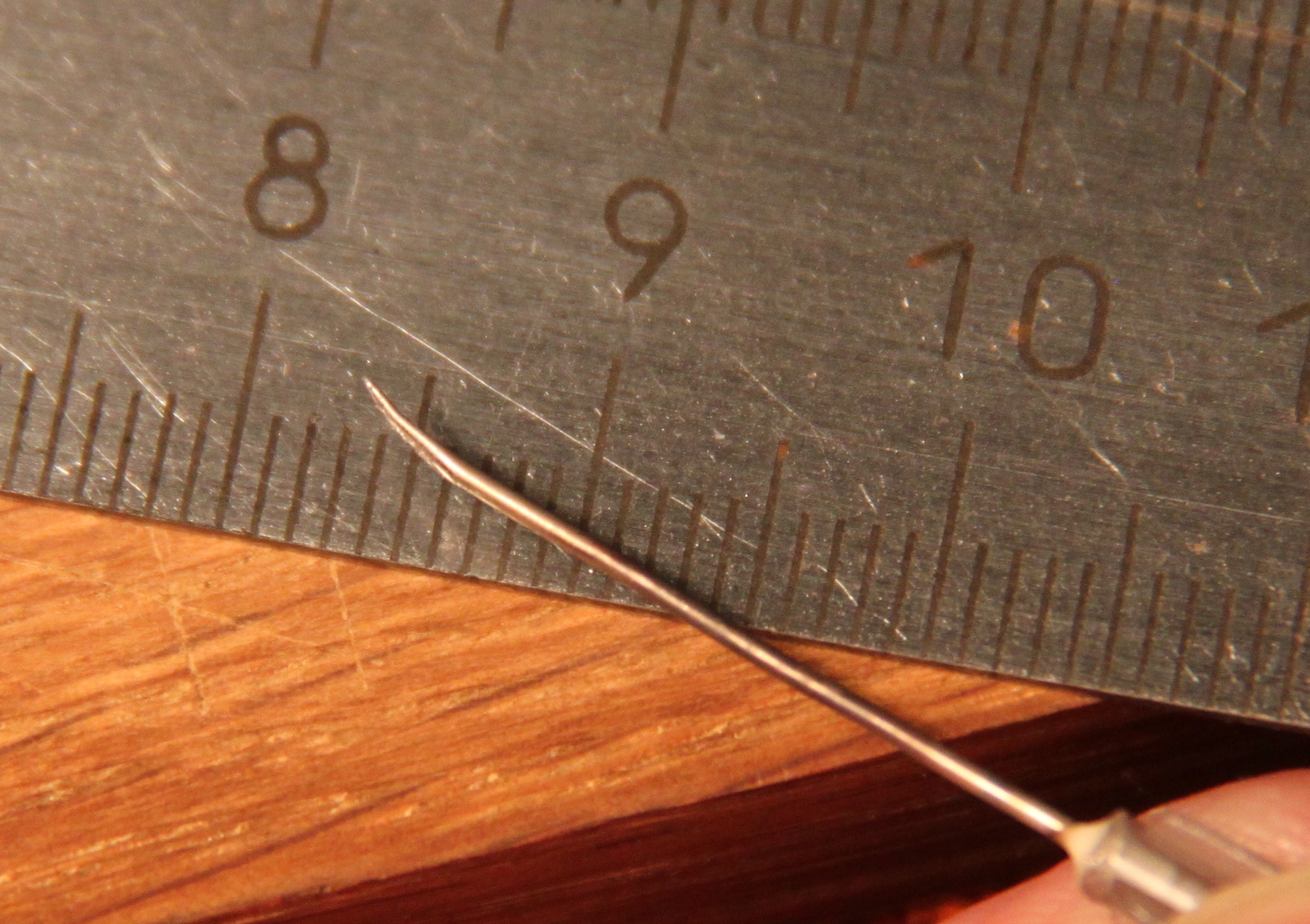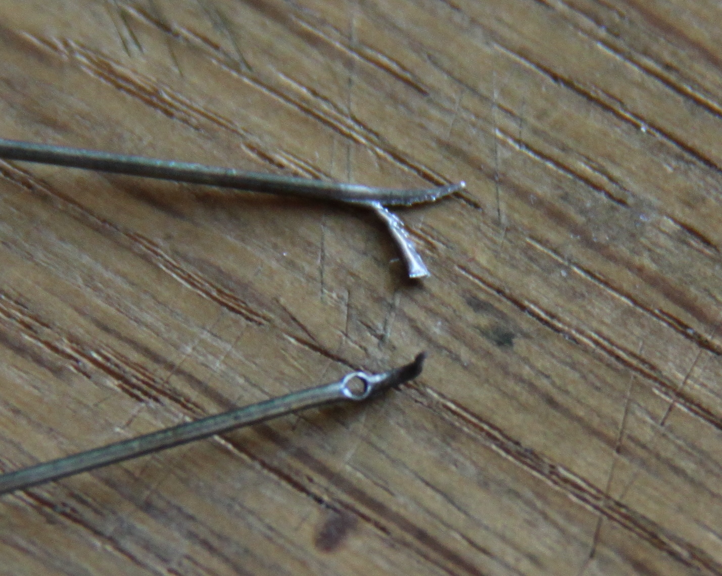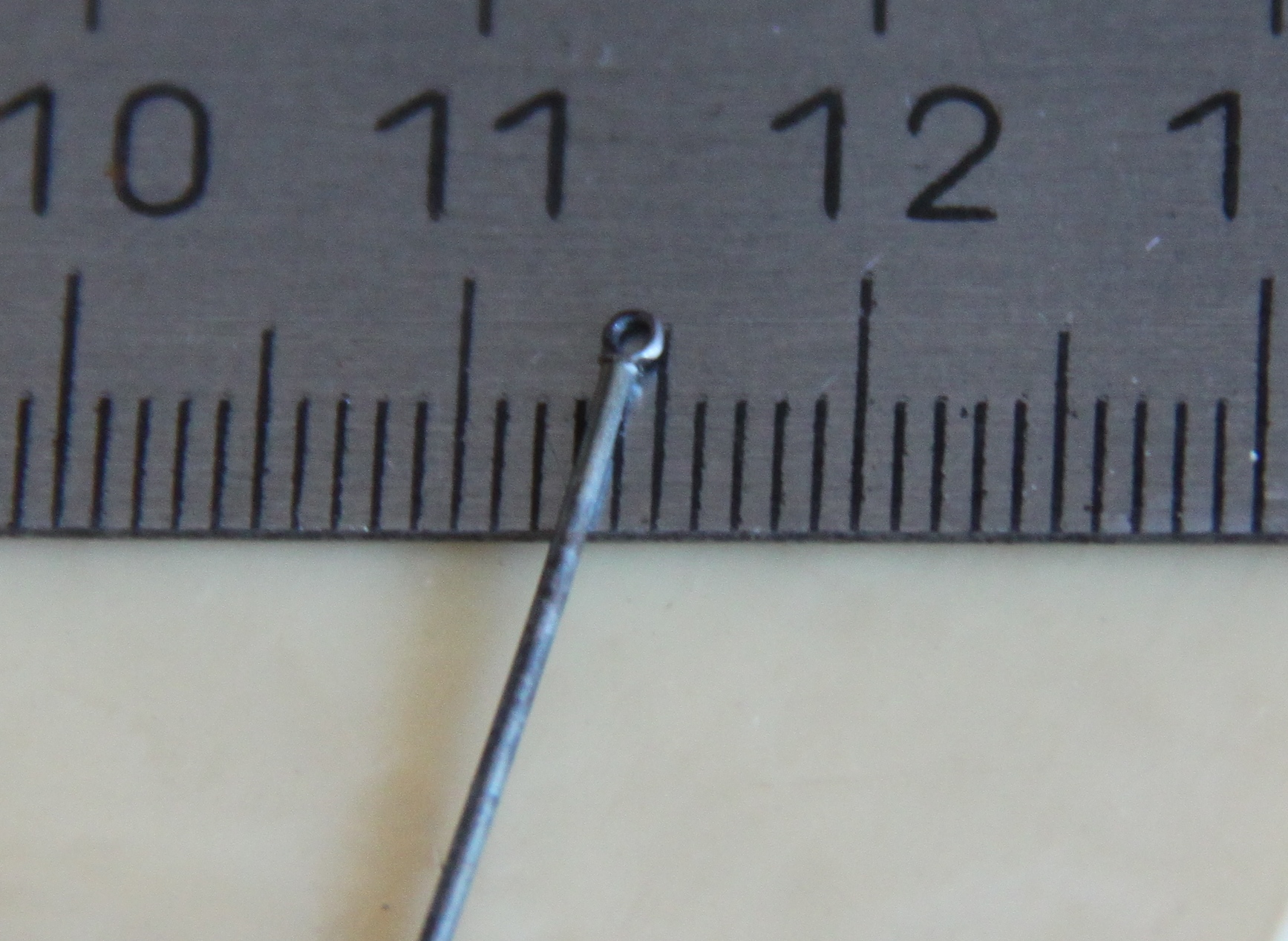 Говоря об обухах и рымах невозможно обойти вниманием гаки. Для тех кто предпочитает попроще, хочу предложить вариант легко реализуемого способа изготовления гаков длиной около двух миллиметров. Способ позволяет произвольно располагать плоскость кольца относительно собственно крюка. Для демонстрации использованы иглы сечением 0,7 мм. Из одной иглы можно сделать несколько гаков. Можно изготовить гаки меньшего размера из игл с сечением в диапазоне 0,6 - 0,4 мм. В этом случае для выполнения изгиба по дугам с меньшим радиусом придется изготовить подходящие оправки. Основное преимущество предлагаемого подхода заключается в способе изготовления кольца гака. После предварительного выполнения изгибов собственно крюка изделия, выбирается месторасположение будущего кольца путем нанесения с помощью отрезного диска двух рисок нужной глубины (с противоположных сторон трубки). Затем концом швейной иглы на дне насечек прокалывается тонкая металлическая мембрана и формируется кольцо необходимого диаметра. И никаких танцев с бубнами в виде засверливания трубок, пайки с последующей очисткой и.т.д. Перед отделением кольцо можно сплющить, а можно оставить в объемном исполнении. Последовательность действий на фотографиях.