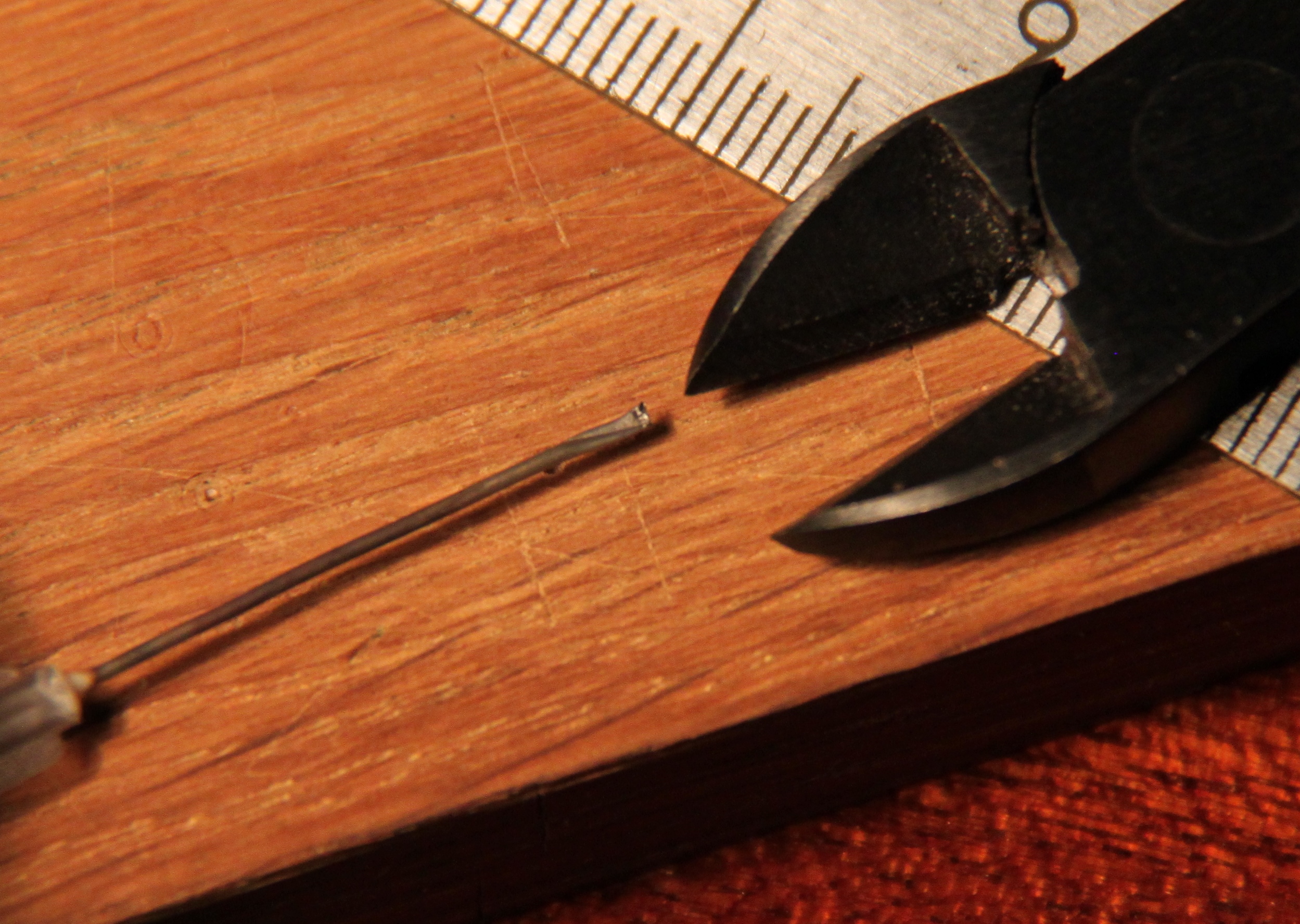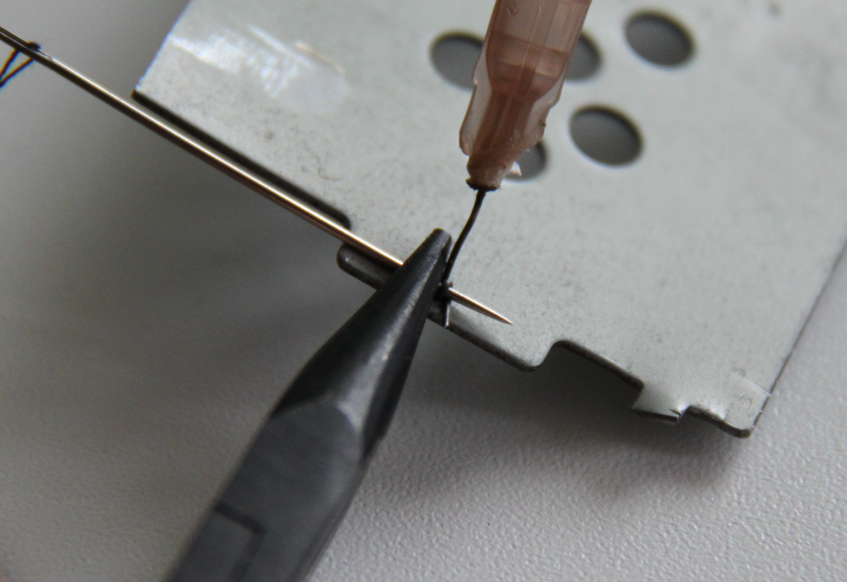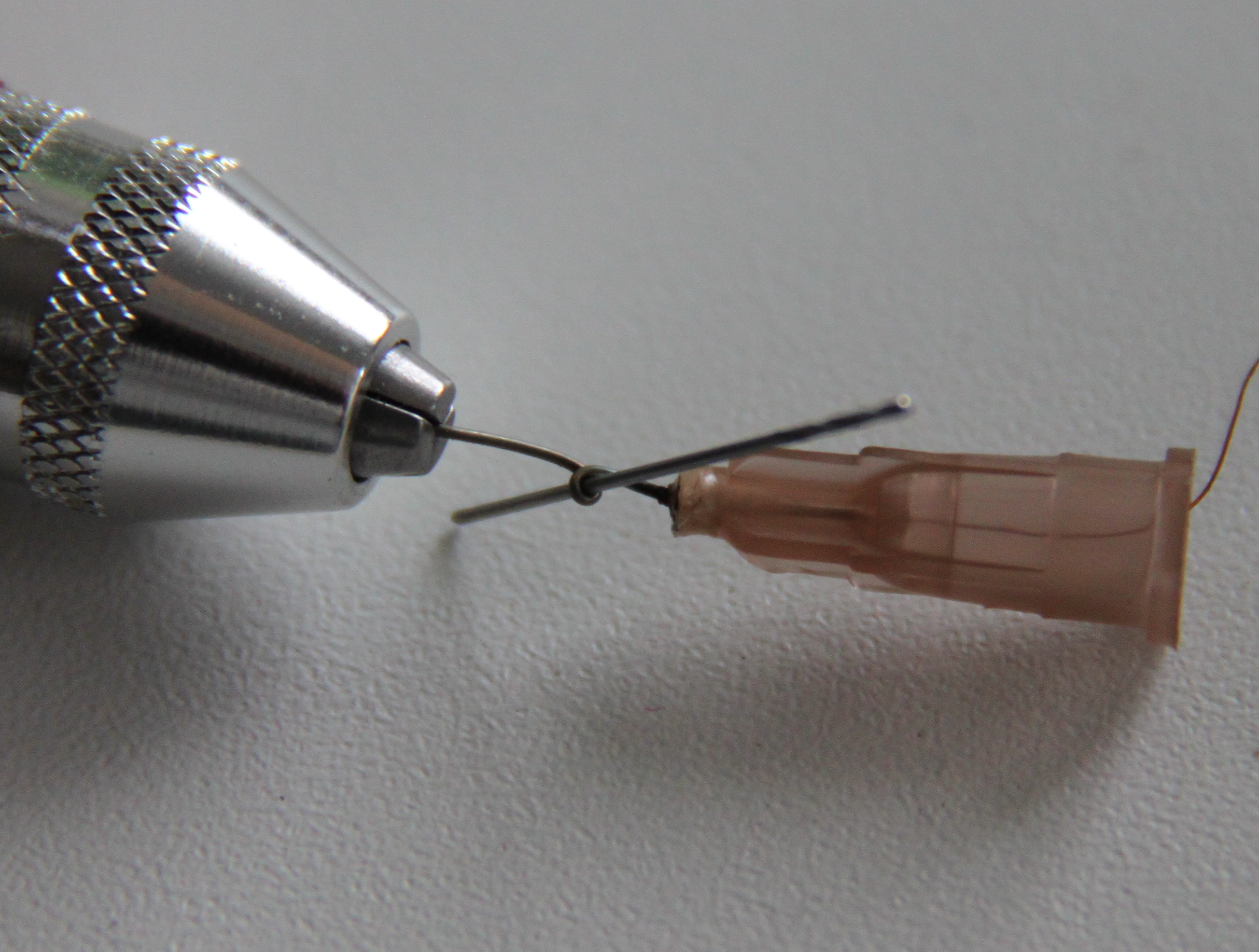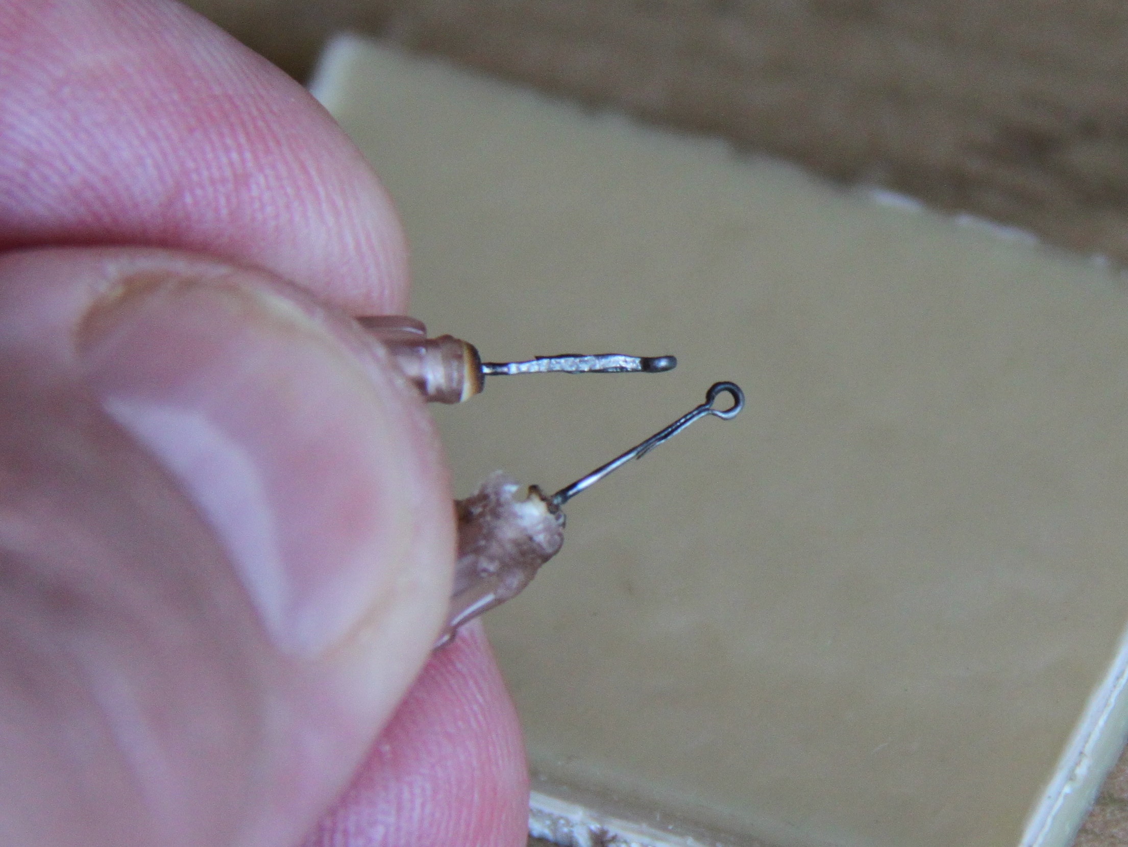 Тонкостенная стальная трубка имеет ряд преимуществ. Во-первых, она имеет большую жесткость при сохранении геометрии просвета и очень легко гнется в месте залома. Достаточно трубку слегка сплющить в нужном месте чтобы приложив небольшое усилие получить изгиб именно в месте деформации. При этом легко достигается очень маленький радиус изгиба. Во-вторых, просвет иглы, куда вставляется кольцо, не более 0,55 мм и вставить туда два отрезка проволоки составляющие по ширине около 0,8 мм без дополнительной обработки вряд ли удастся. В случае с иглой ее достаточно аккуратно смять (четвертая фотография сверху). Для увеличения пластичности материала игла подвергается отжигу. Для предотвращения сплющивания трубки при накручивании ее на оправку, в просвет вставляется медная проволока подходящего сечения (это видно на последней фотографии). После формирования кольца она из просвета удаляется.