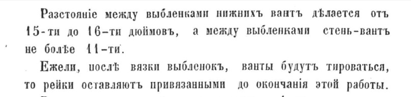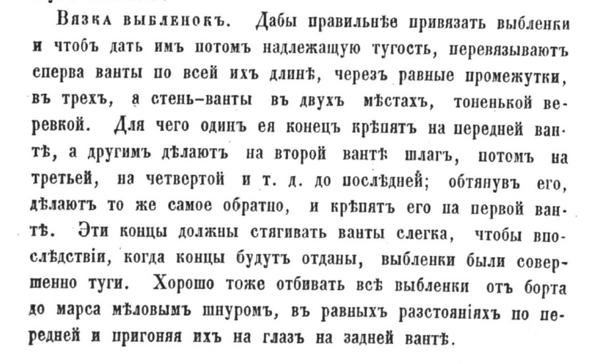 Так же неплохо задуматься, к чему могло привести провисание выбленок как таковое, и стоит ли оно того. И почему в "Морской практике" так категорично оговаривается именно равномерное натяжение выбленок без "провисов" (тем более, ещё и неравномерных!). И, если бы нештатные "провисы" выбленок были вопреки правилам вооружения судов такелажем - как долго они бы существовали на корабле ...