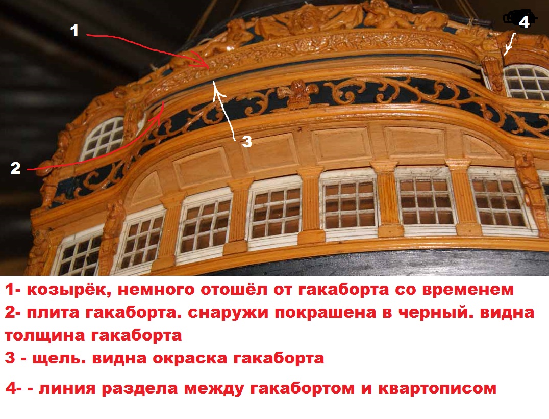 Давайте разберёмся. Почему две одинаковые фанерные панели? Видимо, аматиевцы посчитали толщину одной панели недостаточной, а слишком толстую заготовку нельзя будет согнуть. Так вот. Инженеров Амати сбили с толку старинные чертежи. На торец гакаборта и квартописов накладывался планширь. На чертежах этот планширь указан УСЛОВНО широким, чтобы дать габариты скульптур (по Франклину). На тех же чертежах, где скульптуры прорисованы, планширь гакаборта и квартописов показан ... узким. Это подтверждают адмиралтейские модели, смотрите фото. Если вы приклеите всё-таки две панели, у вас возникнут трудности как раз с планширем: он должен быть визуально параллелен линии фальшборта. Одно дело, слегка сточить только одну панель. Две одинаковые панели, стоящие под наклоном, потребуют снятия верхней кромки на гораздо большую глубину - вы понизите гакаборт примерно на 2 мм, а здесь это критично.