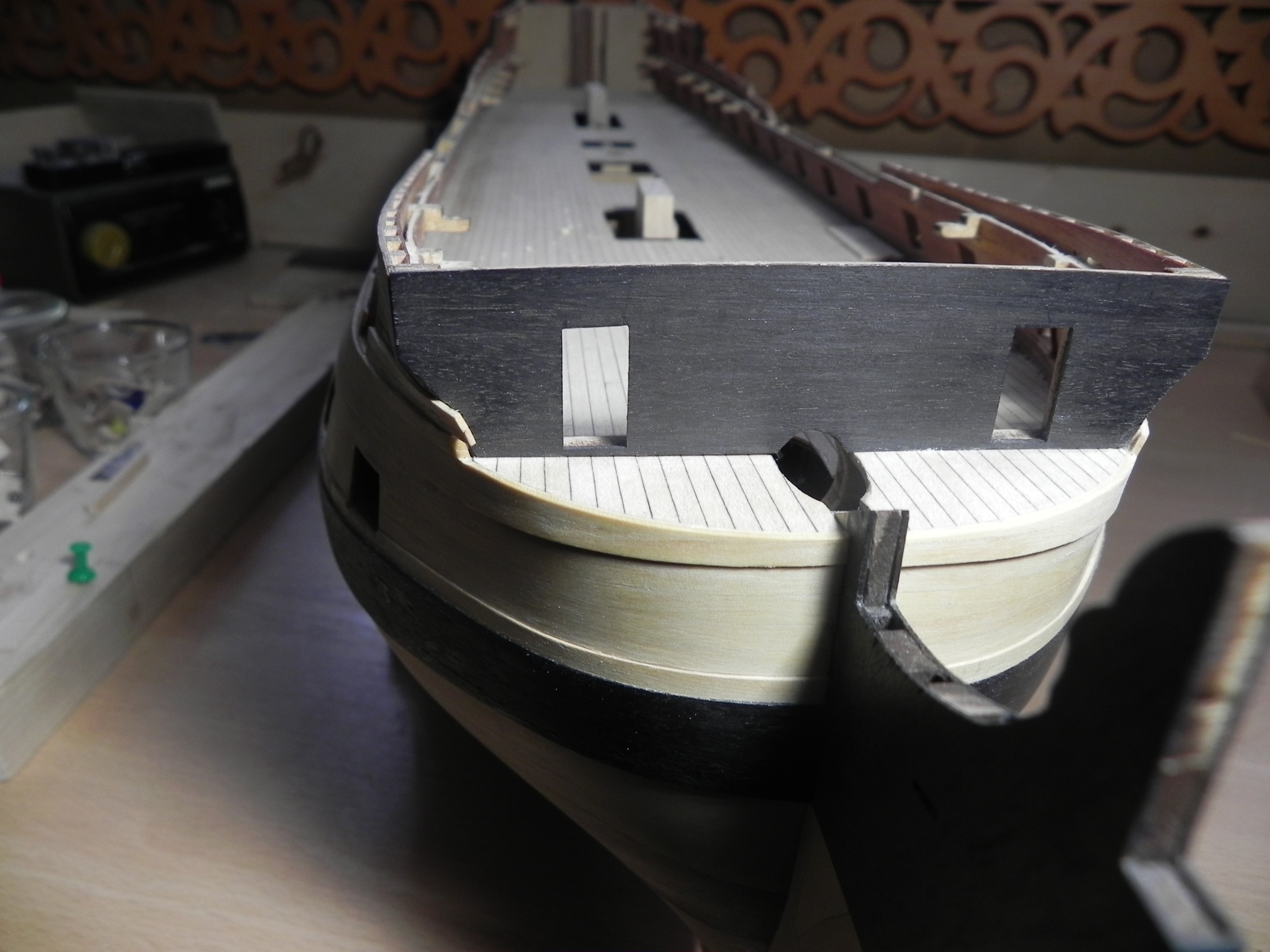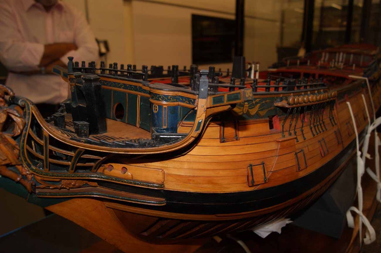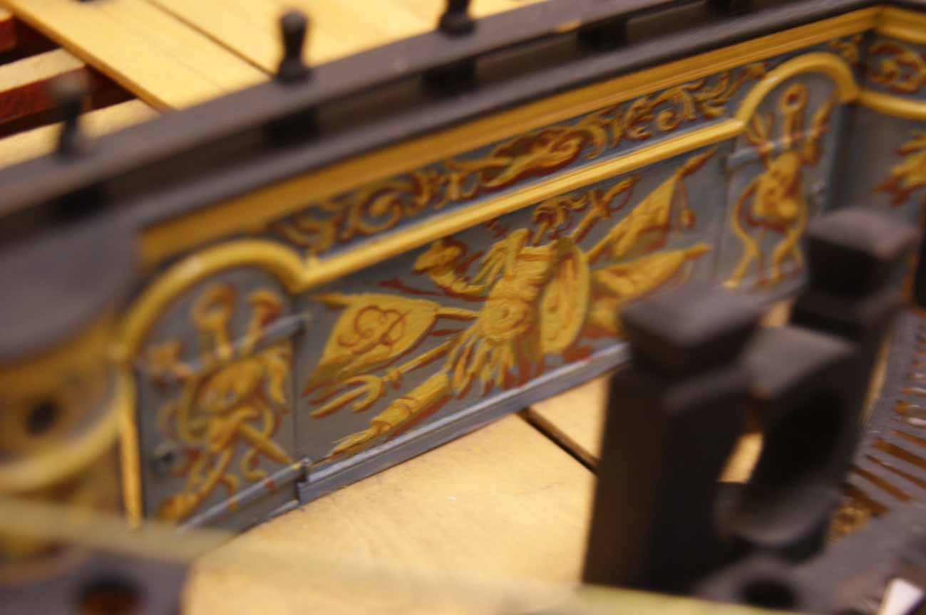 Блоки мне понравились. Про избыточную толщину щеки - я так и понял вас, что вы оставили на дальнейшую обработку, чтобы была идеальная чистовая, без провала. Что касается "колоннады" на передней переборке бикхеда, то здесь есть небольшая загвоздка, о которой я уже как-то писал: фактически, она на известных изображениях/моделях/чертежах и проч. семидесяти четырёх пушечников не встречается. На кораблях первого ранга видел. А вот на кораблях третьего ранга - такой вот, упрощённый вариант, обычно декоративный реельс идёт по переборке и по туалетным кабинкам - причём, он же есть на чертежах. Я так думаю, "колоннада" - очередная художественная выдумка разработчика.