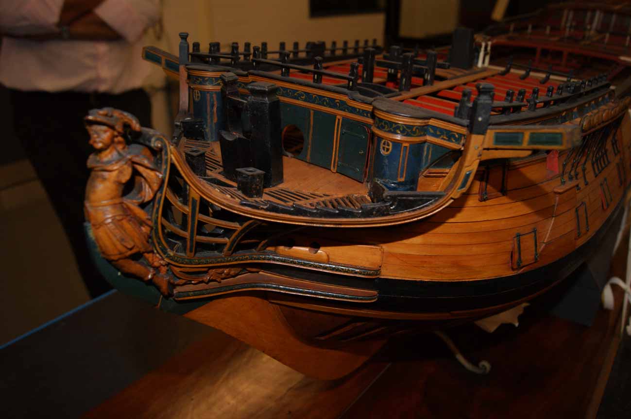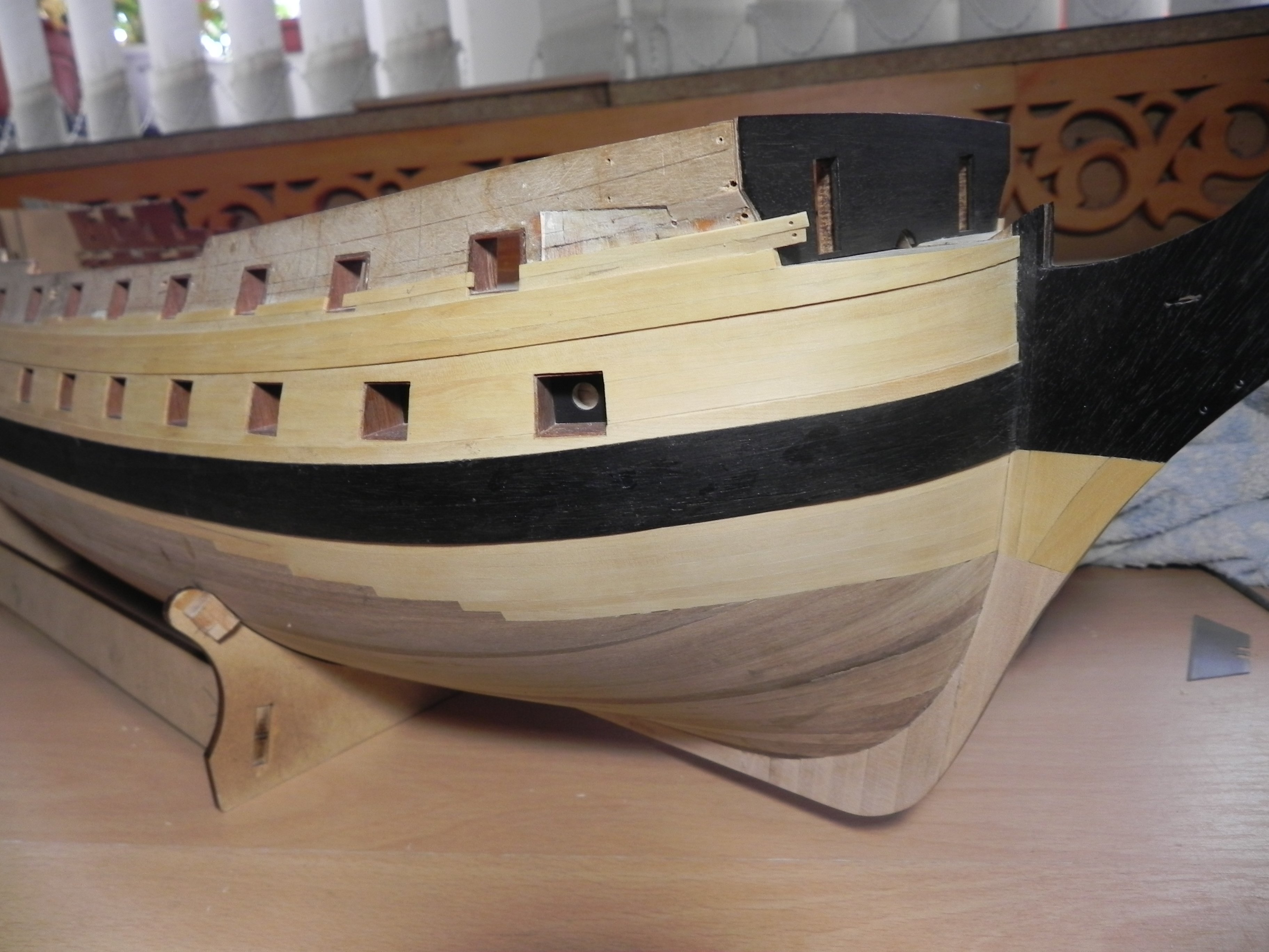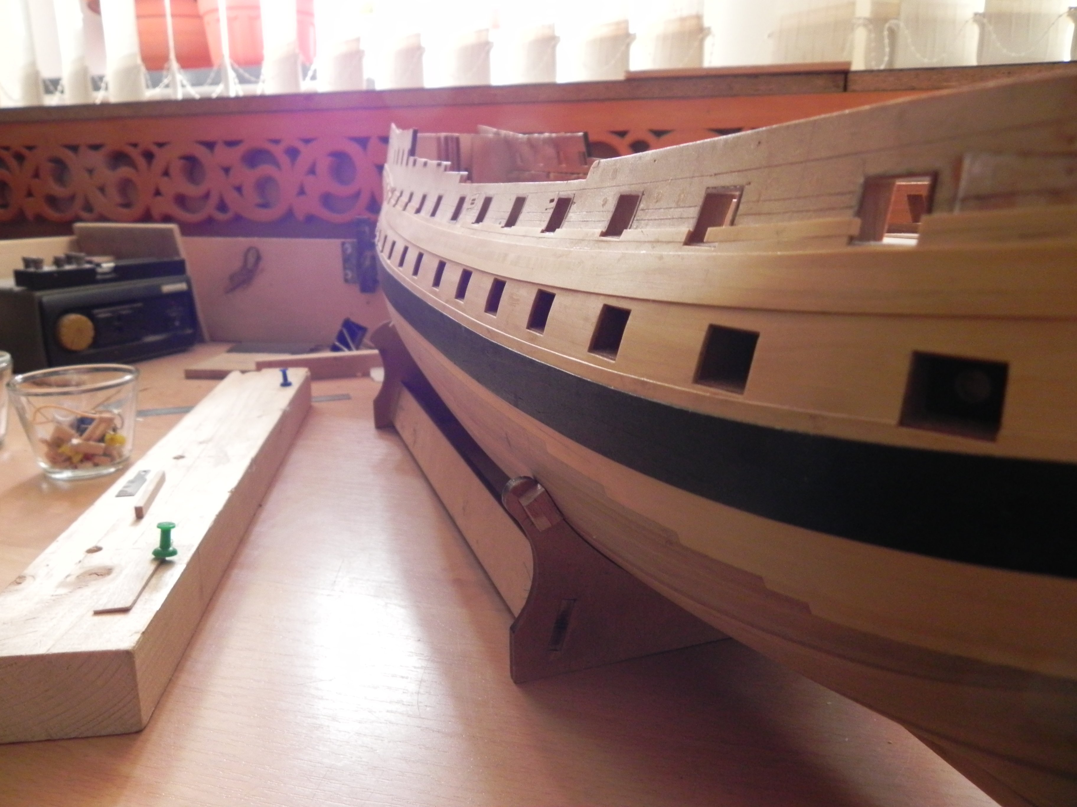 Блоки мне понравились. Про избыточную толщину щеки - я так и понял вас, что вы оставили на дальнейшую обработку, чтобы была идеальная чистовая, без провала. Что касается "колоннады" на передней переборке бикхеда, то здесь есть небольшая загвоздка, о которой я уже как-то писал: фактически, она на известных изображениях/моделях/чертежах и проч. семидесяти четырёх пушечников не встречается. На кораблях первого ранга видел. А вот на кораблях третьего ранга - такой вот, упрощённый вариант, обычно декоративный реельс идёт по переборке и по туалетным кабинкам - причём, он же есть на чертежах. Я так думаю, "колоннада" - очередная художественная выдумка разработчика.