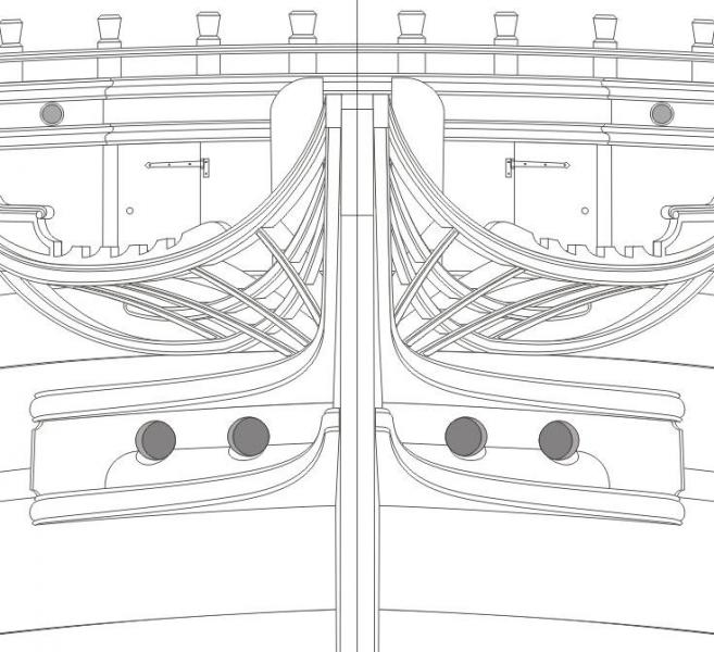 Верхние реельсы имели одинаковый профиль по всему контуру корабля. Какой реельс вы пустите по центру верхних пушечных портов опердека, такой же будет и в корме, и на носовой переборке. Мудрить и придумывать ничего не надо: профиль реельсов показан на оригинальном чертеже систершипа - "Эдгар", и на музейных моделях. Повсюду он "один и тот же" - как бы состоит из двух полукруглых в сечении полос, верхняя полоса выдаётся наружу больше нижней - и так все декоративные реельсы.