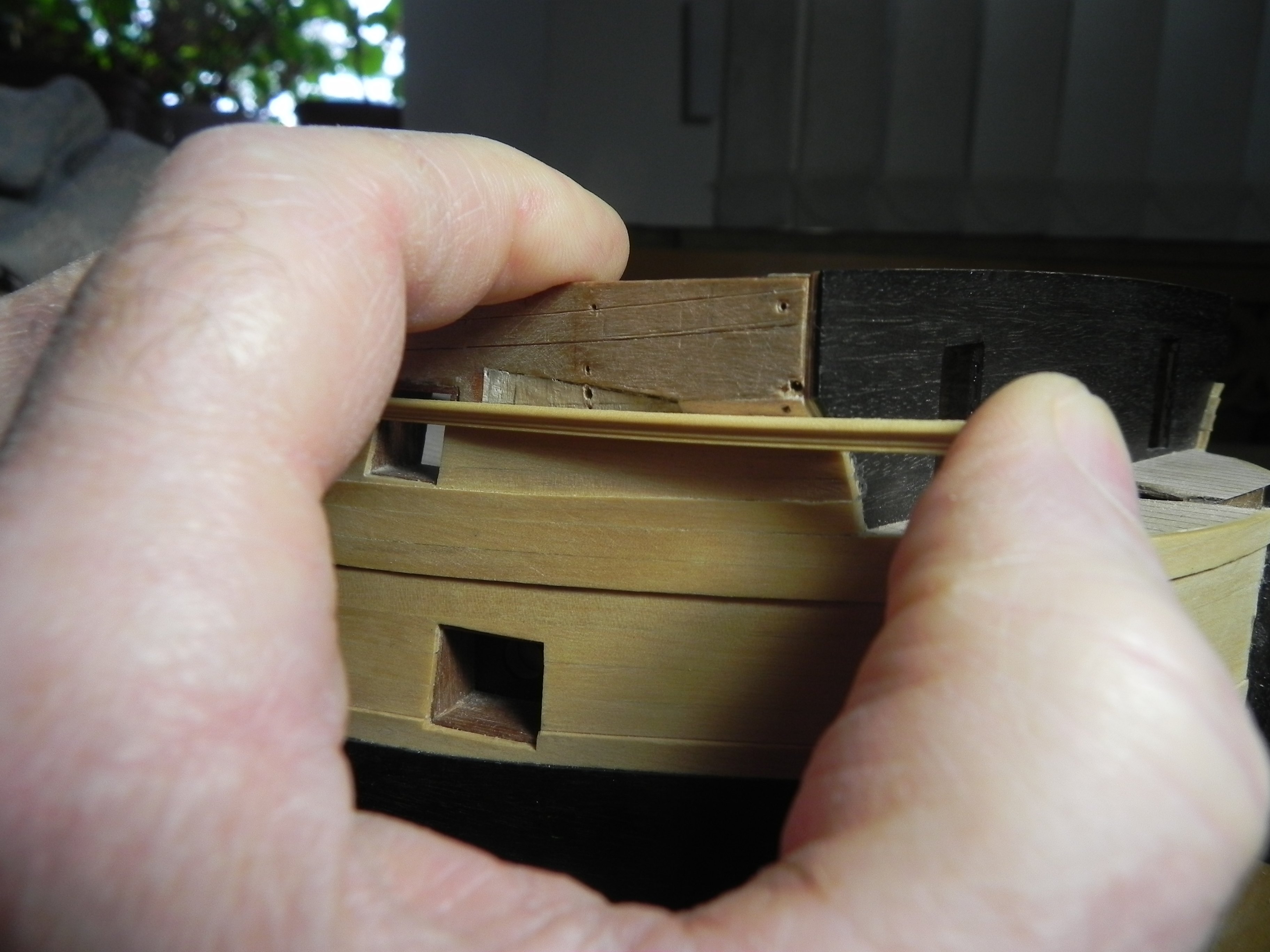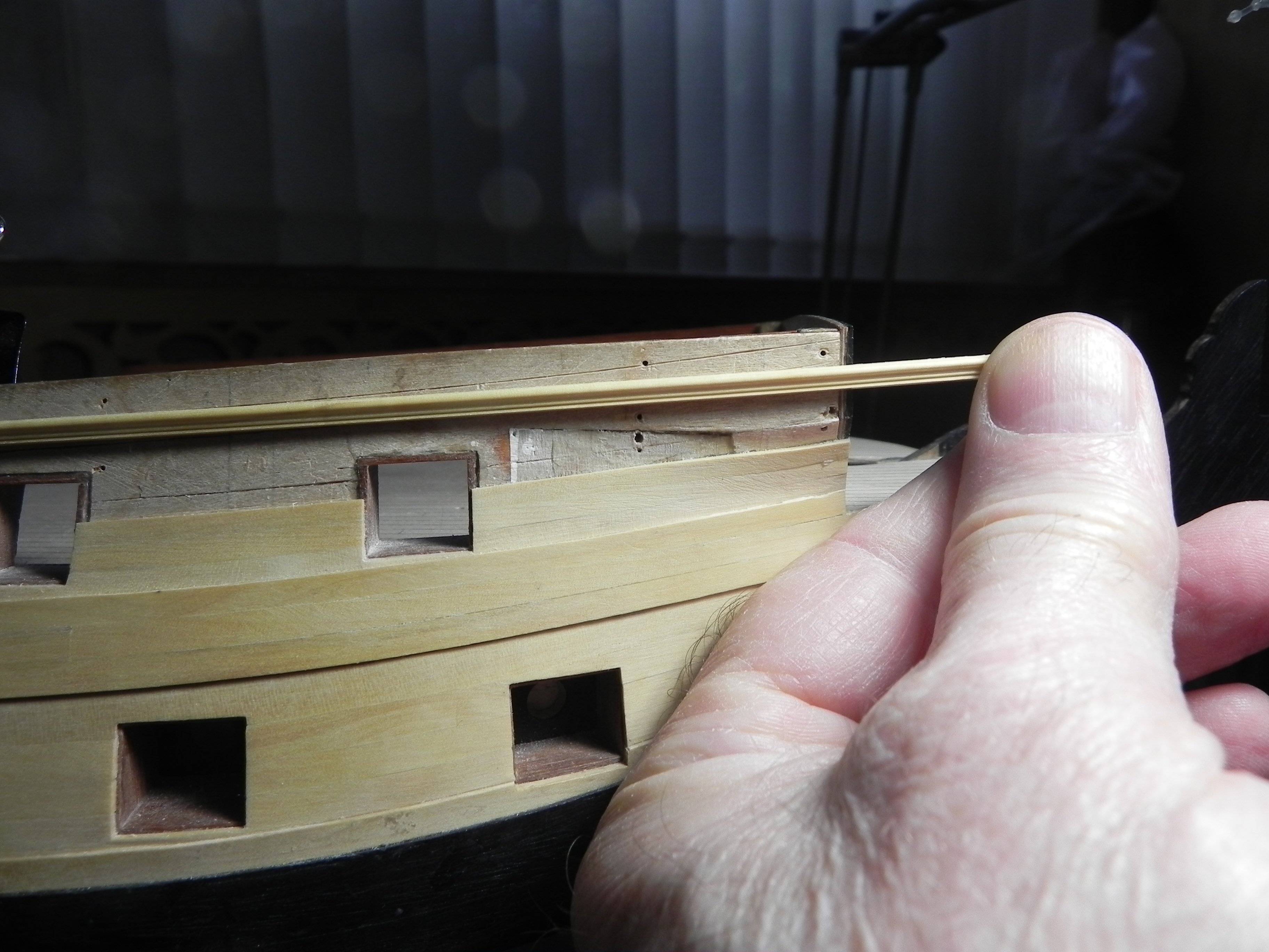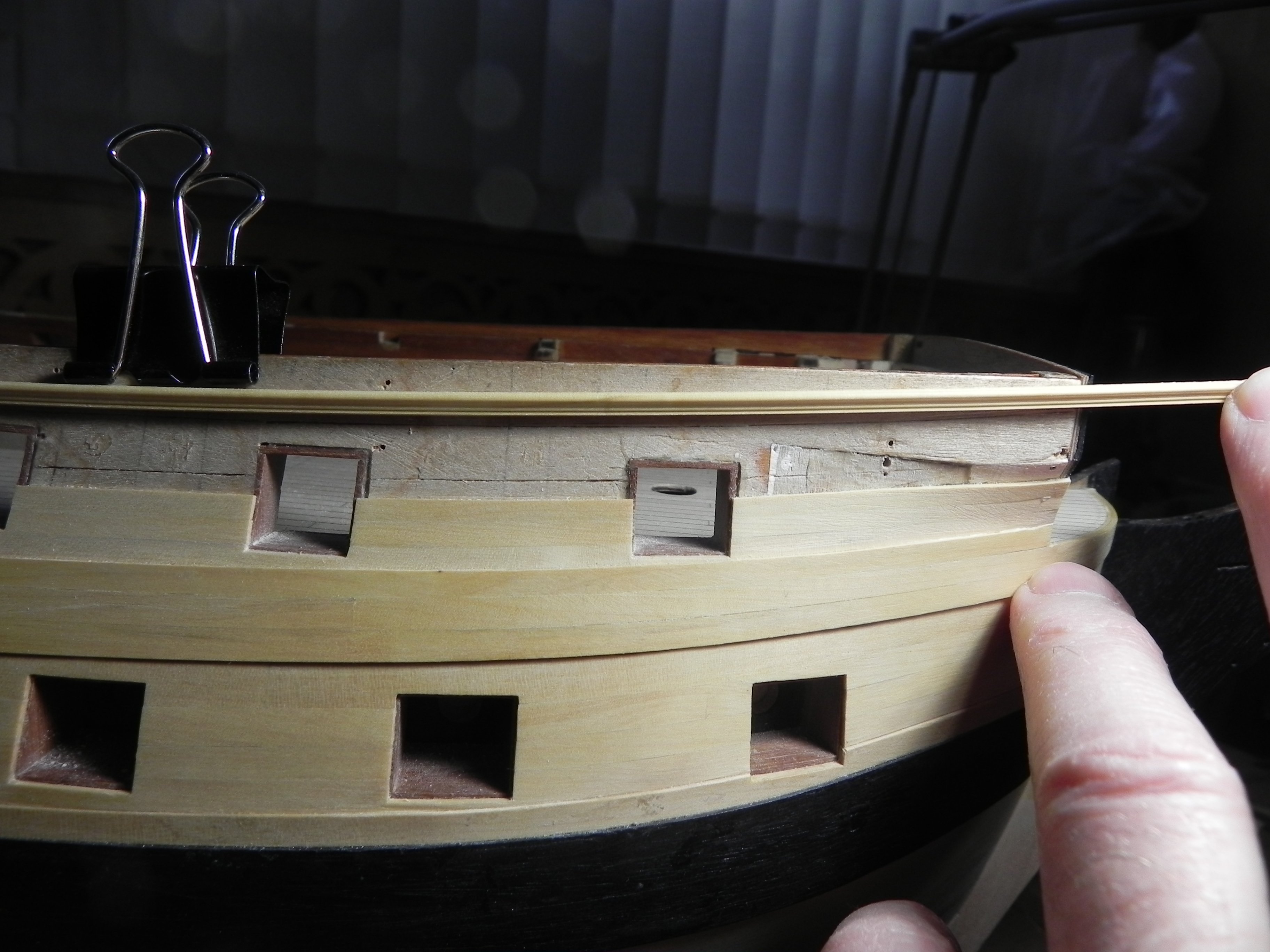 Игорь, добрый вечер. Не стал ждать завтра, прикинул сейчас. Посмотрите на фото. На первом-- вариант , что мы с вами рассматривали в прошлый раз. Это когда нижний реельс подходит под скулу. Я думаю это правильный вариант, потому, что реельс идет параллельно обшивки, в частности параллельно краю бархоута. Вторая фото-- не изменяя формы скулы, перемещаем реельс примерно на середину скулы, даже рассматривать не стоит. И третий вариант--- изменяем траекторию скулы, поднимая верхний край ее между первым и вторым реельсом. И нижний реельс при своем правильном положении оказывается в середине скулы. И углы приклейки реельса уменьшаются, он как бы плавней приклеится . Как вам этот вариант. В личке я вам написал, что, как мне кажется, Амати здесь напортачила.