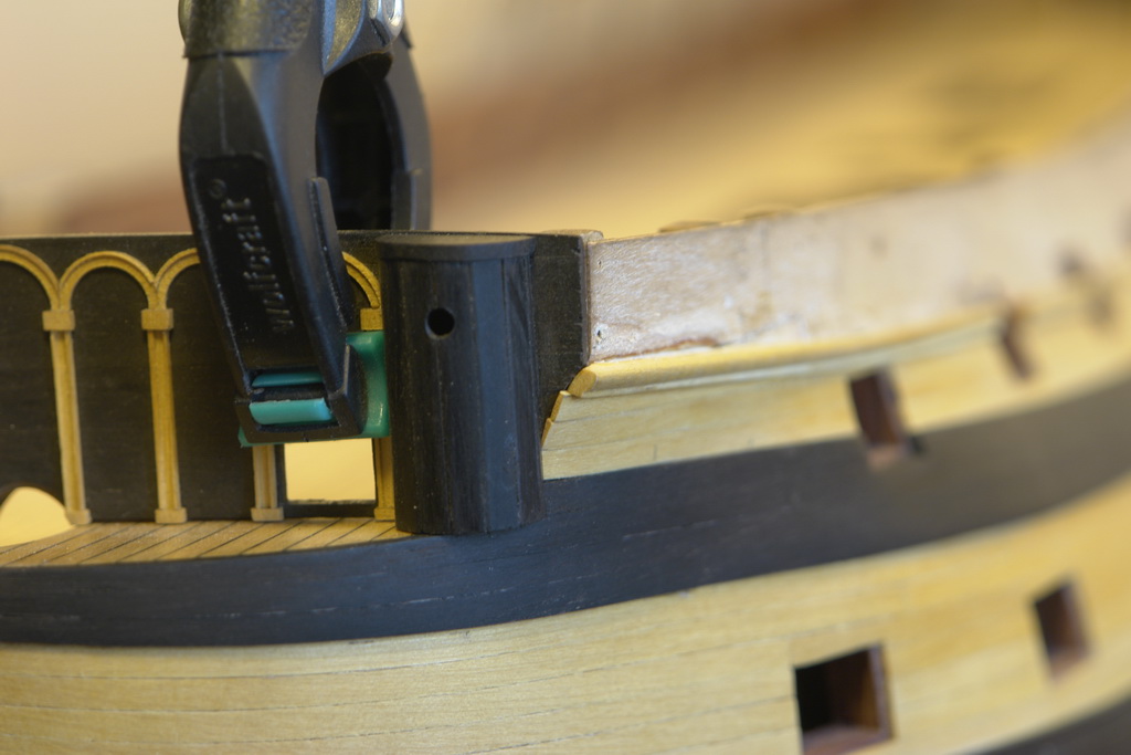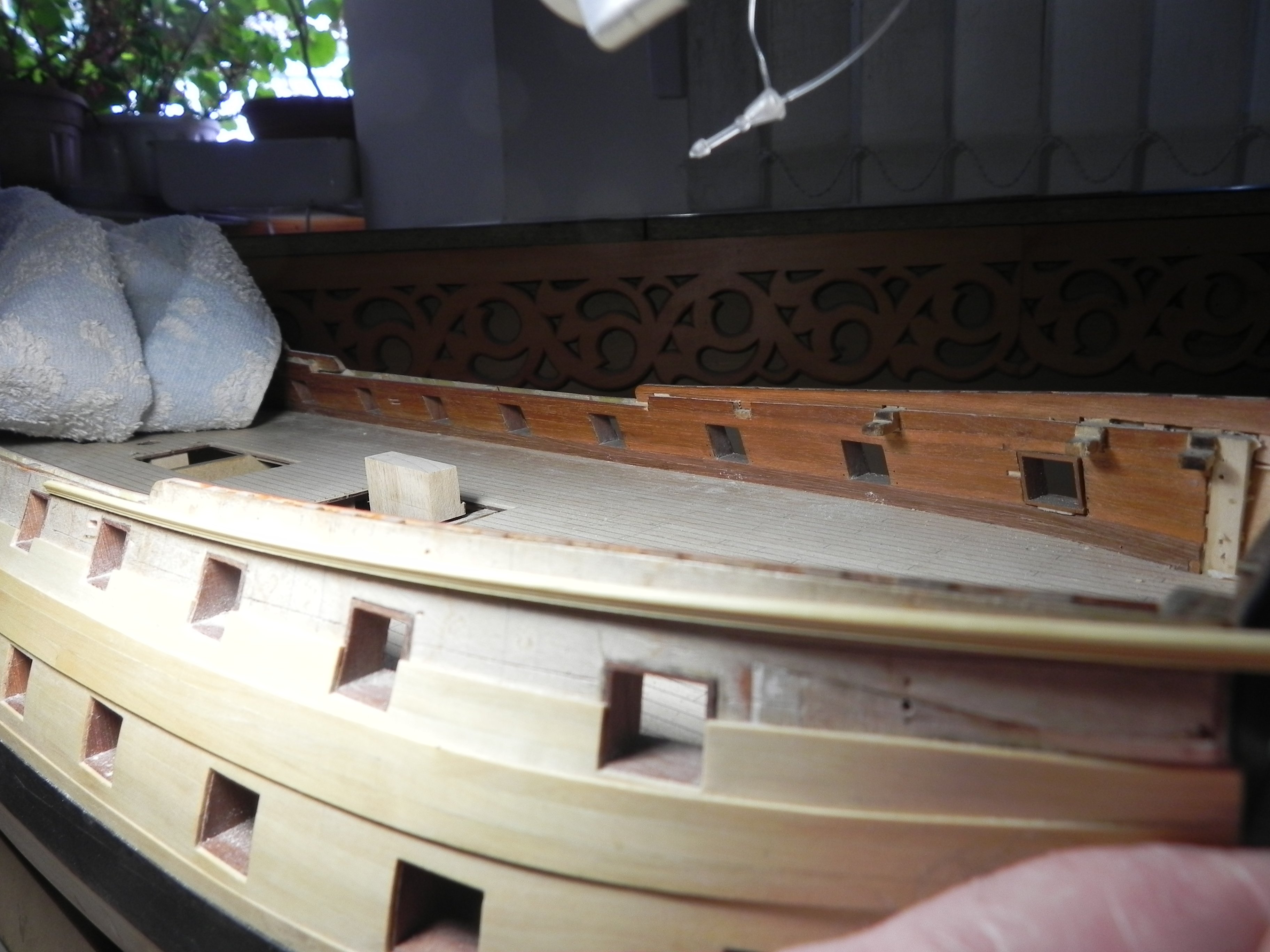 Добрый день. Кто на Vanguard приклеивал фигурные реельсы помогите разобраться. Первый реельс самый широкий ложится везде хорошо, а в носовой части что-то не так. Требуется много усилий, чтобы загнуть , да еще винтом согнуть. На анатомии Беллоны он вроде без особых загибов . И еще. Второй реельс почему то по моей разметке в носовой части подходит к краю борта, а опять же в анатомии до края борта остается много места. Такое впечатление, что борт в носовой части надо миллиметров на 8 поднять. Я понимаю, что у Беллоны и Авангарда может быть разница в чертежах. Игорь, как мне поступить. У Беллоны даже вырезы под пушечные порты есть, действительно кажется , что борт чуть выше. Наверное и я подниму. Второй и последующие реельсы будут уже , приложил первый, поскольку узкие еще не делал
