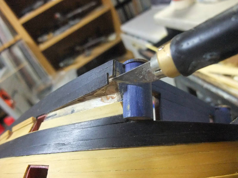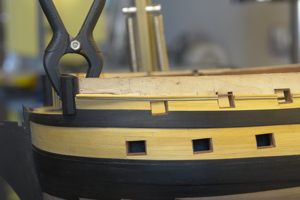 Игорь, спасибо. Борт буду поднимать, в процессе решу на какую высоту. А вот с изогнутым реельсом придется довольно много переделать. Я не очень понял вашу переделку. Посмотрите схемку. По ней придется оторвать рейки самшита до первого пушечного порта, разметить где проходит нижняя кромка реельса и это место будет как раз концом изгиба борта. И верхней кромкой последней самшитовой рейки. Почему я думаю, что нужно рейки оторвать, потому, что изменится кривизна дуги. А потом , когда вставку будет обработана по месту, уже на нее лягут рейки самшита до нижнего края реельса. Как вы думаете.