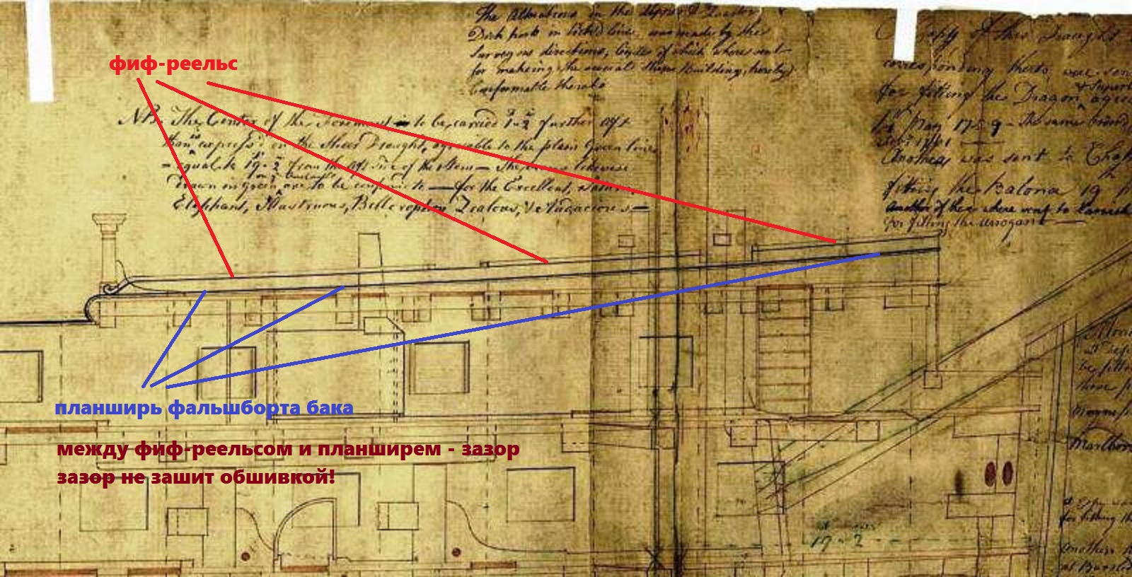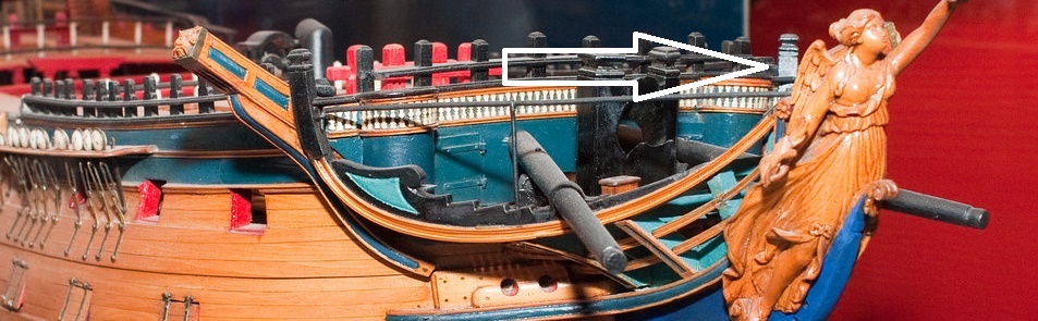Обратите внимание: бимсы надстройки как бы выше своего уровня. Это связано с тем, что разрез на чертеже показан по линии ДП, а по ДП бимсы выше, чем непосредственно у клямсов - из-за погиби палубы. На чертеже показан планширь фальшборта бака, а над ним - условно без топтимберсов - показан фиф-реельс. То есть, это не сплошной борт! Условно совершенно (что и сбивает людей) показаны пушечные порты. Создаётся впечатление, что борт сплошной, однако, это не так. Количество и расположение топтимберсов я описывал чуть ранее.