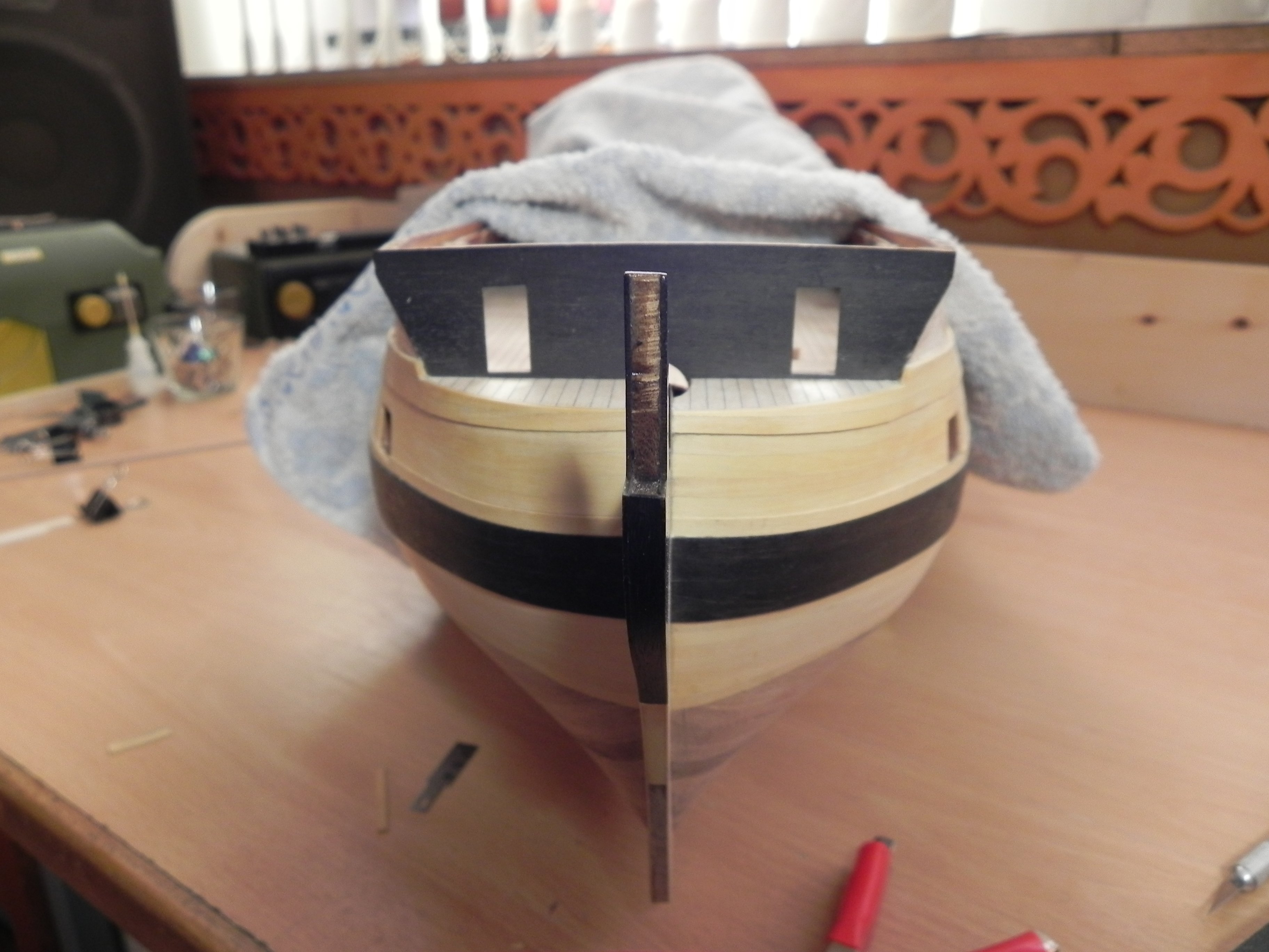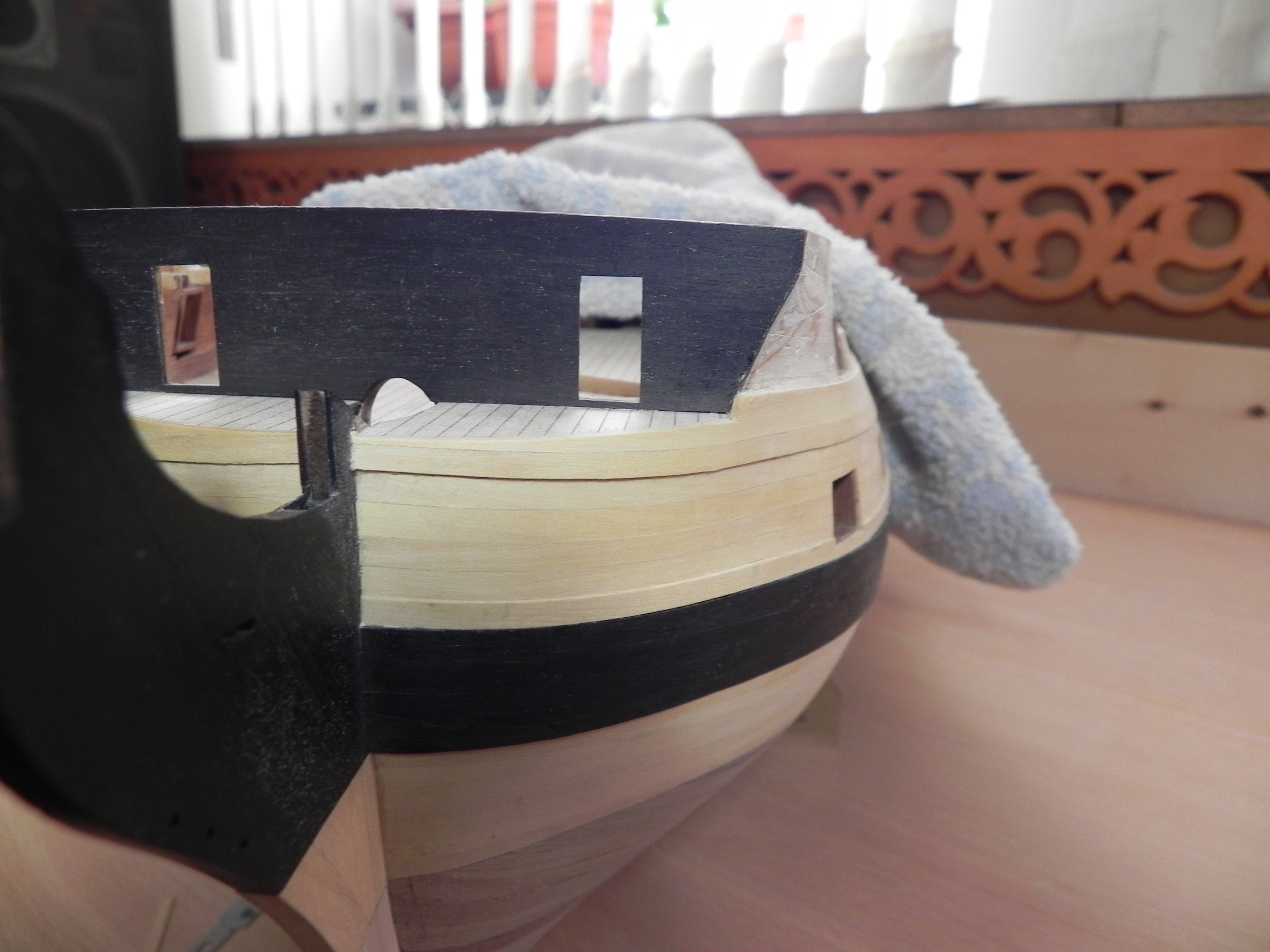 Про то, что оригинальный теоретический чертёж и видение этого чертежа аматиевцами - это две разные вещи, об этом писали много. Кормовая подводная часть корпуса усохла, борт в районе батарейных палуб имеет другой профиль - хорошо заметно по миделю - и плюс ко всему эта проблема с первым топтимберсом бака.