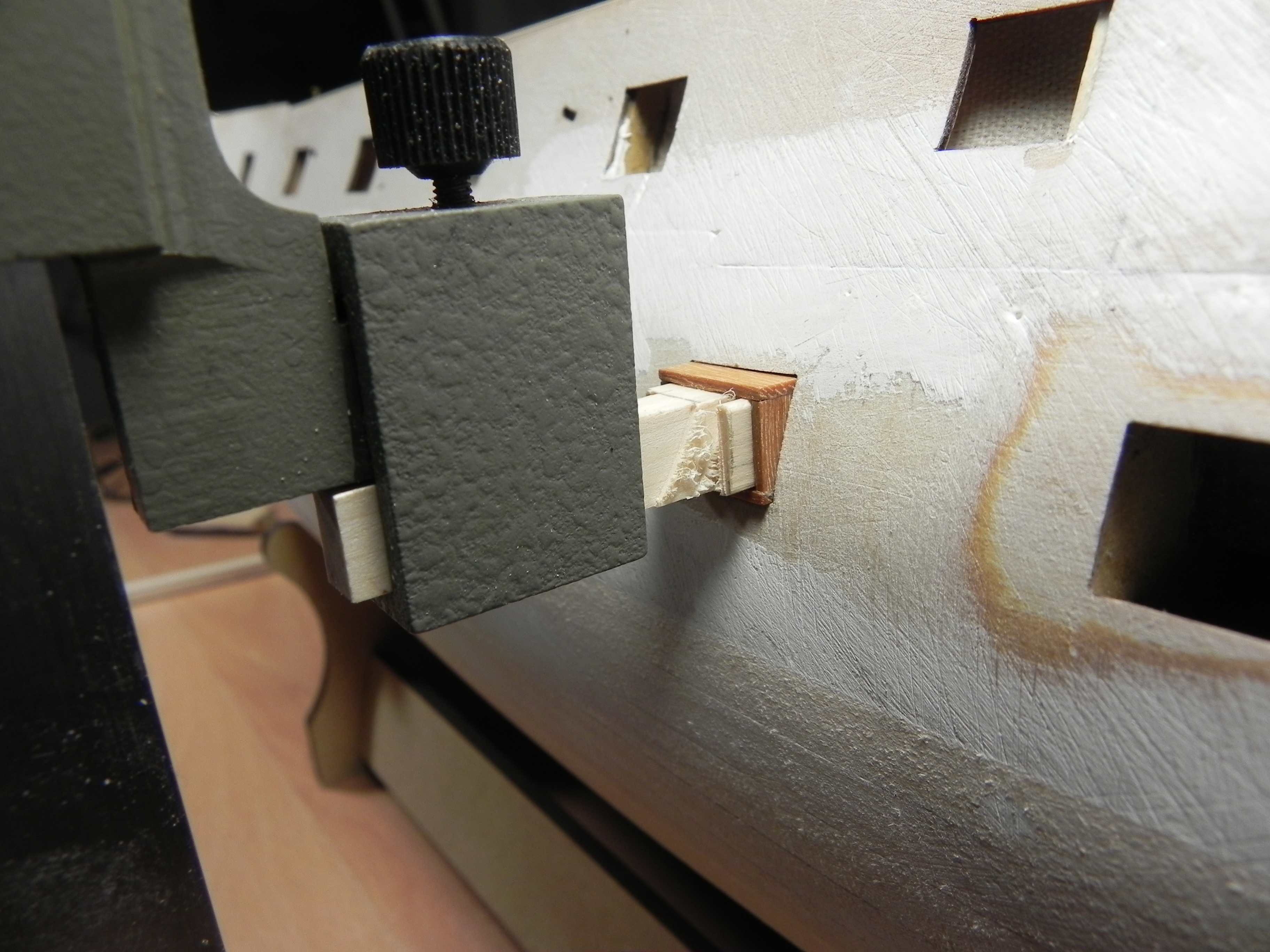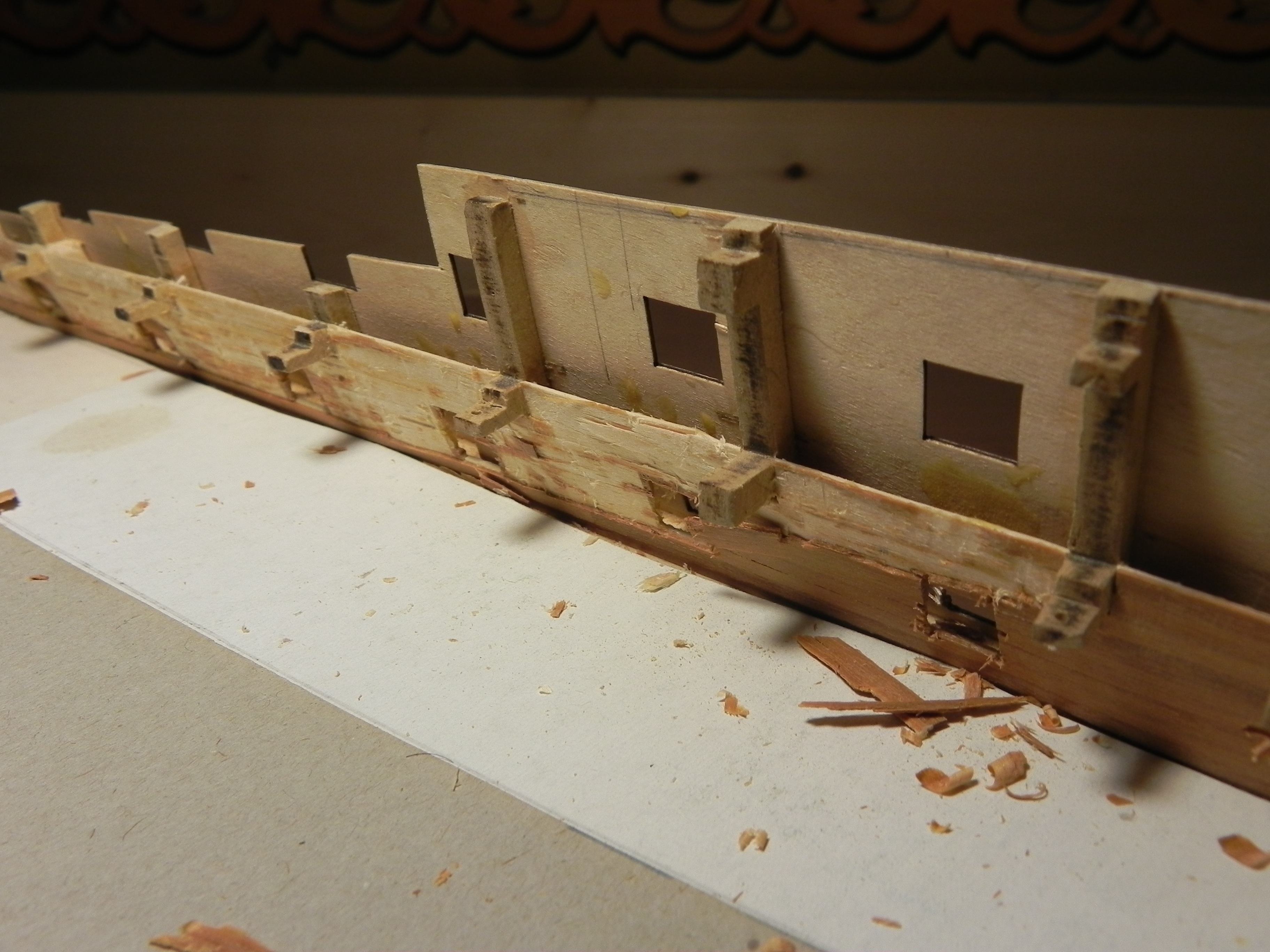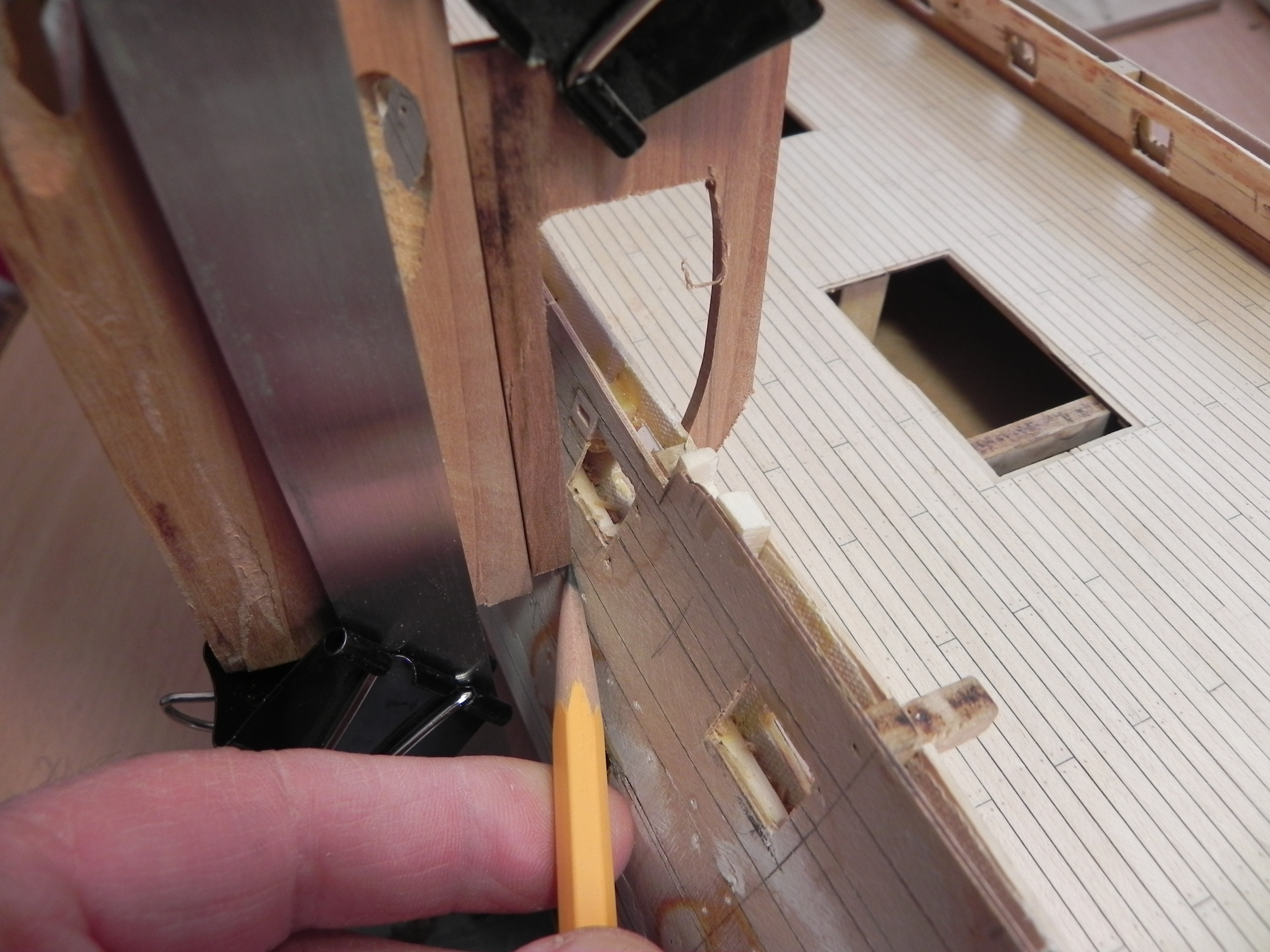 Соответственно, шпунт ("четверть") для крышки пушечного порта надо будет имитировать как на настоящем корабле, не доводя чистовую обшивку примерно на полмиллиметра к краям порта на вот этих самых панелях черновой обшивки.