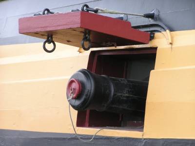 В дальнейшем, когда корабль строили, обшивку к шпангоутам и косякам порта прибивали так, чтобы она слегка не доходила до края: образовывался так называемый шпунт, или паз "четверть", предназначенный для плотного закрытия крышки порта, которая была больше размера на чертеже как раз на этот самый шпунт. Паз, или шпунт, для крышки порта хорошо виден на фотографиях.