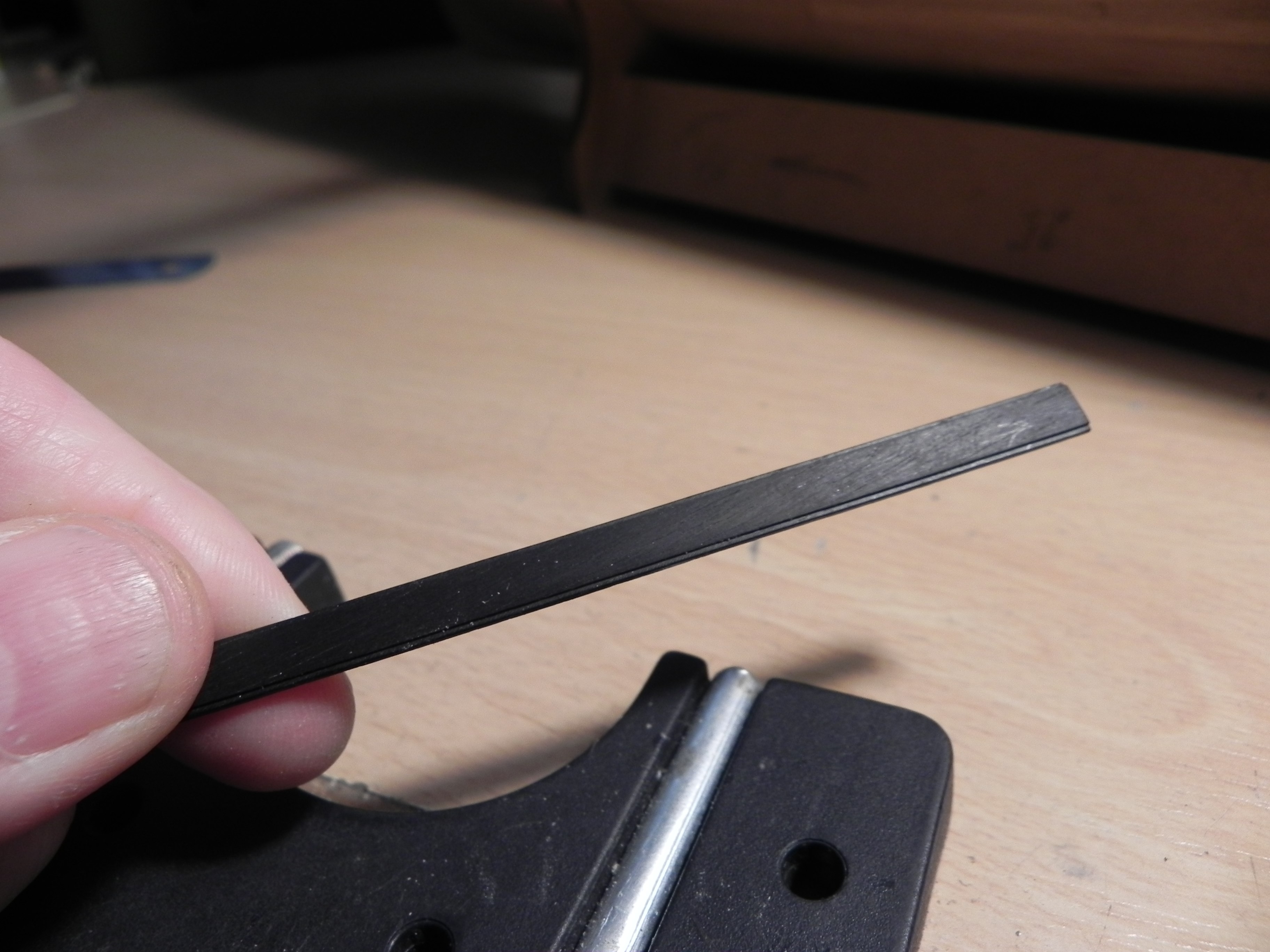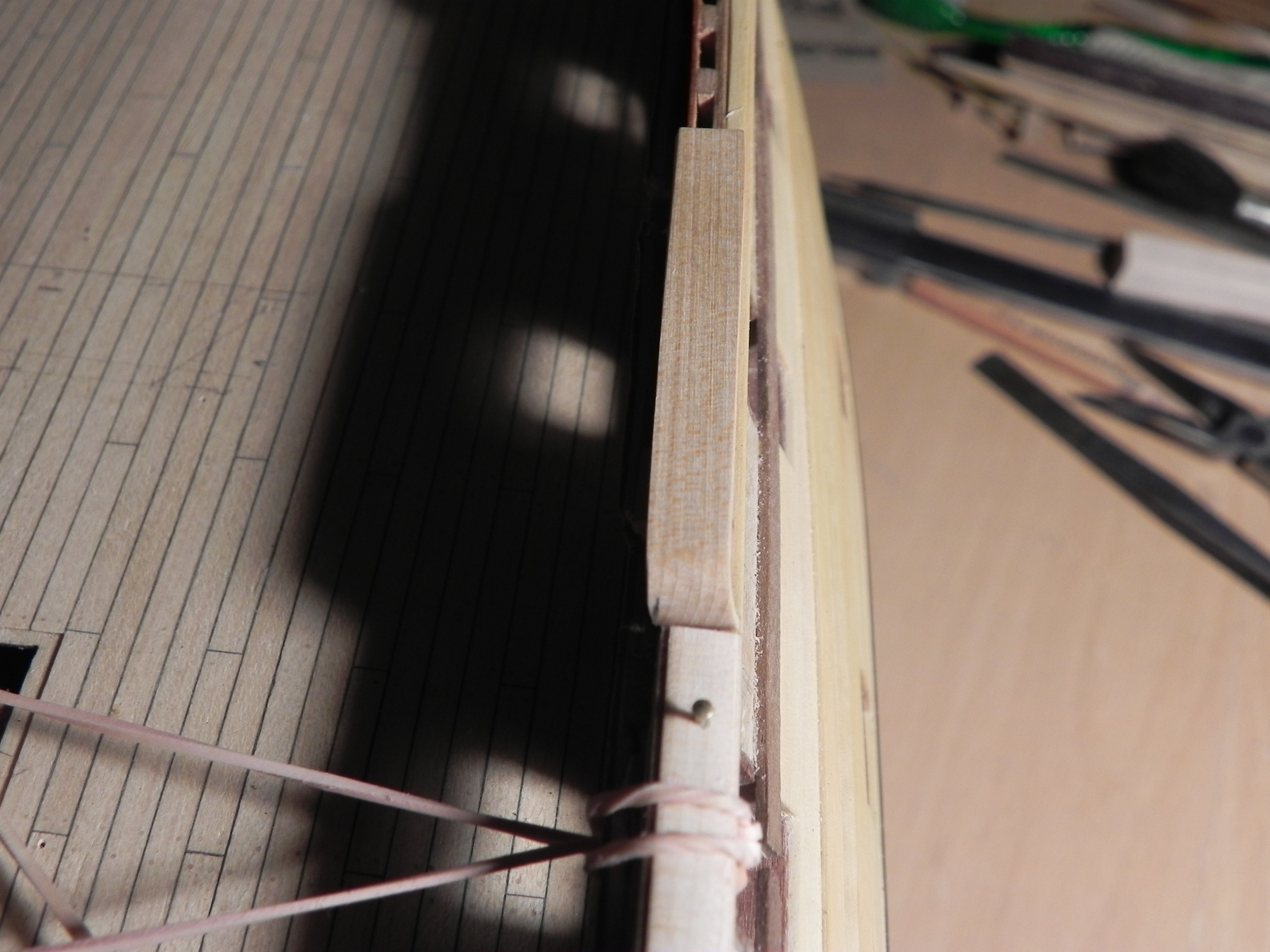 Добрый вечер. Прежде чем клеить чистовую черную , решил поэкспериментировать с самой верхней частью, в районе планширя. Не мог представить, что примерно получится. Планширь будет черный, жалко экспериментировать с эбеном. Довольно сложно выводить кривизну планширя. И что-то не нравится, правда борт в носовой части не поднимал еще. Подсказывайте.
