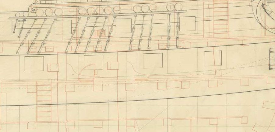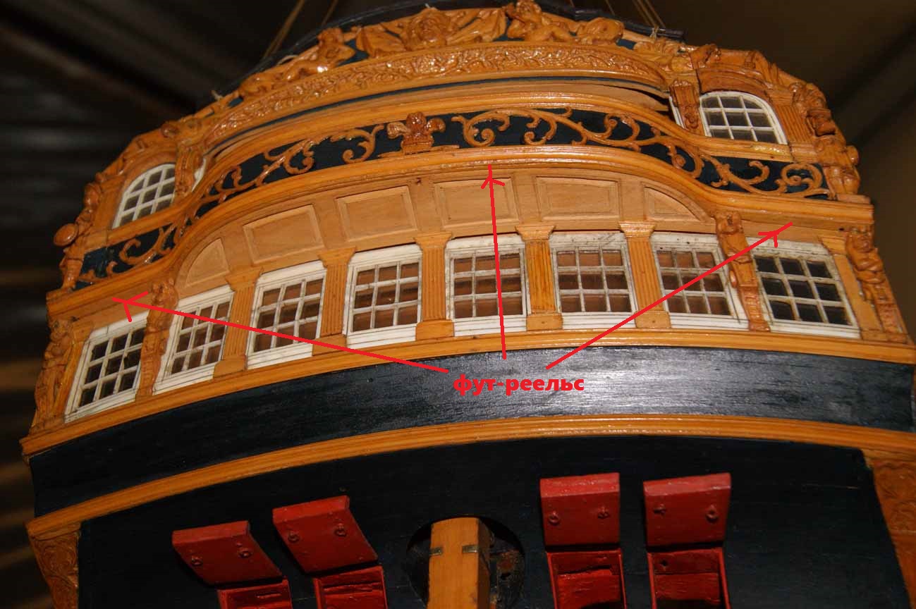 Если коротко, то речь шла о том, что на модели кормовая деталь представляет из себя моноблок из гакаборта и окон галереи опердека. На настоящем корабле гакаборт выступал вперёд по отношению к окнам галереи опердека и имел приличную и хорошо заметную ступеньку в районе фут-реельса.