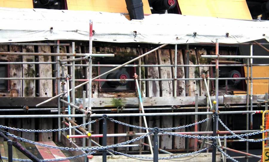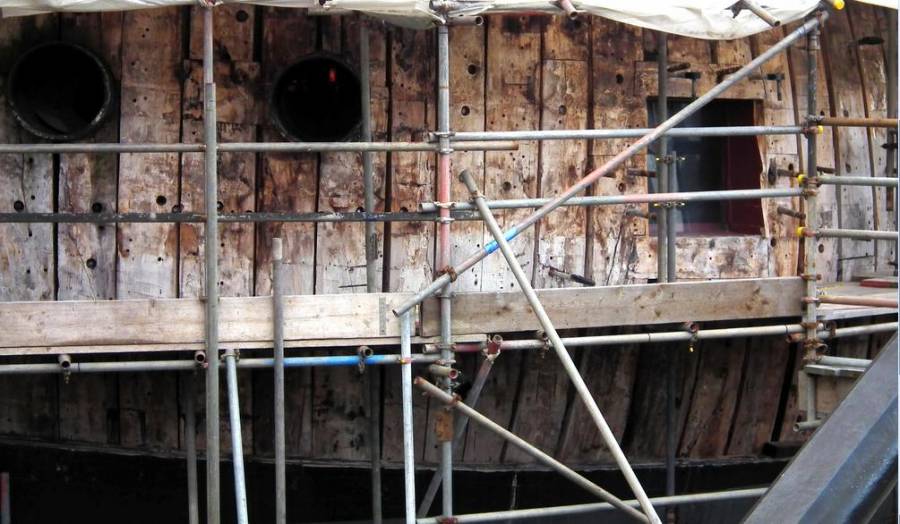 Легко! Есть тысячи фотографий портов Виктори, но все порты выглядят настолько красиво, что трудно сказать, что же там на самом деле мы видим: шпангоуты и косяки, или же некие сосновые дощечки, как изобразил МакКей на чертежах Виктори. Однако, есть фотографии, подтверждающие, что реставраторы в пушечных портах защитили реальные, старинные элементы набора корпуса Виктори накладками. Вот они, фото. При замене обшивки одна такая дощечка повредилась, показав свою неоднородность со шпангоутом.