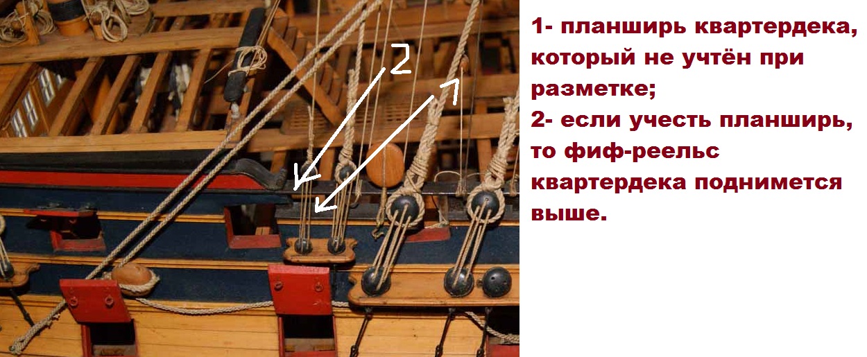 Игорь, когда я размечал где пойдет фиф-реельс, то ставил планширь, а от него делал разметку фиф-реельса-3мм. Как раз перед этим вы напоминали мне размеры. Расстояние от планширя до фиф-реельса 2,8 мм, я сделал 3мм. Оставлю так.
