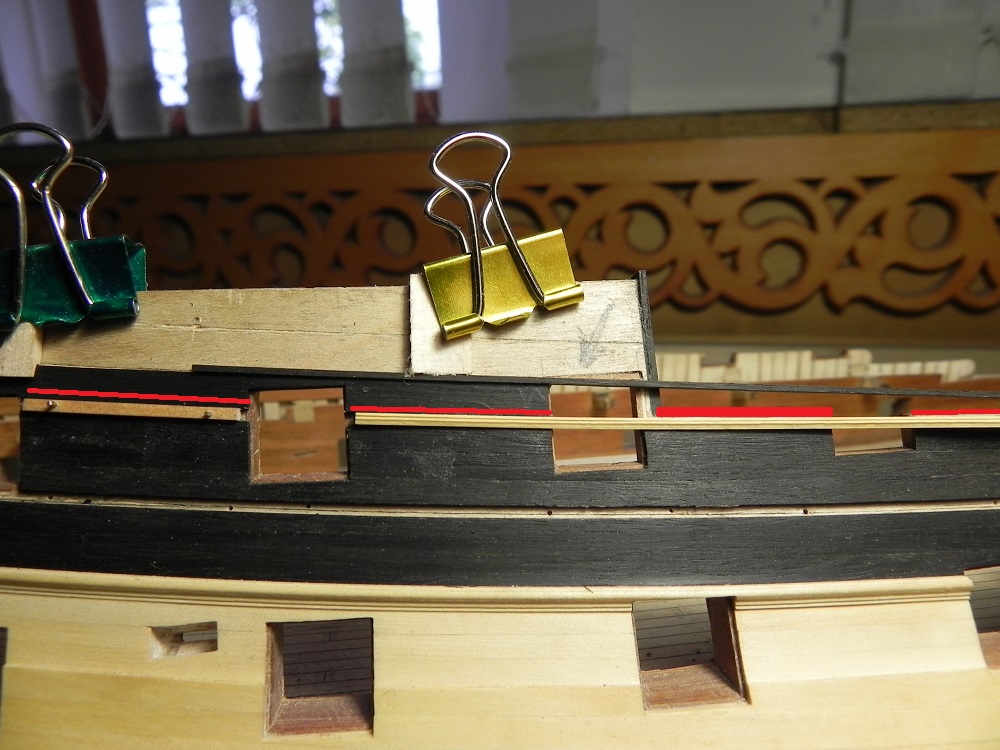 Игорь, добрый вечер. Да, наверное все так, но сразу вопросы. Я не пробовал на сверле 5мм гнуть эбен, даже не представляю, как это сделать. Так, что опять придется точить трубочку с внутренним диаметром 5 мм. Гнуть было бы лучше, и волокна по ходу, и из-за длинных концов проще держать при обработке , но опять же не знаю, как согнуть эбен. У меня есть черный граб, если все планшири сделать из него, по цвету почти одно и тоже, только структуру , конечно, заметно. Но это так, фантазия. Я почему то все время рассматривал подгонку этой загогулины сначало к верхнему планширю, и мне понравилась идея начать подгонку внизу. Спасибо. Планшири бака я зафиксировал, просверлил пару отверстий в местах, где будут топтимберсы, это Павел посоветовал. Планширь шкафута также надо зафиксировать, но пока их не сделал. Завтра возьмусь за них. Как сделаю, покажу. Игорь, спасибо за возьню со мной. Поддержка это великое дело.