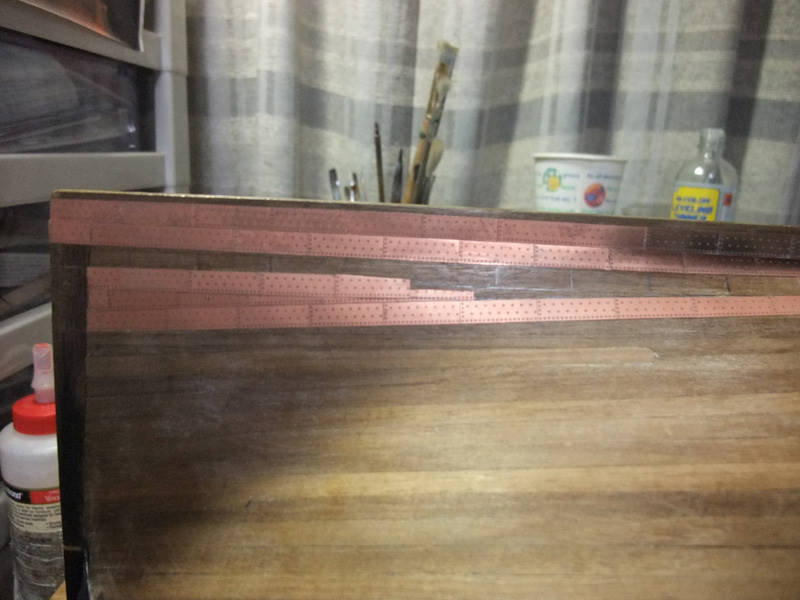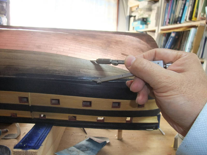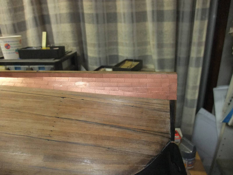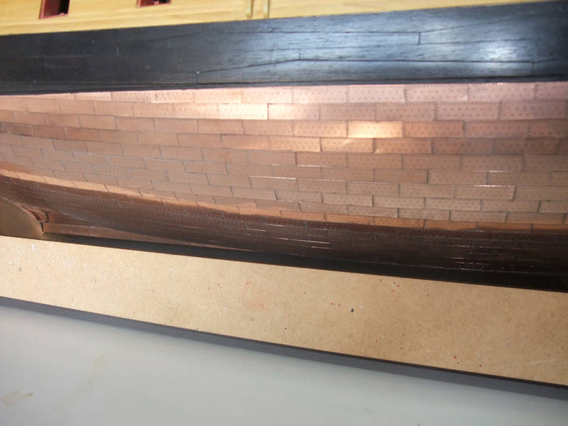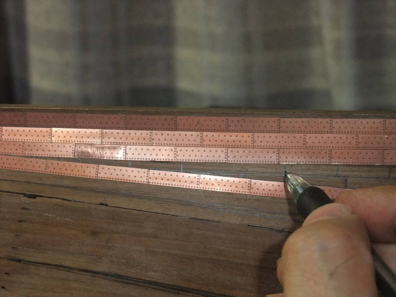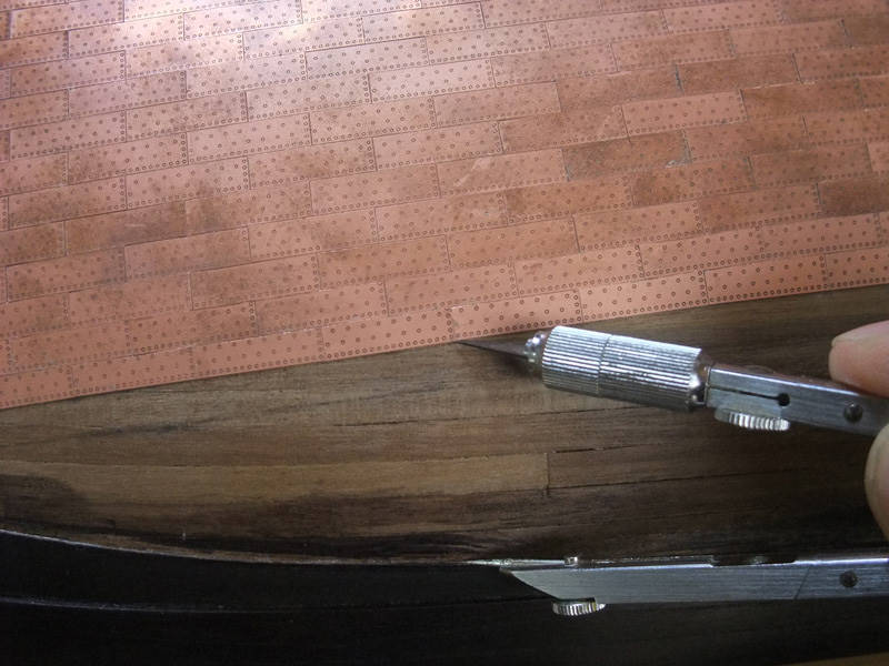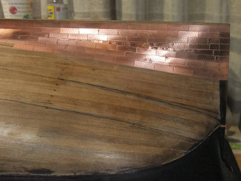 Так же встанет вопрос, как обшить район шпунта у киля - на модели здесь резкий переход от киля к корпусу. Однако, на живых кораблях просто гнули медь, ведь в реальности там не было "ну уж очень резкого" перехода, а медь мягкая и тонкая.