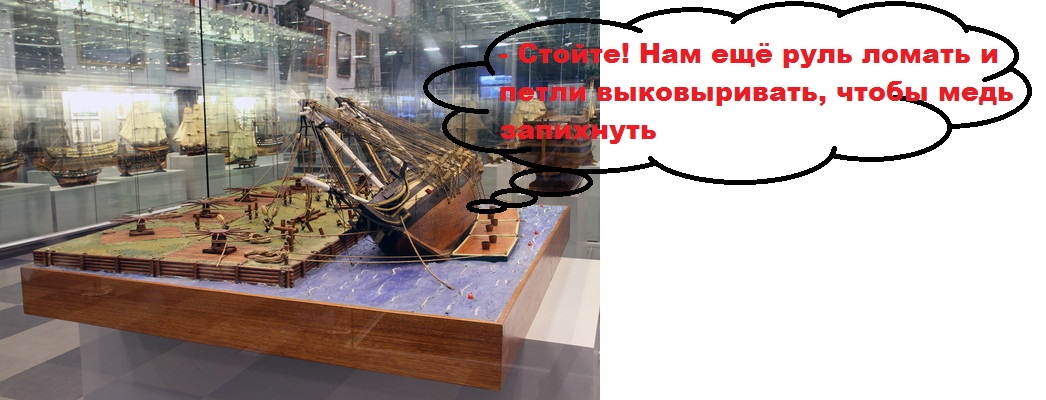 Та же песня с килем. Он обшивался последним, края пластин подгибались на боковые стороны. Потом к килю прибивался с помощью бронзовых скоб фальшкиль, обшитый отдельно.