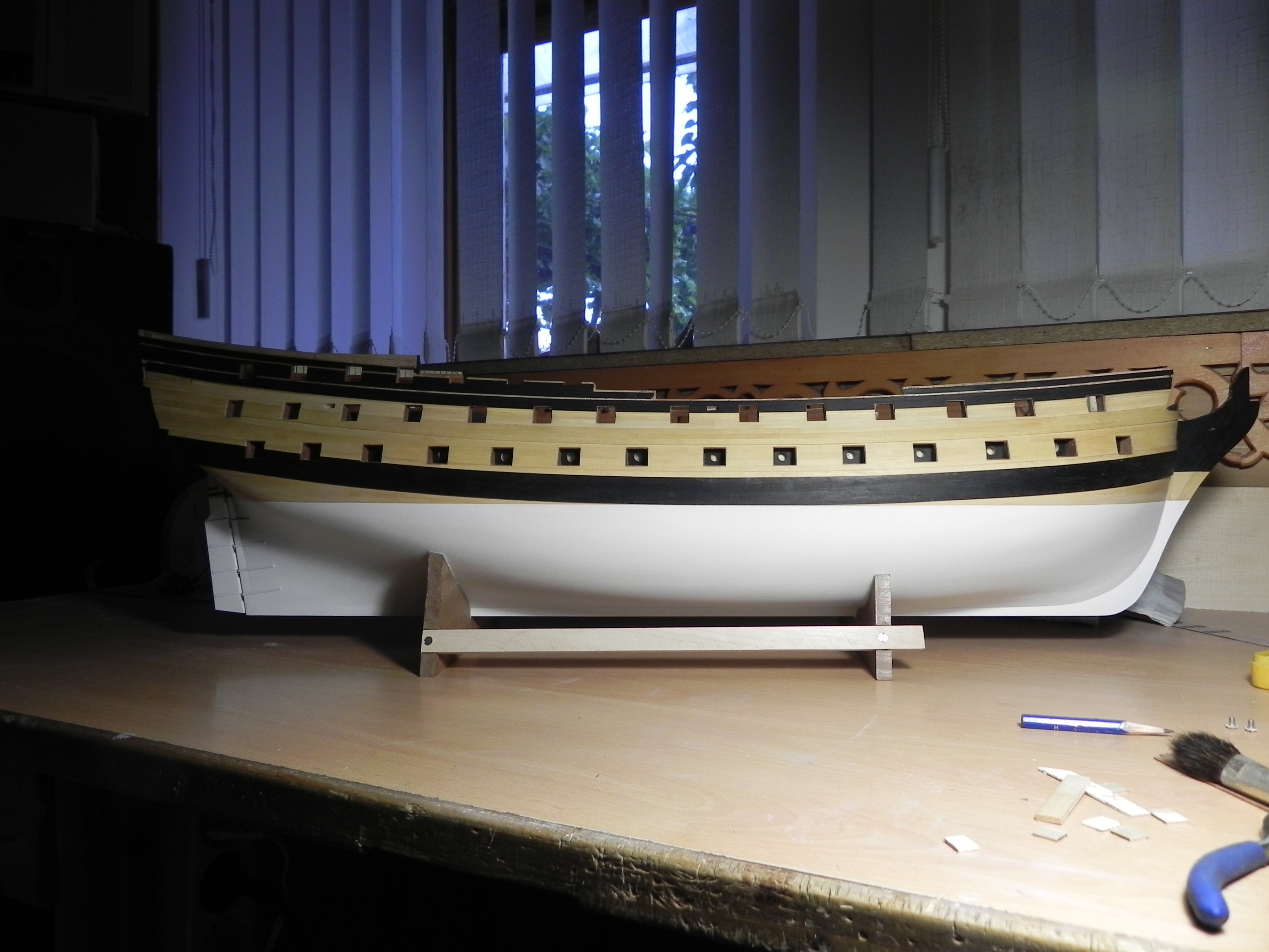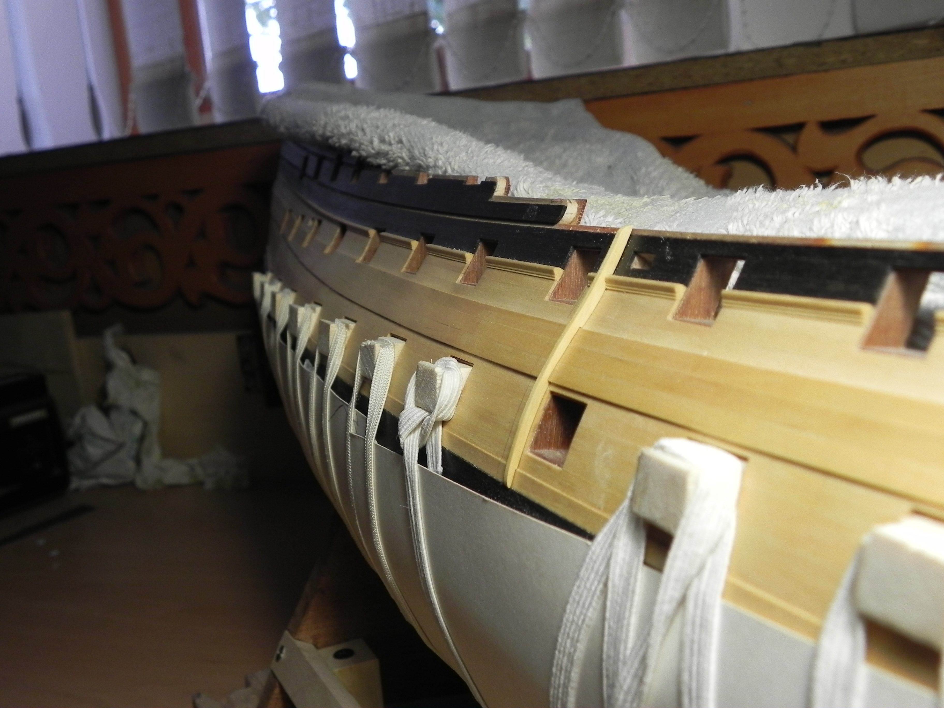 В планширь врезать не надо, сделайте фендерсы "под планширь", как на фото ниже. У тех моделей, где фендерсы как бы врезаются в планширь, на самом деле даже у них планширь не тронут, фендерс подрезан под профиль планширя. "Планширь - это святое, он шпангоуты держит" - кто-то из великих. Делать чуть выше или чуть ниже, судя по чертежам и музейным моделям, было дело вкуса самих корабелов - даже ближайшие "сёстры" имеют отличия, видимо, это не регламентировалось строго.