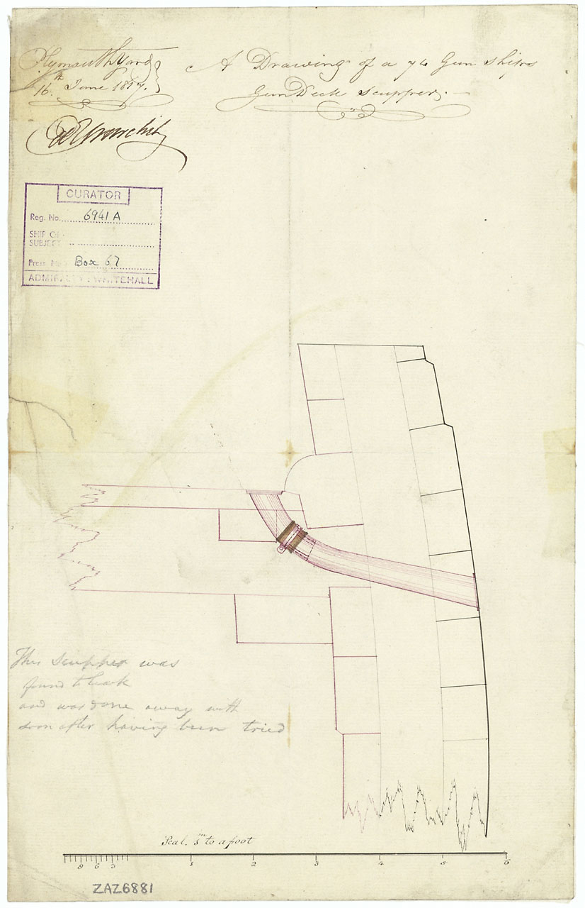Миша в курсе, но, думаю, и остальным коллегам будет интересно знать. Внутренний диаметр шпигата был 4 1/2 дюйма. То есть, в масштабе это будет 1,58 мм. Существует исторический чертёж шпигата "систершипа", Рамиллиес. Схема размещения шпигатов была показана мной в данной теме чуть ранее.