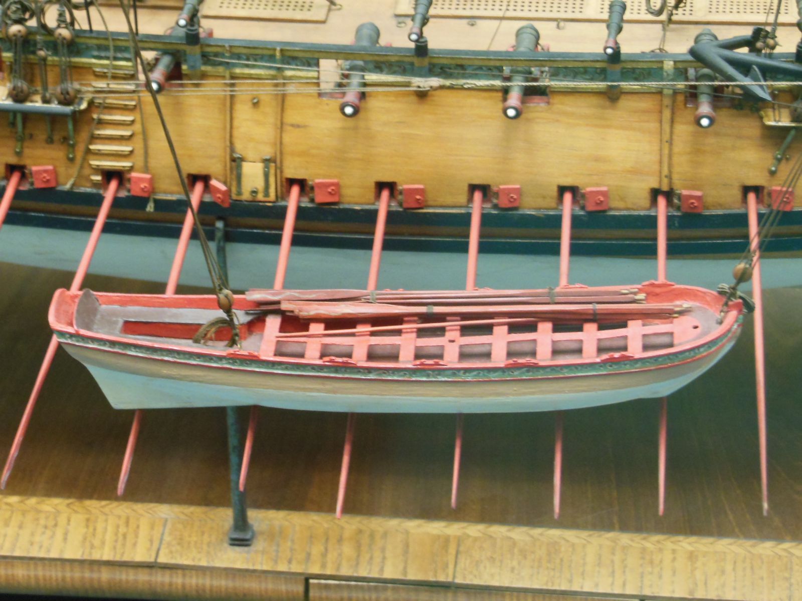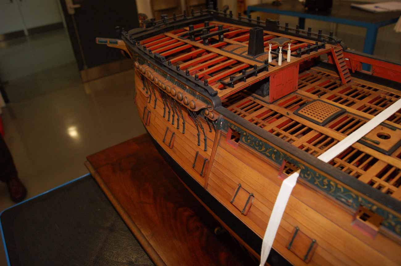 Исключения - музейные модели Геркулес (фото из прошлого сообщения, там фендерсы не окрашены под фриз вообще), Канада (фото выше,фендерс с галс-клампом не окрашен под фриз, мидель-фендерсы - окрашены), и Уорриор (фото ниже, у него фендерсы правого борта покрашены частично, то есть, часть чёрного фриза есть, часть синего фриза на фендерсе то ли выгорела, то ли стёрлась при реставрировании, но есть следы от орнамента, а вот на левом борту фендерсы окрашены по всем правилам - а это 1781 год, то есть, нам не отвертеться).