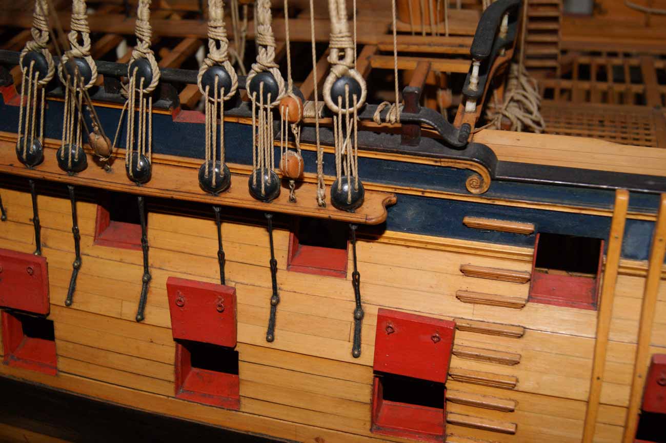 Итак, болты фендерсов в 18 веке на английских линейных кораблях были спрятаны под пробками. Да это и логично, вспомним, для чего фендерсы предназначены. Единственная головка, да и то, практически не встречается на музейных моделях, это ось шкива галс-клампа. Только (внимание!) не надо путать со штифтами, на которые ставили фендерсы на музейную модель сами авторы модели. Ведь хорошо известно, что приклеить надёжно столь хитрые детали в нашем и более масштабах практически невозможно, если не применить некие, чаще всего металлические, штыри.
