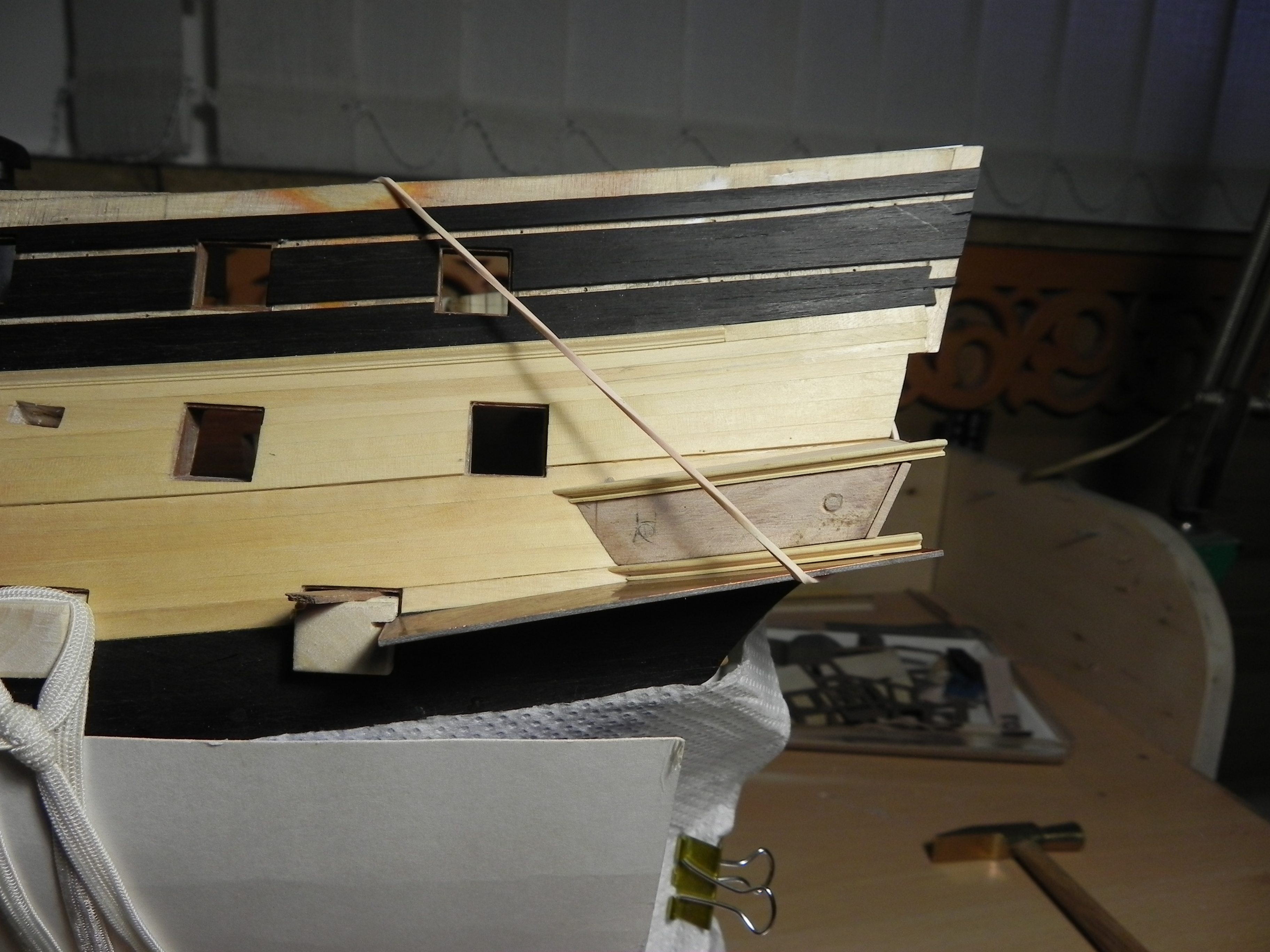 Основной цвет вашей галереи - чёрный. Раковины боковых галерей, подзоры, контр-тимберсы между окон - всё чёрное. Я обратил в своё время внимание, что, если тимберсы между окнами снаружи имеют какой-то определённый цвет, синий, красный, чёрный, охряной - то и по граням тимберсов тоже идёт этот цвет. Таким образом, контр-тимберсы будут полностью чёрные. Оконные рамы, конечно же, вовсе необязательно должны быть охряными, были и белые рамы. Как на модели Геркулеса. Очень смотрится. У вас уже получится три контрастных цвета. Кстати, вы упоминаете декоративные накладки на контр-тимберсы, "колонны" - вот на Геркулесе они, как раз, охряные, хотя оконные рамы - белые. Но, если же сделать "колонны" традиционно белыми, то корма будет выглядеть торжественно-благородной, с ноткой этакого величия: всё строго черное и классически-уставное белое.