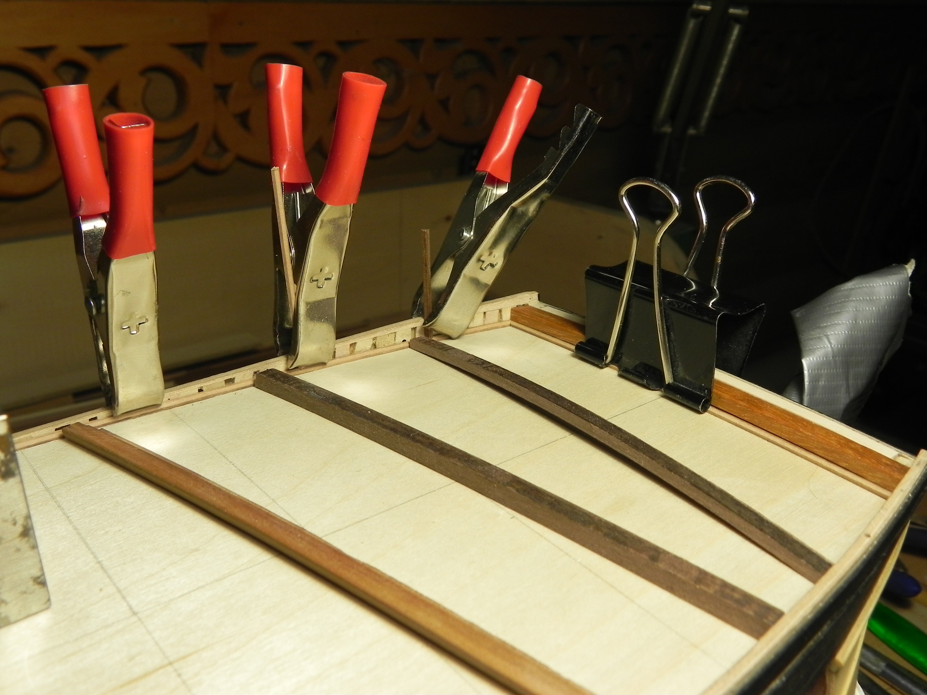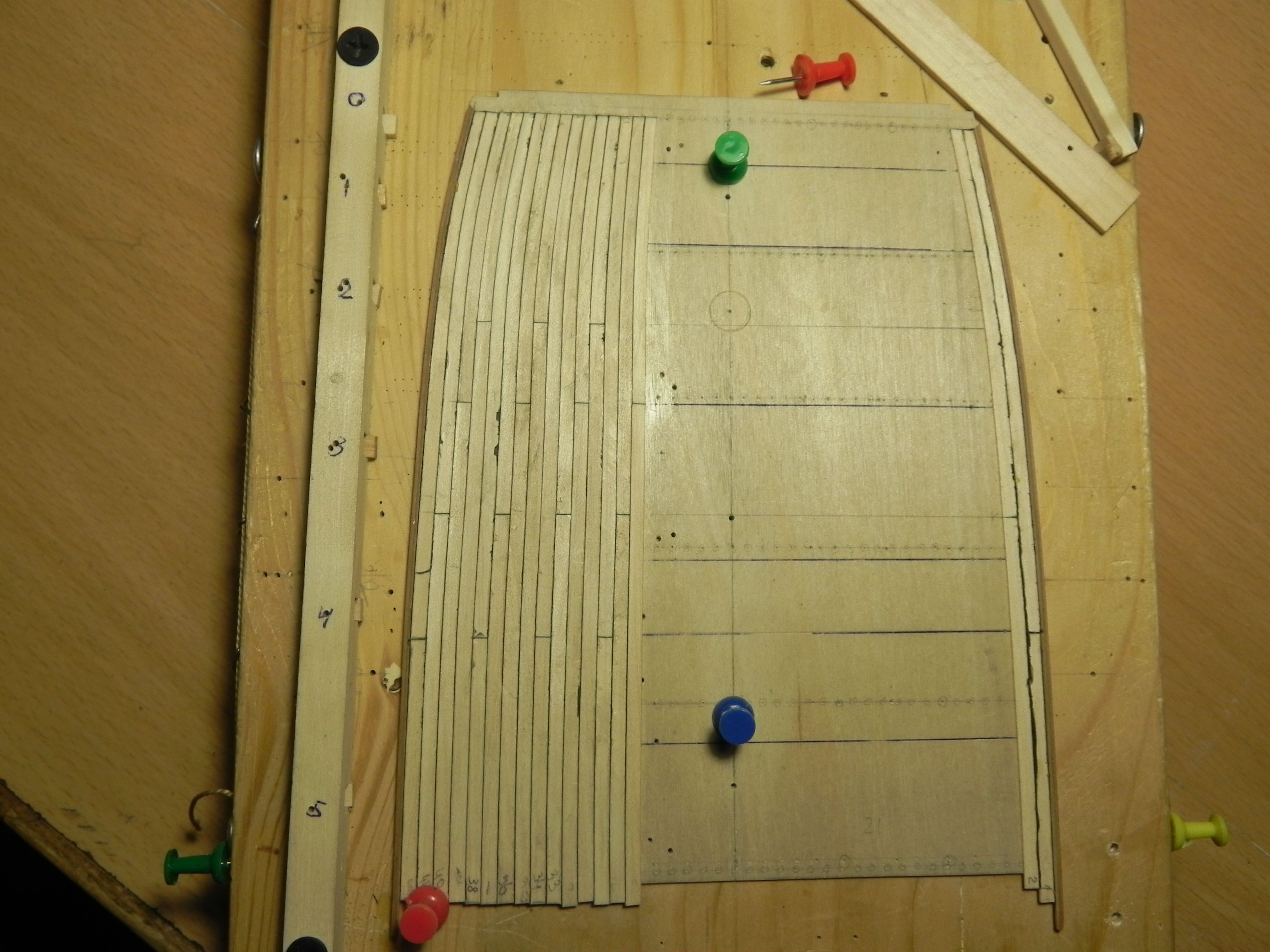 Добрый вечер. Начал стелить палубу в носовой части. Решил это делать не на месте. Выпилил подложку из 1 мм фанеры и к ней на месте приклеил ватервейс, чтоб от него точно сделать разметку для реек. Рейки сделал из местного клена, магазинный не понравился, имеет глубокие раковины, не вышкуривается. Сделал такое приспособление, потратил пол дня, зато очень удобно и под прижимы каждой рейки не надо сверлить много отверстий. Квадратные брусочки 5х5мм плотно перемещаются в основании, не имеют почти люфта, так что они сразу прижимают рейку в двух направлениях и к боковой рейки и к основанию. Рейки сначала подгоняю маленьким рубаночком, потом гну утюгом без воды, клею черную бумагу тоже с утюгом, чтоб быстрей и уже клею на место и прижимаю.