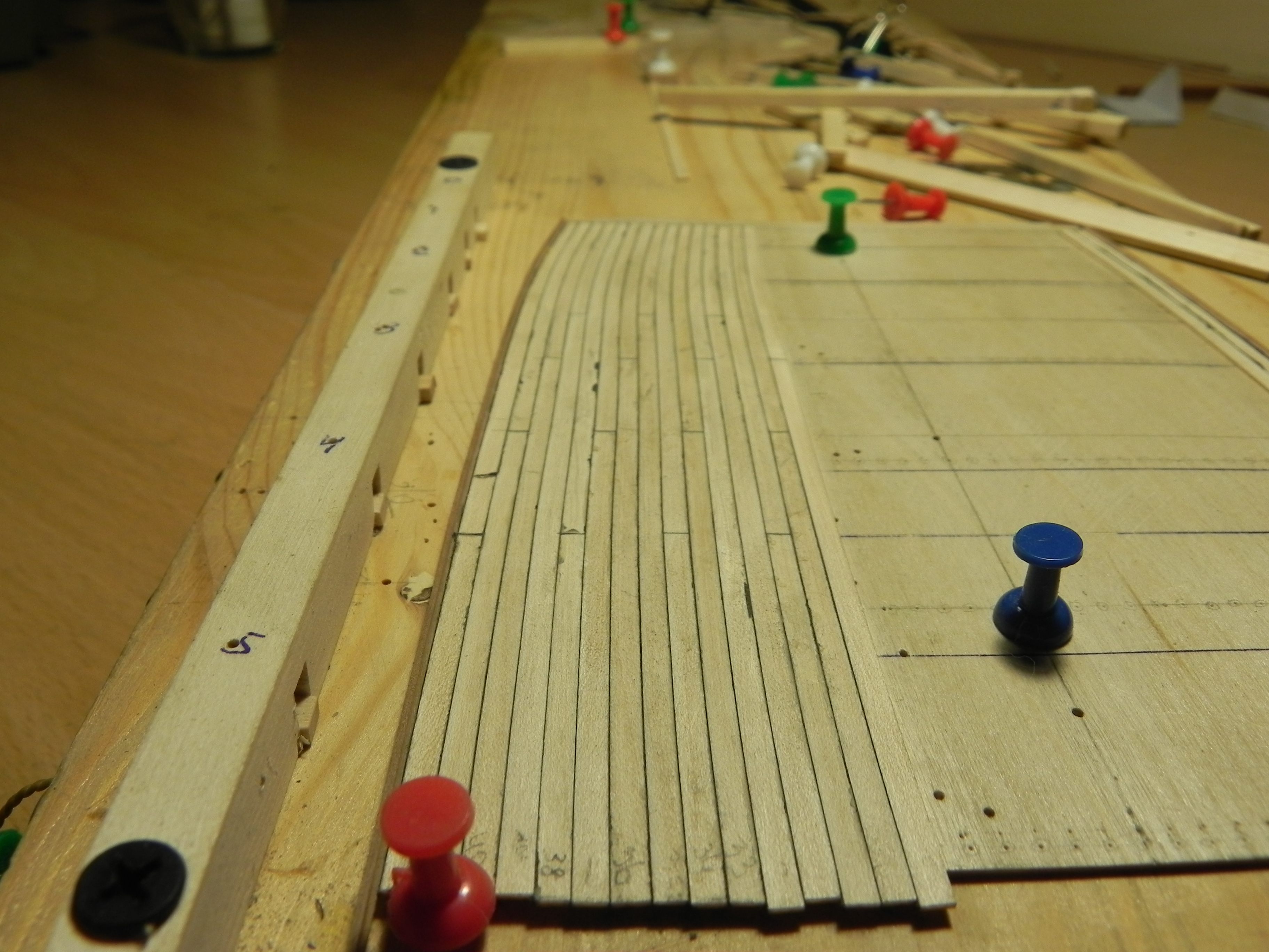 Спасибо, Михаил! Думаю обязательно использую Ваш опыт.Михаил Комаров писал(а):... Прижал рейку палубы, натянул брусок и на конец его грузик какой- нибудь положить, прижать к рейке. А чтобы брусок крепко прижал рейку к другой рейке, кнопкой зафиксировать брусок в направляющей основе. ...