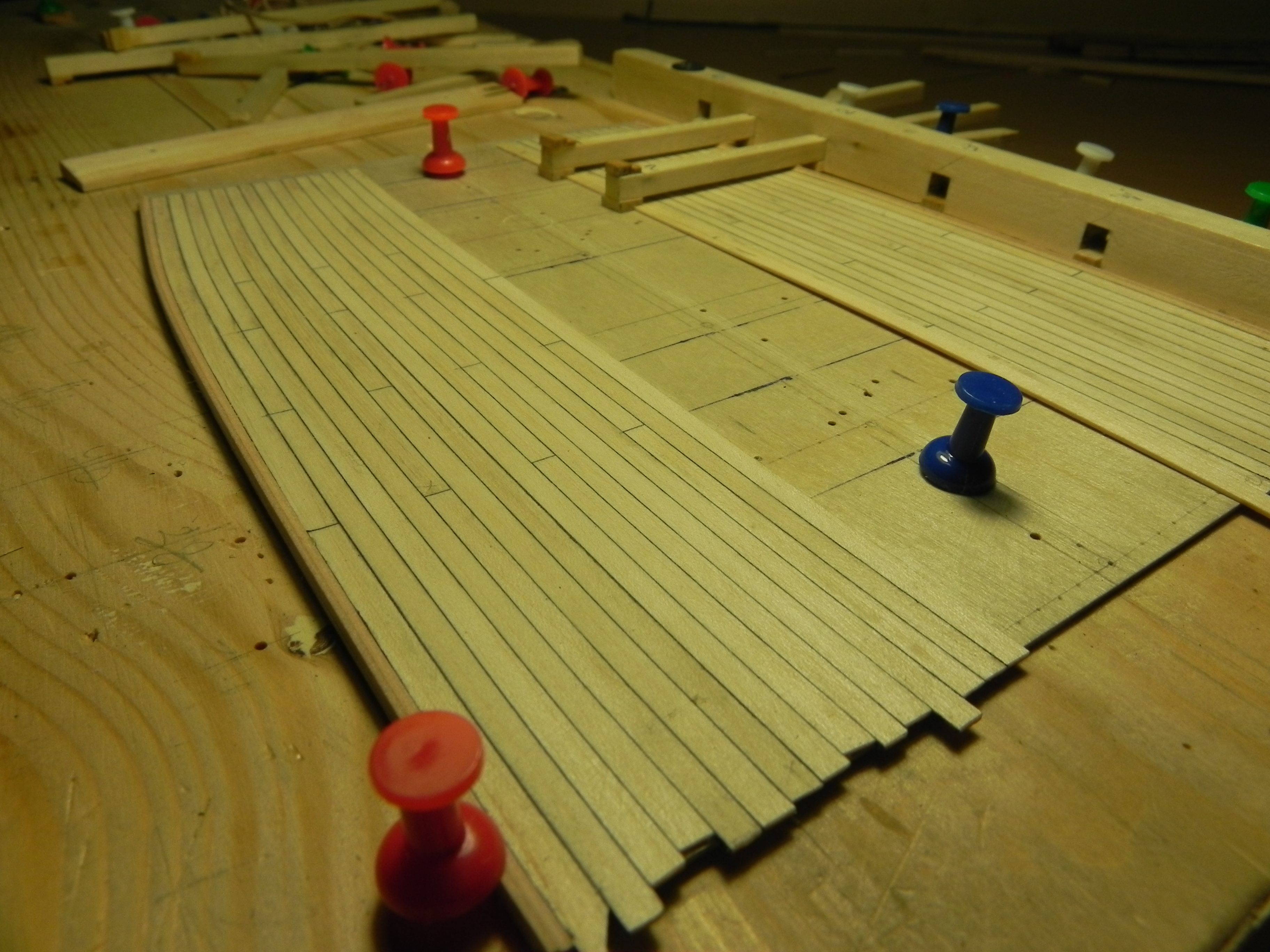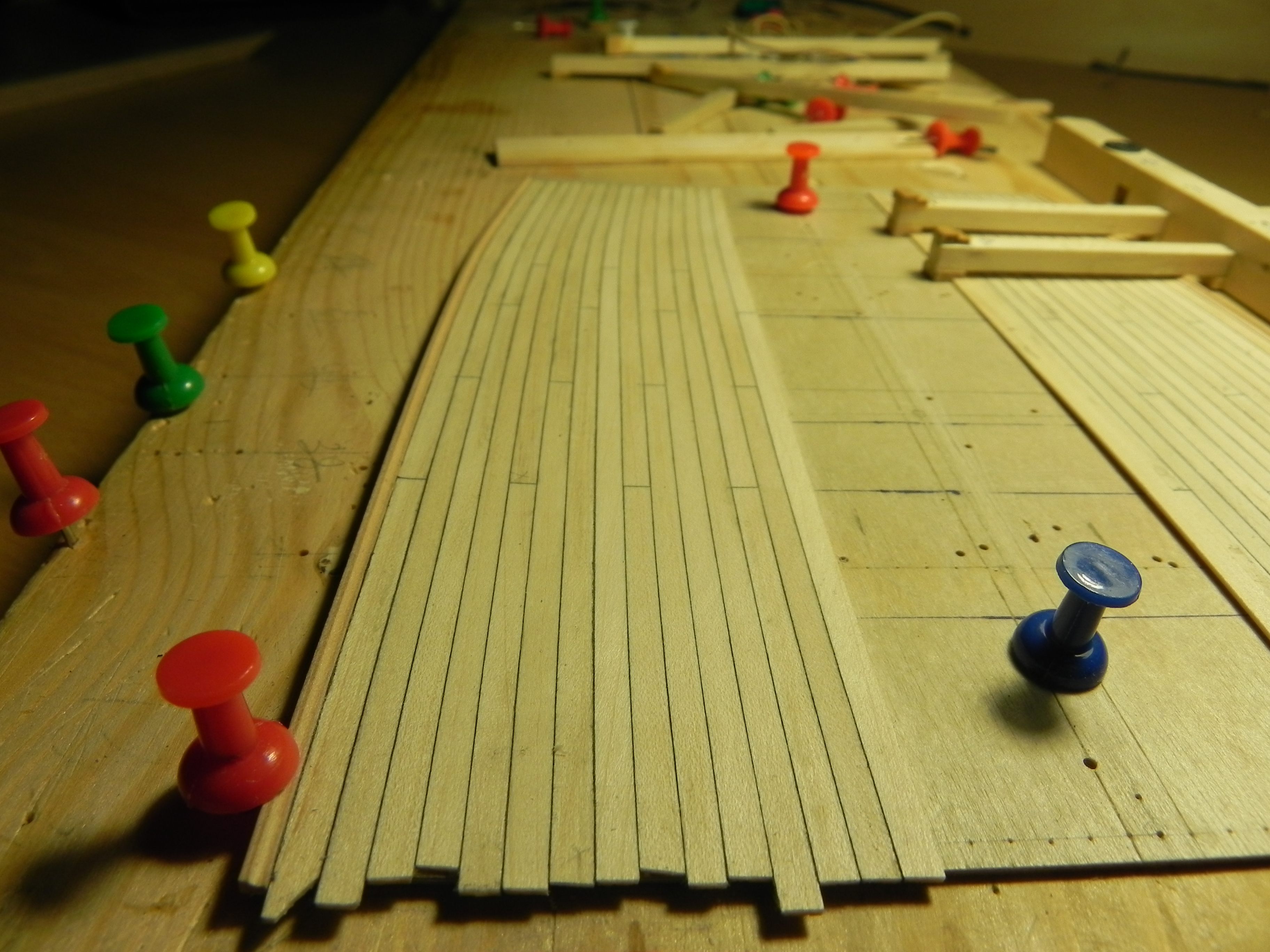 Добрый вечер. Работаю медленно и мало, вот что сделал. Переделываю палубный настил вторично, первый раз не понравилась работа. Сейчас лучше, рейки ровнее ложатся. Не обрабатывал, после шкурки, думаю будет смотреться лучше.