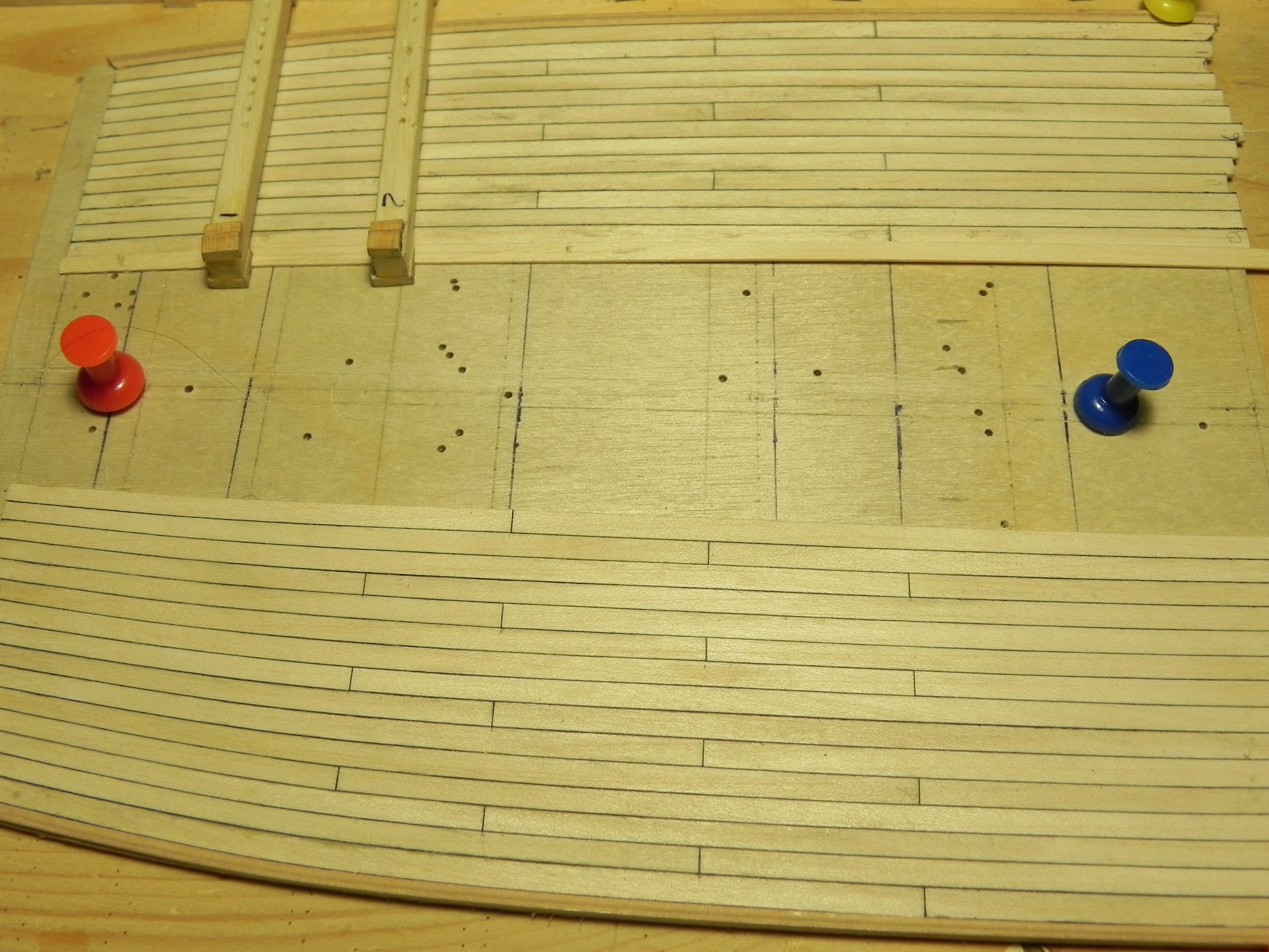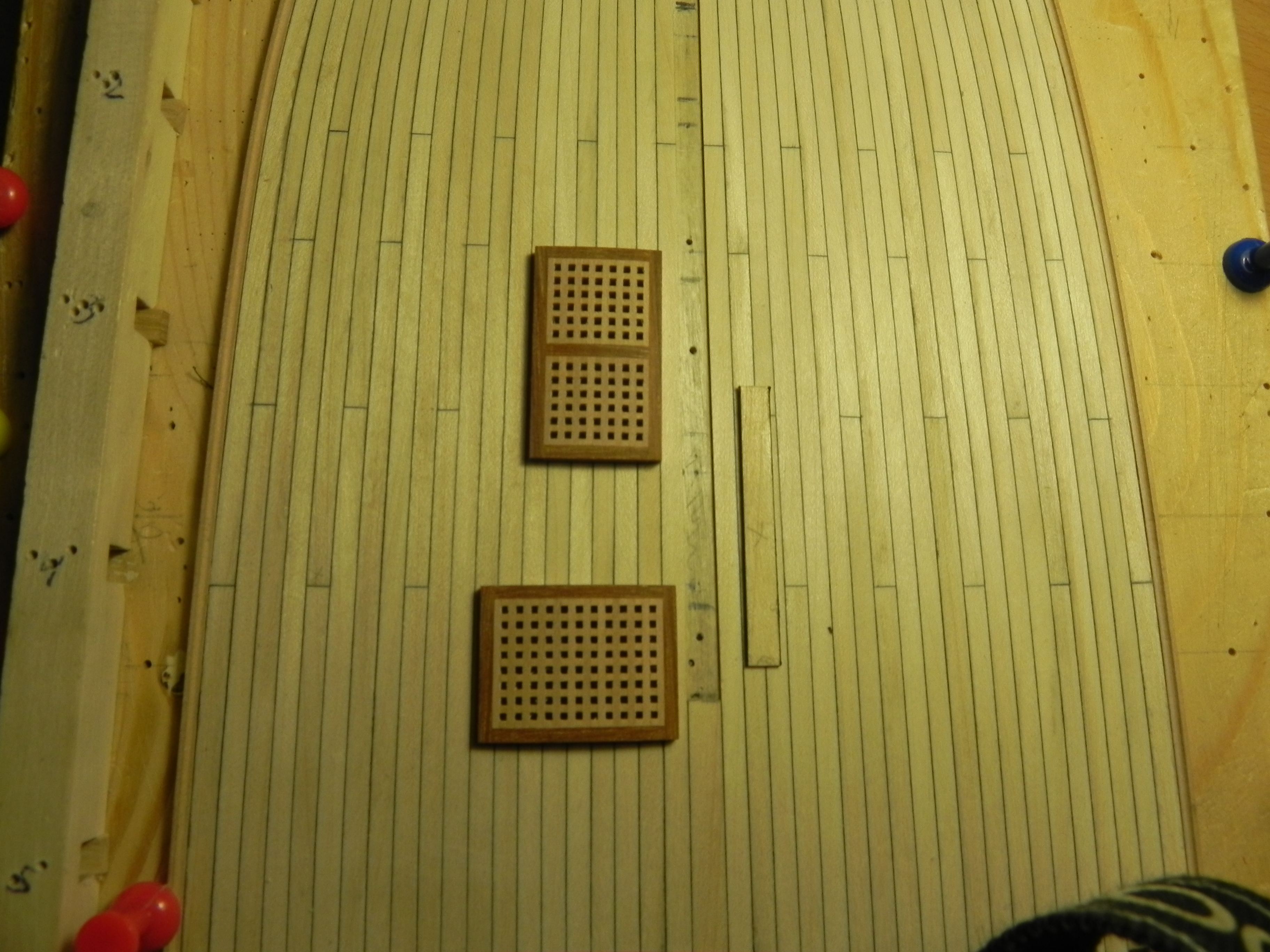 Игорь, я размечал только относительно гвоздевания, чтобы чопики проходили по торцам решеток. Не стал делать как на нижней палубе, где сначала разместил решетки, а от них уже пошли доски. Здесь решетки лягут на настил, а уж как получится. На этой палубе идет заужение досок и трудно сделать верный расчет.Да и фото много смотрел, там тоже люки лежат просто на досках.