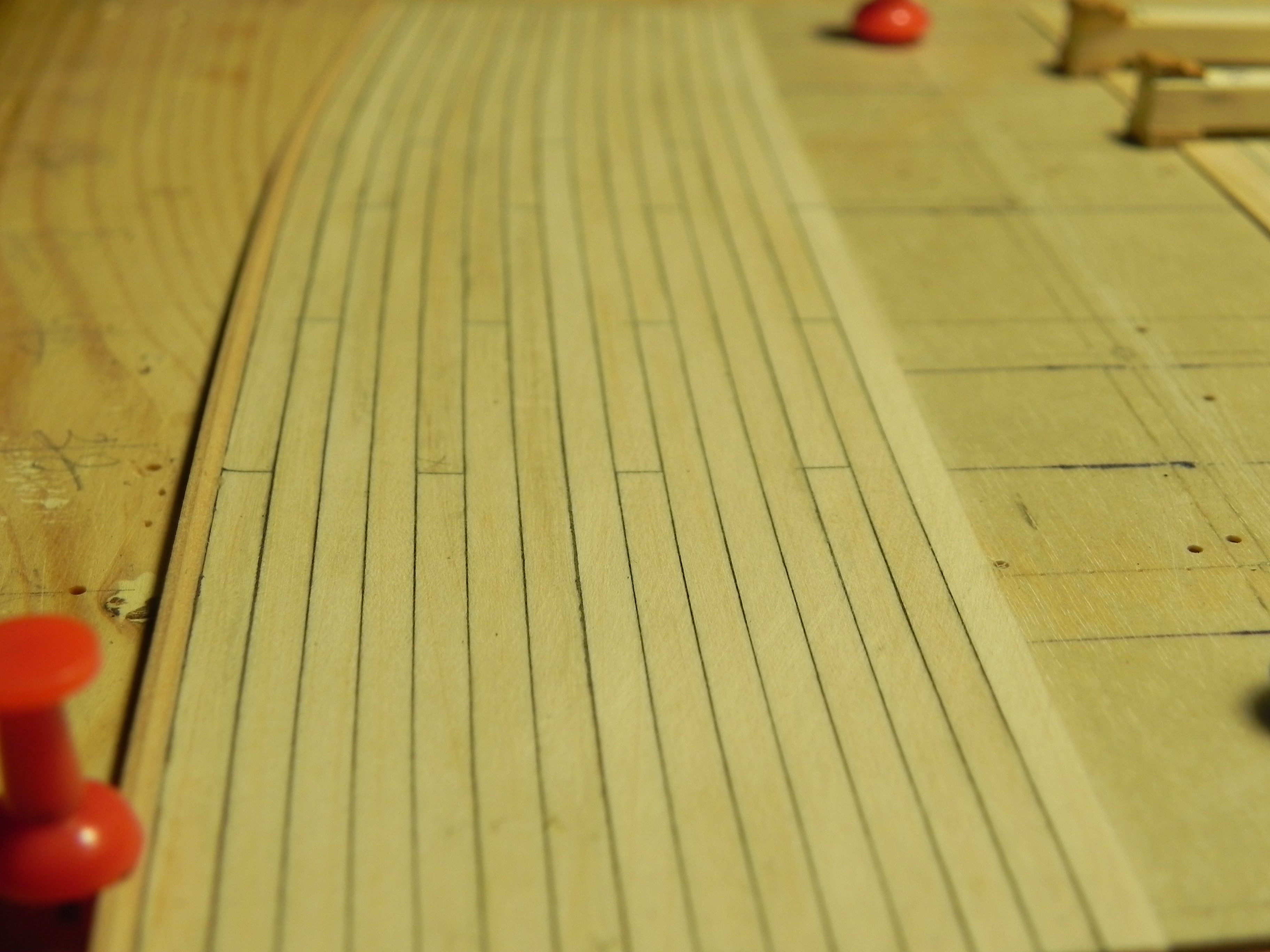 Отлично получилось! То, что доска сужалась, показано на модели самого Томаса Слэйда - то есть, лучше первоисточника и не найти. Не могу не отметить великолепную подгонку - ширина адмиралтейской доски как раз на глаз полторы ширины обычной доски, даже не подумаешь, что ставилась по месту.